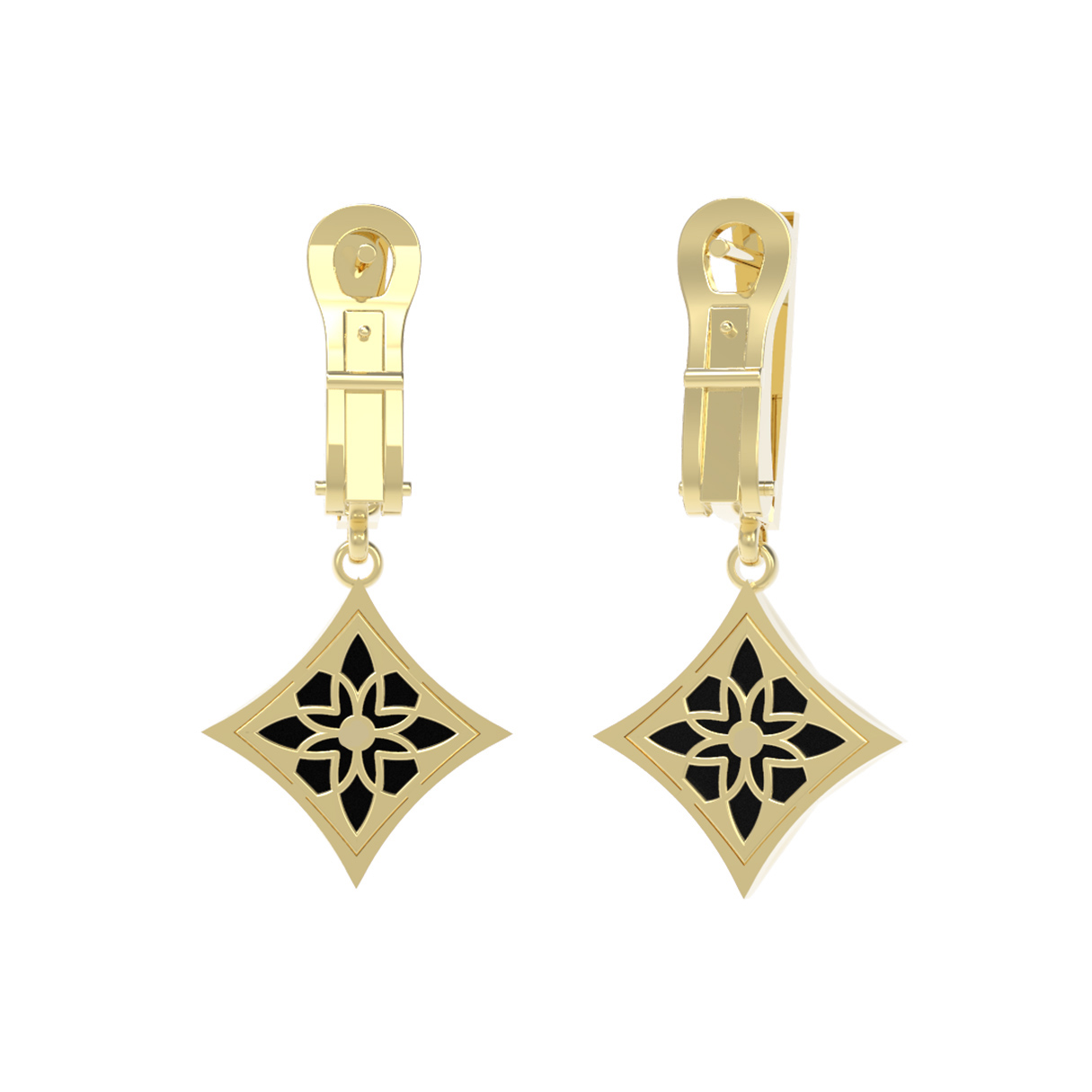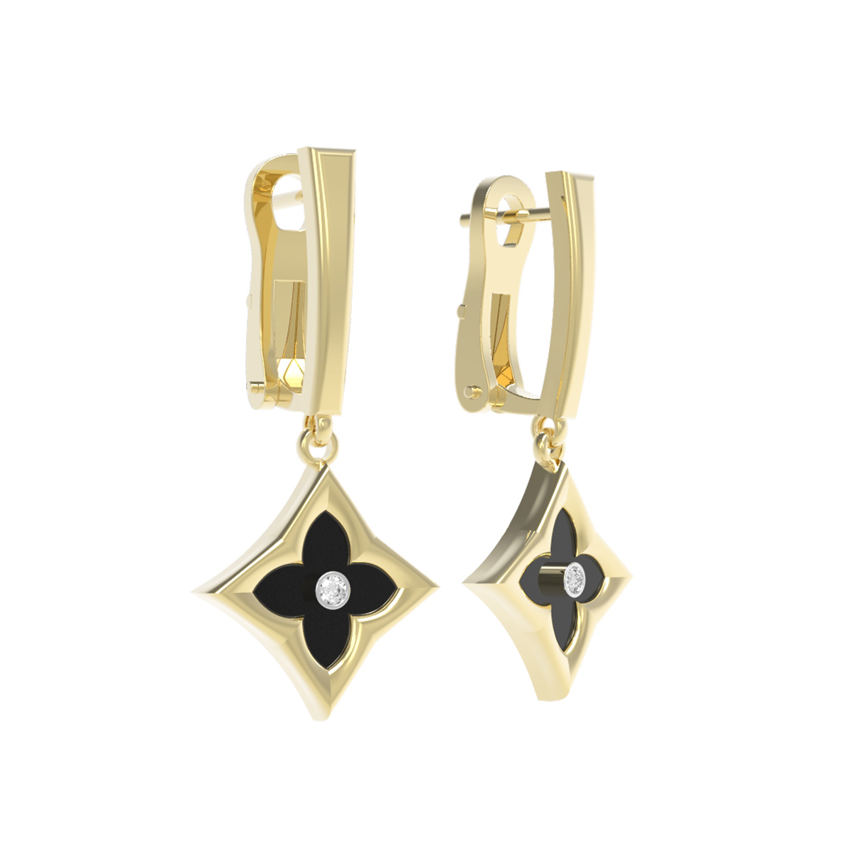 В центре каждого элемента расположен сияющий бриллиант круглой огранки, который эффектно контрастирует с глубоким черным цветом оникса ромбовидной формы. Всего в изделии использованы 4 вставки, создающие выразительную игру света и цвета. Контраст белых бриллиантов и черного оникса в обрамлении лимонного золота делает эти серьги центральным акцентом вашего образа.