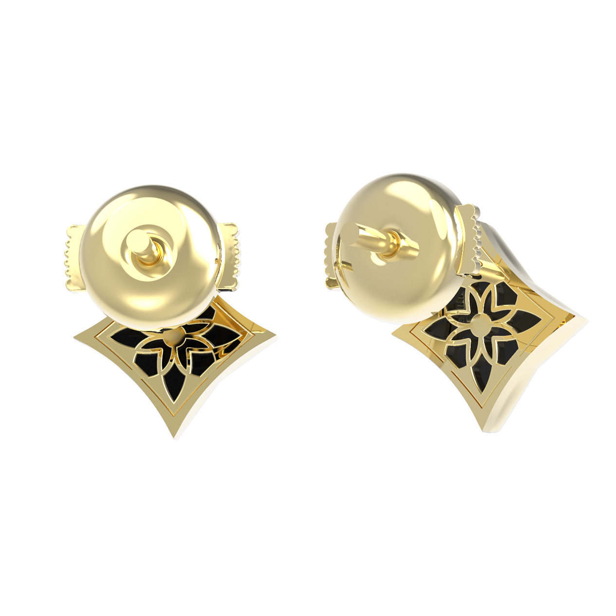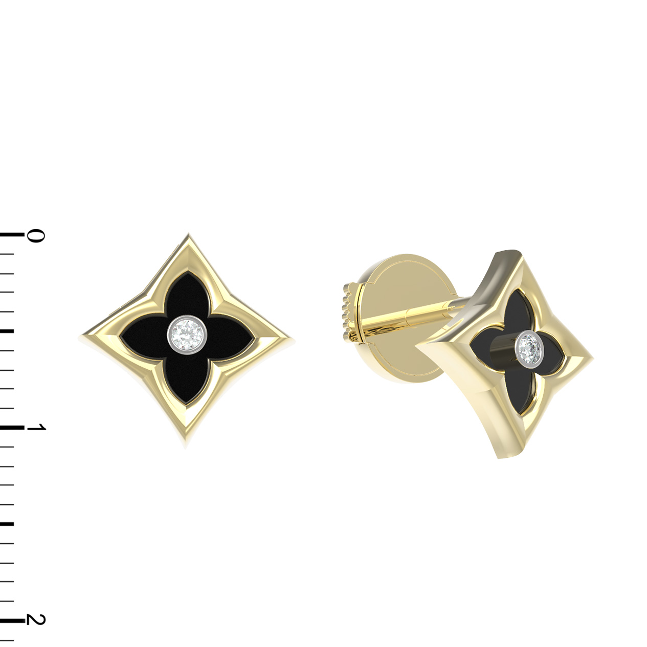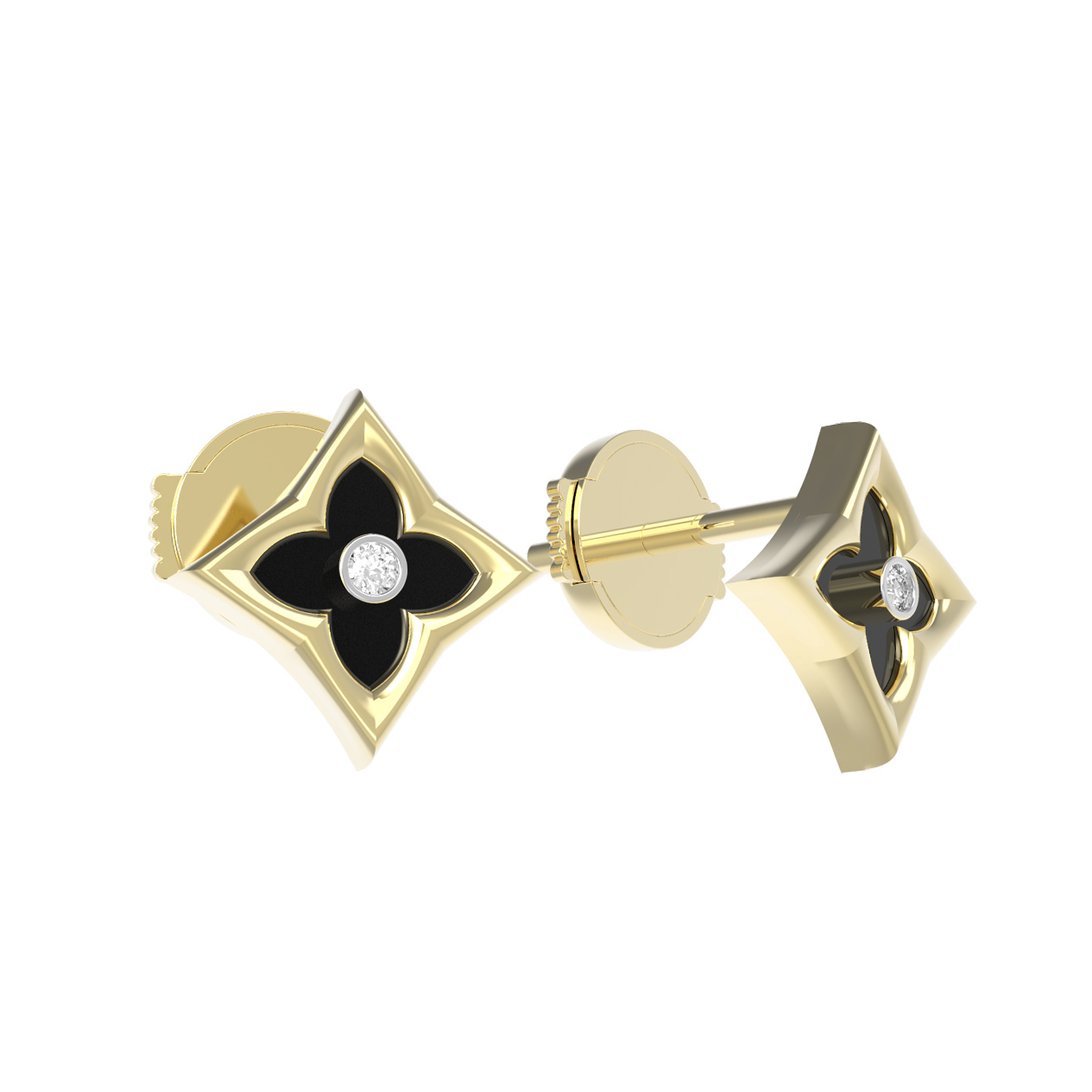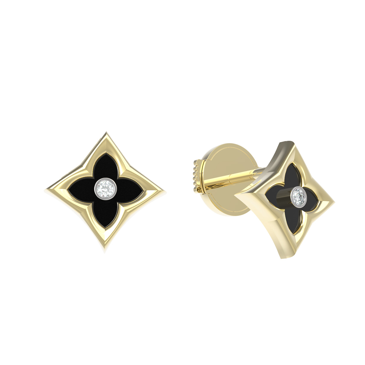 Дизайн украшения вдохновлен классическим образом клевера, который гармонично дополнен вставками геометрической формы: ромб подчеркивает строгость линий, а круглый бриллиант в центре привносит необходимый акцент роскоши. Всего в изделии использованы 4 вставки, создающие завершенную и гармоничную композицию. Сочетание черного и белого цветов вставок делает эти серьги универсальным аксессуаром, который легко адаптируется под любой образ.
