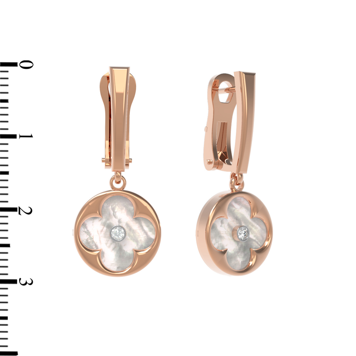В центре композиции каждой серьги расположен сверкающий бриллиант круглой формы, который добавляет аксессуару благородного блеска. Вставка из перламутра белого цвета эффектно подчеркивает глубину и природную красоту камня. Всего в изделии использованы 2 вставки, гармонично дополняющие друг друга.