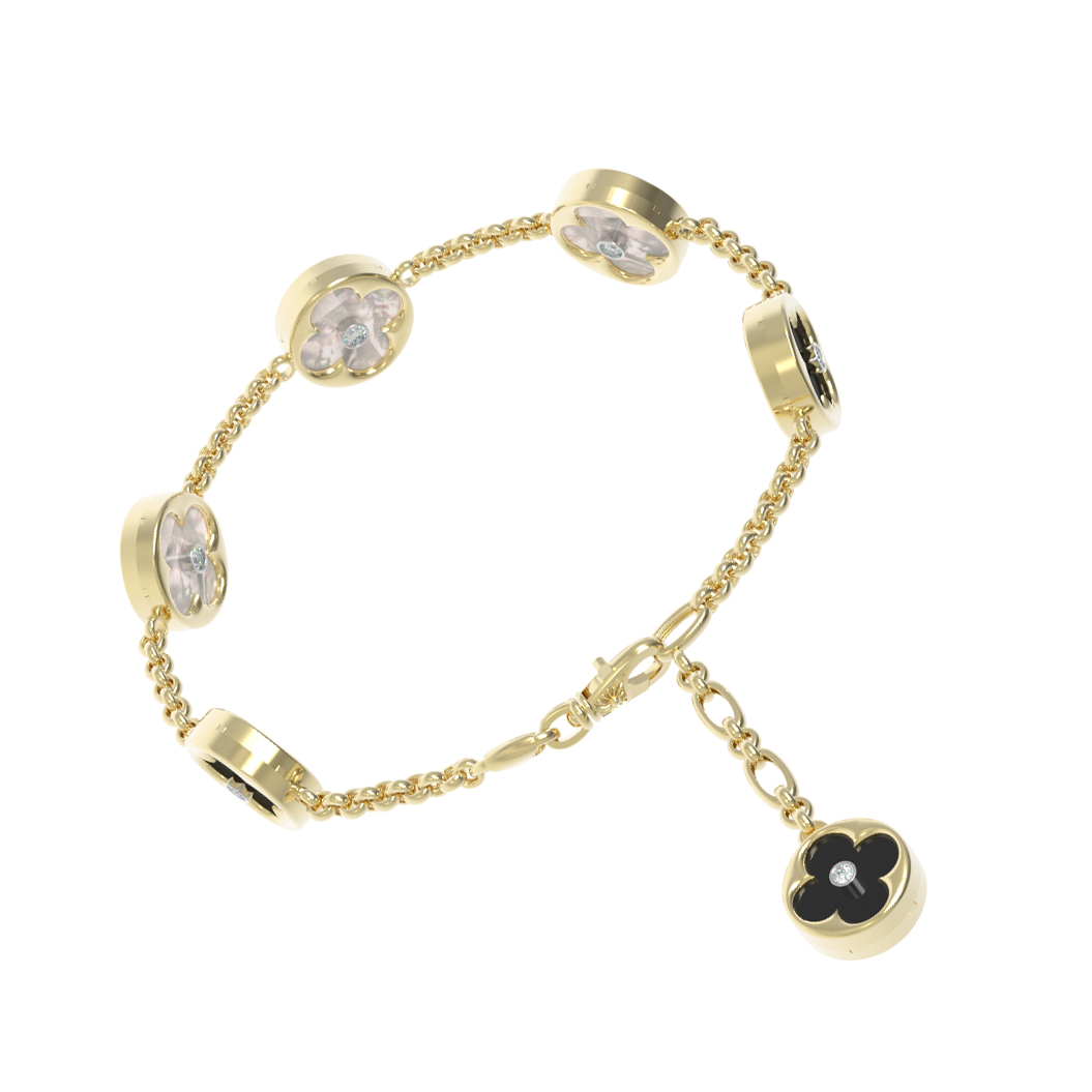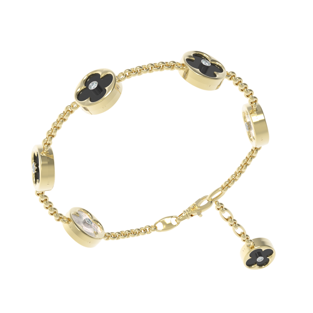 Особую притягательность браслету придает изысканная комбинация материалов. В качестве вставок использованы глубокий черный оникс и нежный перламутр, контраст которых создает завораживающую игру света и цвета. В центре каждого элемента расположен яркий бриллиант круглой формы, добавляющий украшению роскошного блеска. Всего в изделии насчитывается 18 вставок, мастерски закрепленных в звеньях из лимонного золота.