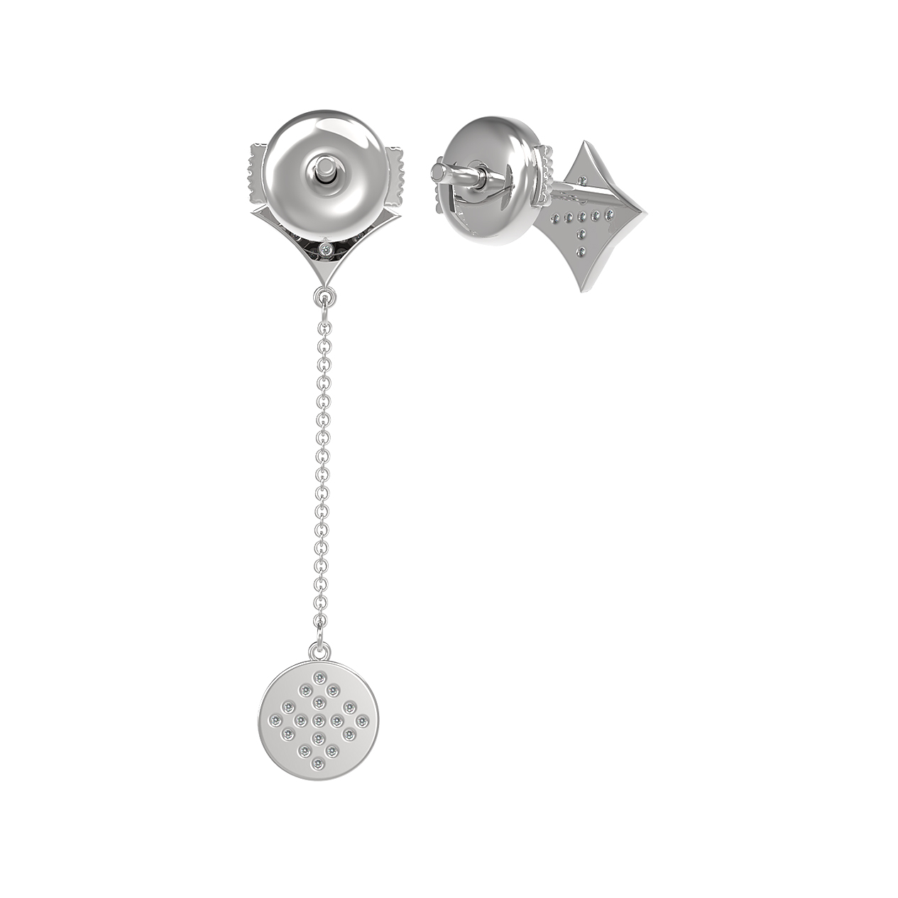 Серьги инкрустированы 35 бриллиантами круглой огранки, которые создают завораживающее сияние. Белый цвет вставок гармонично сочетается с холодным блеском белого золота, придавая образу особую свежесть и элегантность. Длинная подвесная часть на цепочке добавляет динамики и делает аксессуар заметным акцентом в любом наряде.