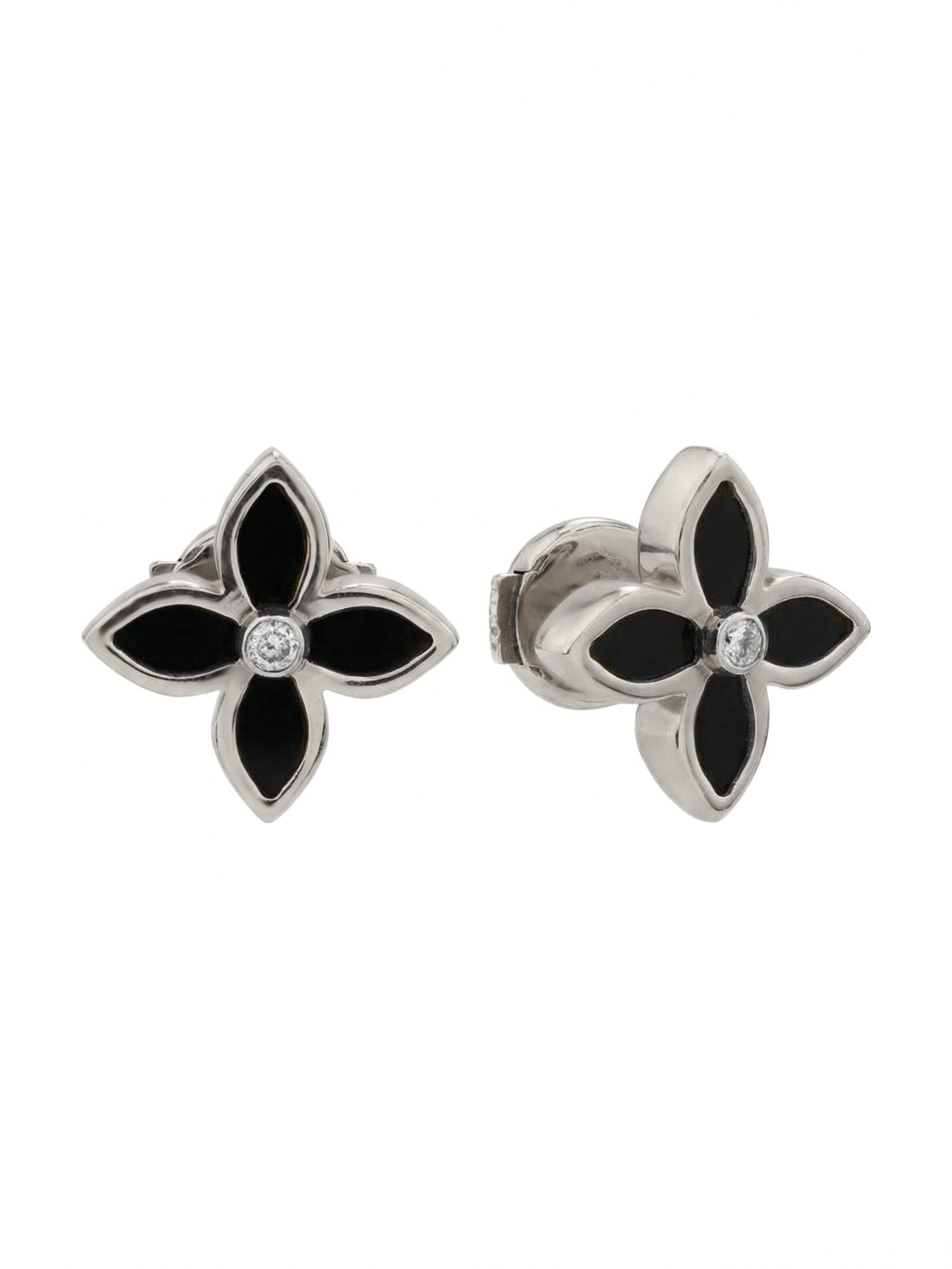 В центре композиции расположен сверкающий бриллиант круглой огранки, который притягивает взгляд своей чистотой и яркостью. Его окружают изысканные лепестки из оникса глубокого черного цвета, образующие узнаваемый силуэт четырехлистника. Контраст между белым цветом металла, прозрачностью камня и насыщенным черным оттенком оникса придает украшению особую выразительность и глубину.