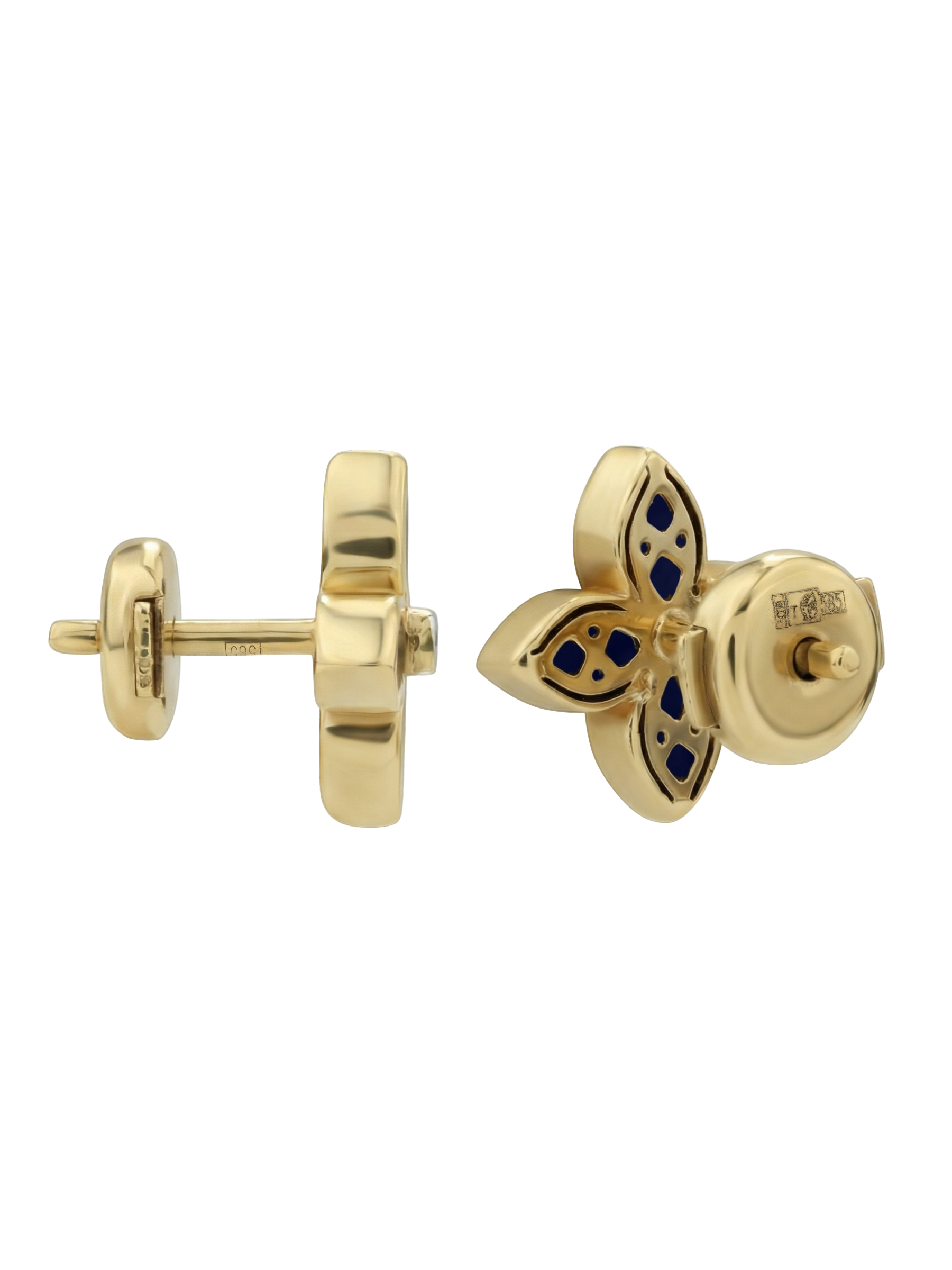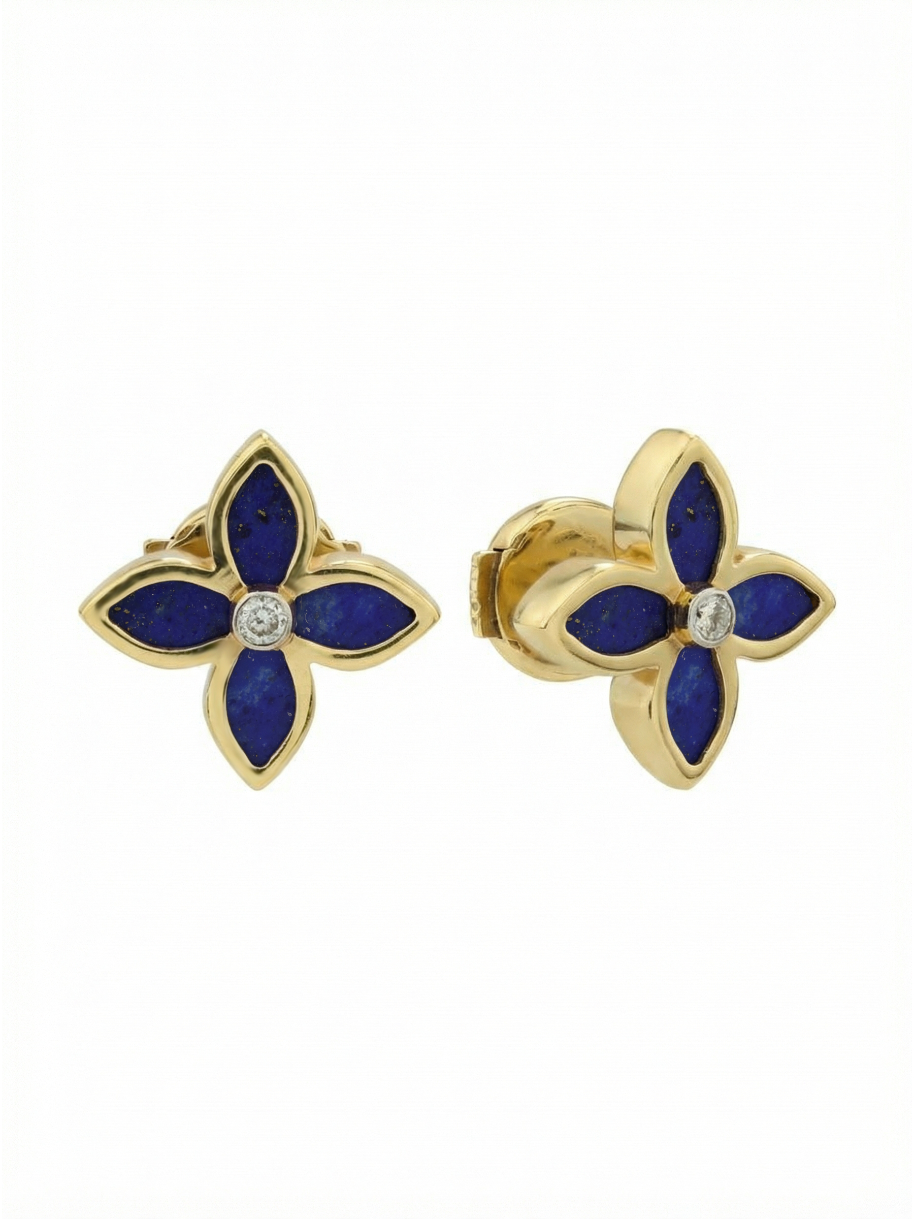 Центральным акцентом композиции выступают два сияющих бриллианта круглой огранки белого цвета, которые окружают лепестки из глубокого синего лазурита. Общее количество вставок составляет четыре, что создает сбалансированный и выразительный образ. Эти серьги — универсальное дополнение ювелирного гардероба, одинаково подходящее как для женщин, так и для мужчин, ценящих премиальные материалы и безупречное исполнение.