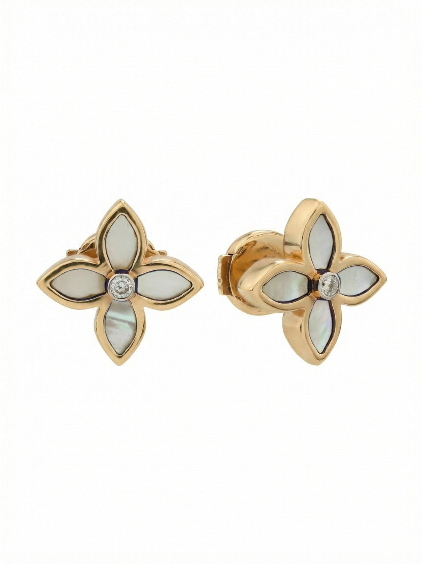 Центральным акцентом композиции стал безупречный бриллиант круглой формы с чистым белым блеском, который притягивает взгляд и подчеркивает роскошь материала. Гармоничным дополнением выступают вставки из натурального перламутра с мягким переливом, создающие нежное сияние. В изделии использовано две вставки, идеально сбалансированные по форме и цветовой гамме: благородный блеск белого бриллианта эффектно контрастирует с деликатным перламутровым оттенком.