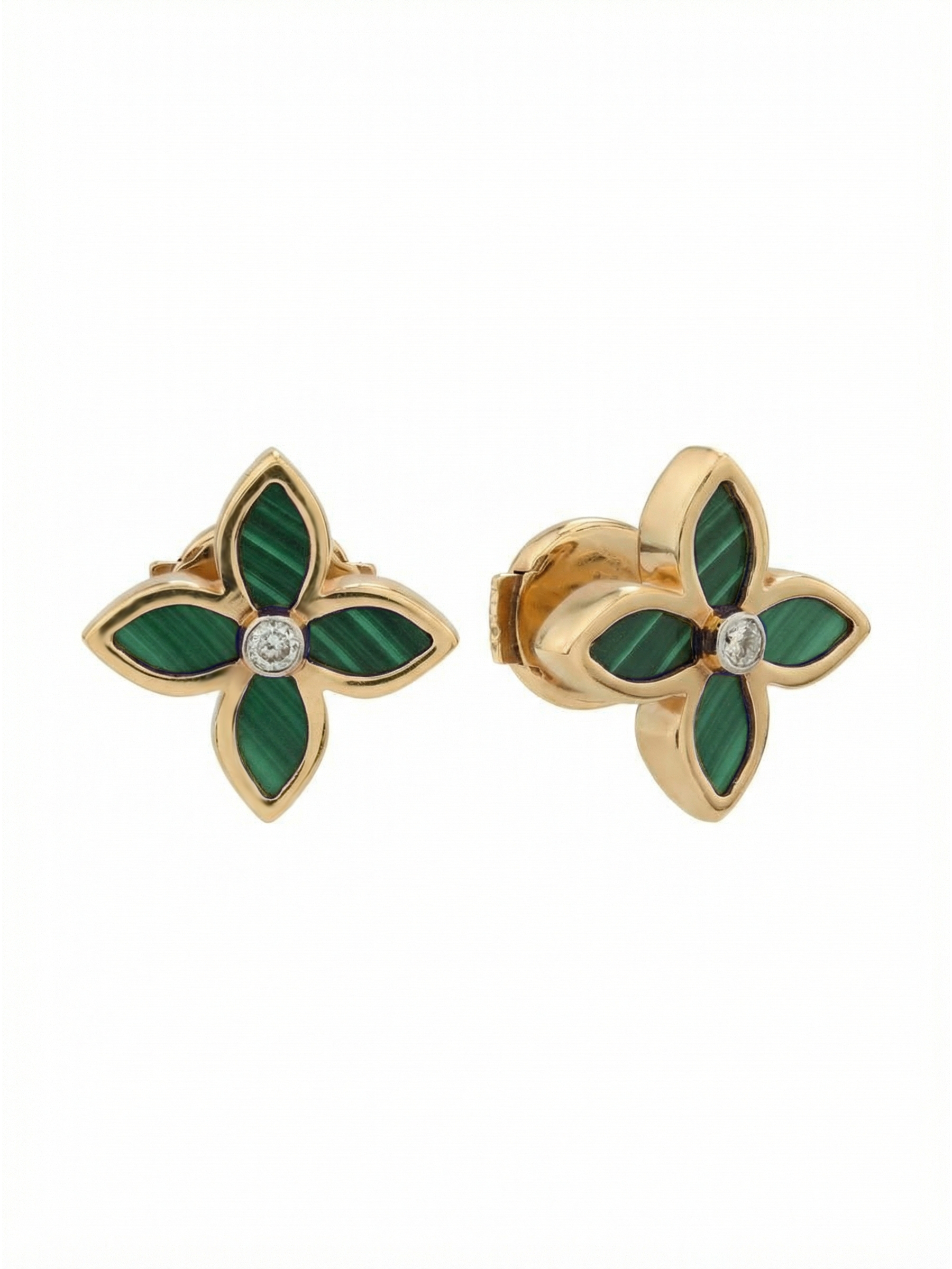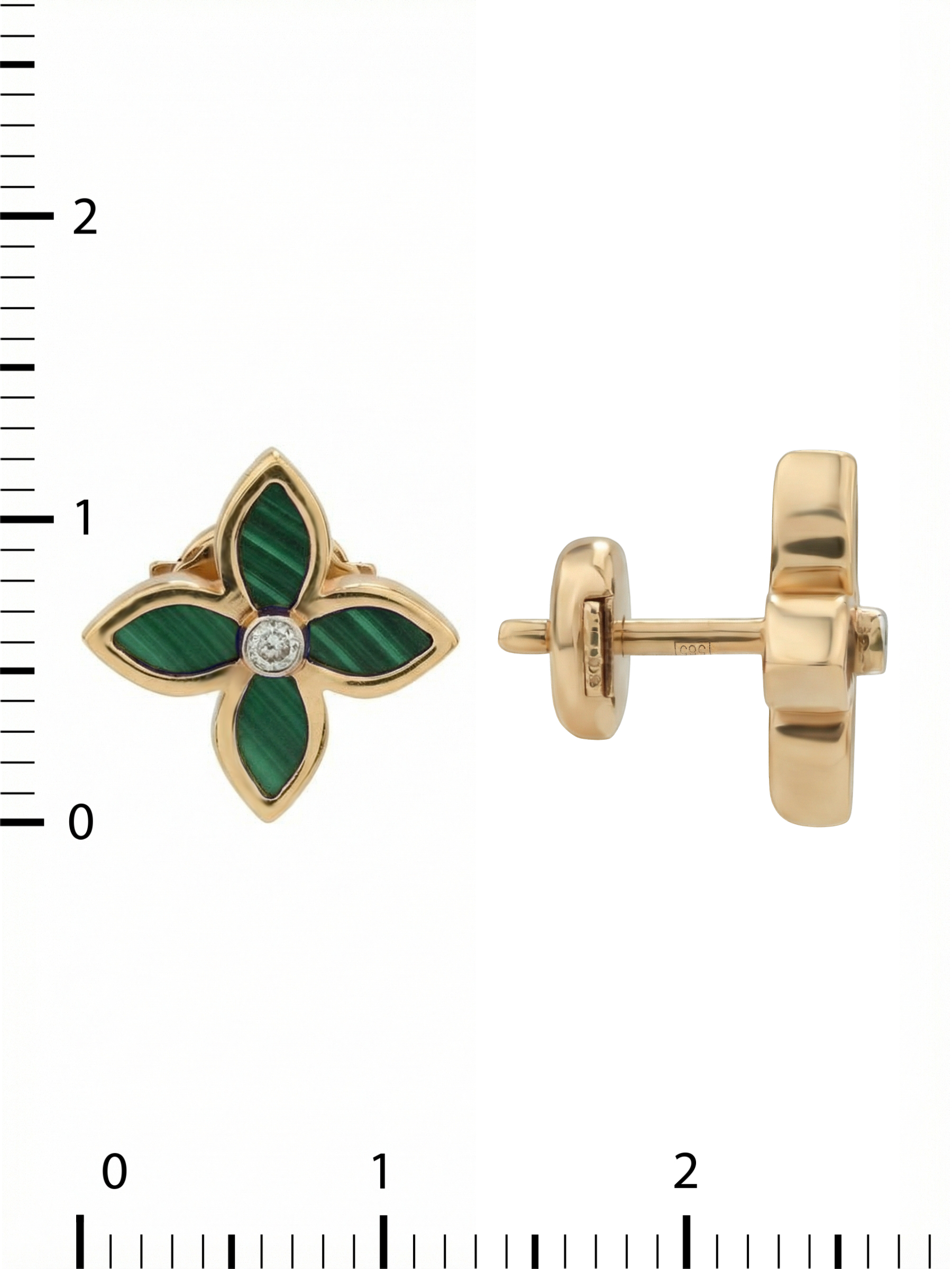 Центральным элементом композиции является вставка круглой формы: сияющий бриллиант белого цвета, окруженный лепестками зеленого малахита. Всего в изделии предусмотрено 4 вставки, которые создают завораживающий контраст между теплотой красного золота и глубиной камня. Дизайн в стиле клевер делает эти серьги универсальным дополнением к любому образу — от строгого делового костюма до вечернего наряда. Лаконичная форма и выверенные линии гарантируют, что украшение станет акцентной деталью, придающей владельцу уверенности и аристократичного шарма.