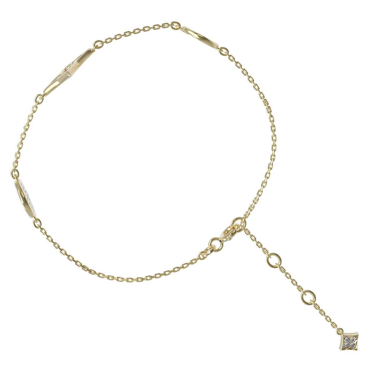 Браслет отличается продуманной геометрией: сочетание тонкой цепи и выразительных декоративных элементов создает акцент на запястье, притягивая взгляды. Ювелирное изделие органично вписывается в комплекты украшений, становясь завершающим штрихом вашего ансамбля. Выбирая этот браслет, вы отдаете предпочтение качеству и вневременному дизайну, который остается актуальным в любой ситуации.