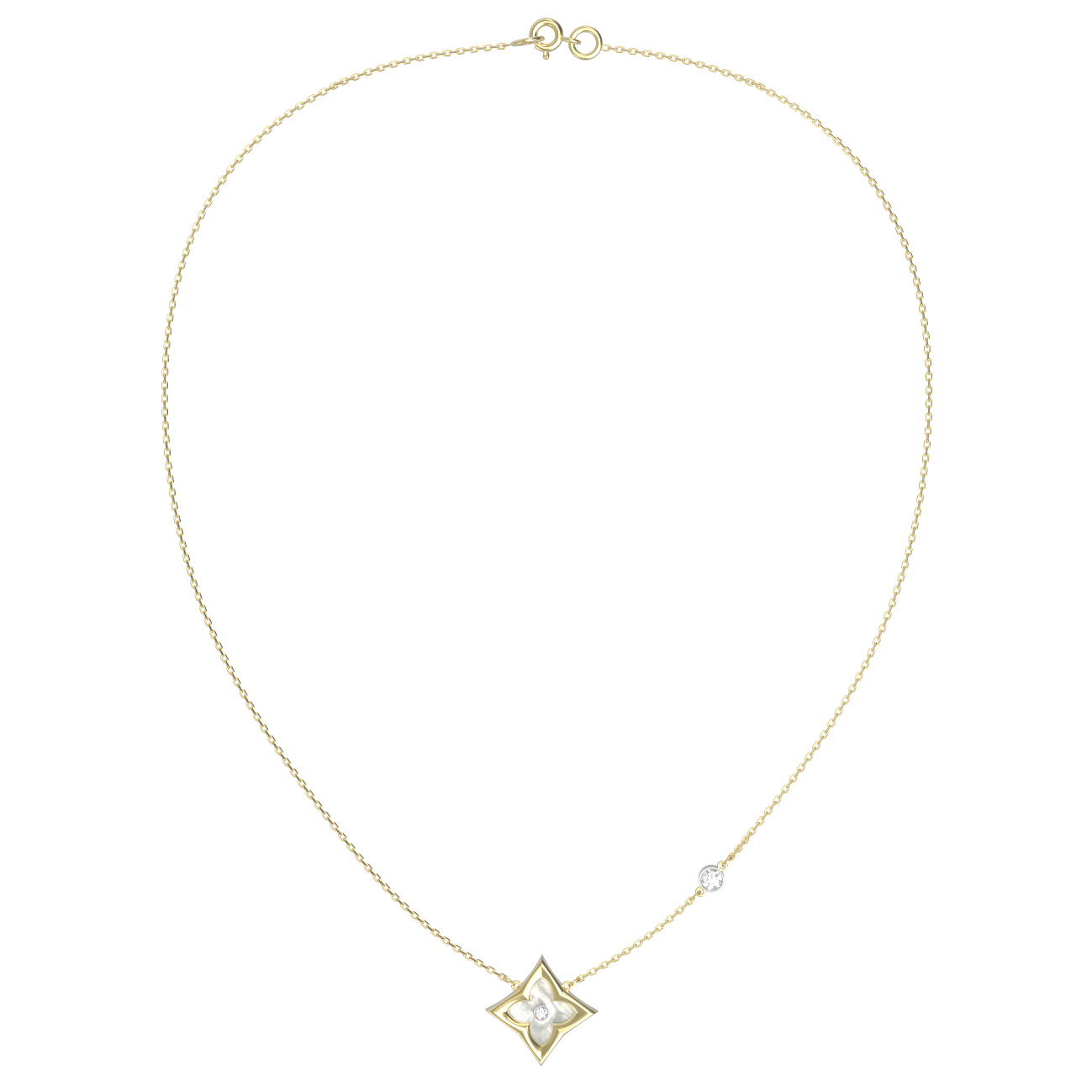 Колье из лимонного золота 585 пробы из коллекции De Luxe — Амальфи — Бриллианты станет безупречным акцентом вашего образа. Это утонченное ювелирное украшение объединяет в себе благородство металла и природную красоту вставок. Центральным элементом композиции является изысканный дизайн в форме клевера, инкрустированный перламутром и сияющим бриллиантом. Гармоничное сочетание лимонного оттенка золота с белым цветом вставок создает притягательный контраст, который подчеркивает статус владельца.