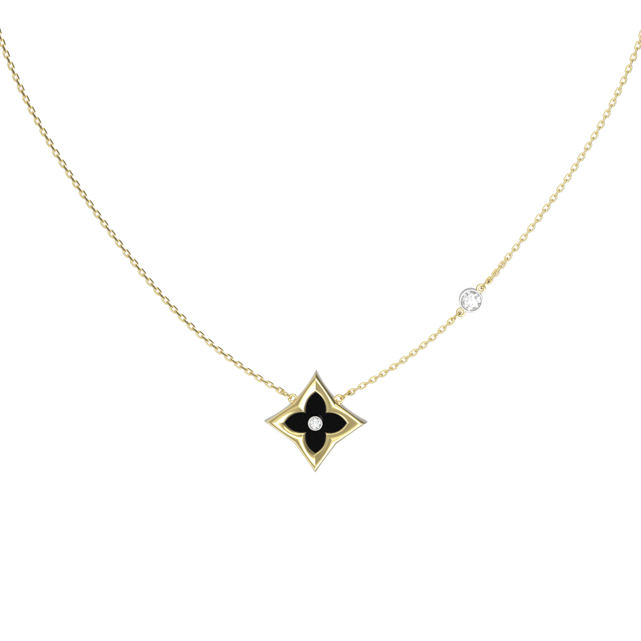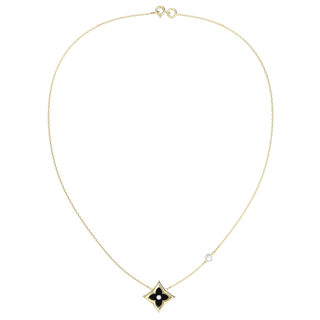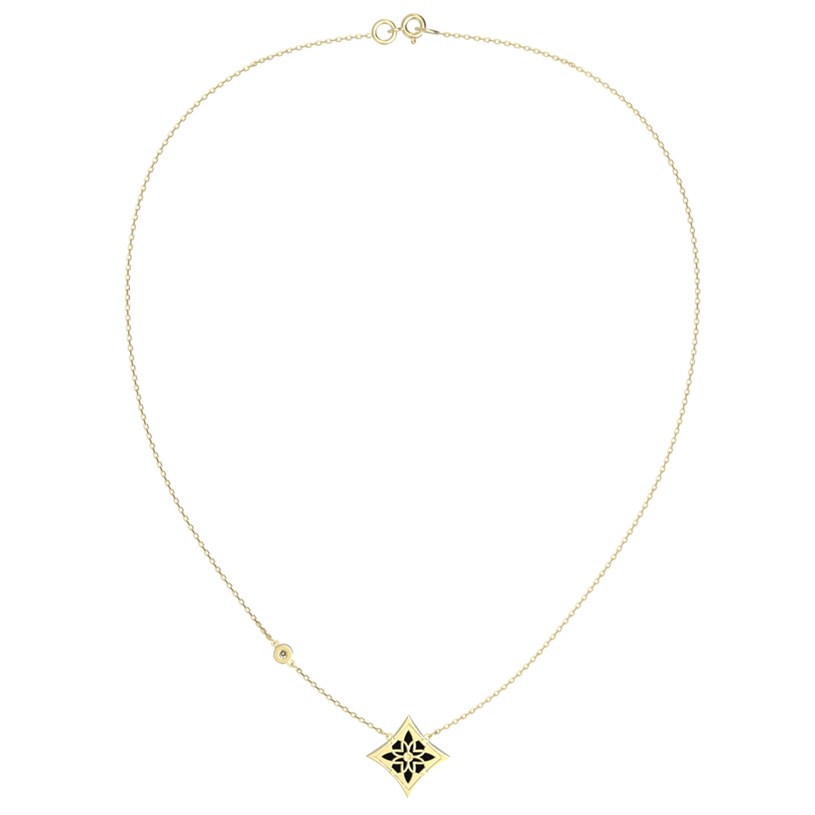Элегантное колье из лимонного золота 585 пробы из коллекции De Luxe — Амальфи — Бриллианты станет безупречным акцентом в вашем образе. Дизайн украшения, выполненный в форме изящного клевера, воплощает в себе лаконичность и благородство. Центром композиции выступает глубокий черный оникс ромбовидной формы, который гармонично дополняет сияющий белый бриллиант круглой огранки. В сочетании с теплыми оттенками лимонного золота, это украшение выглядит по-настоящему стильно и выразительно.