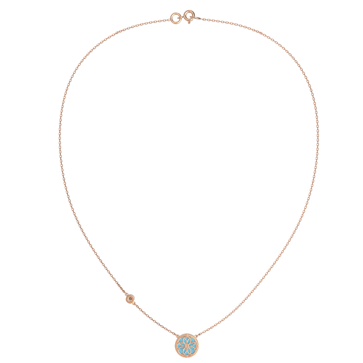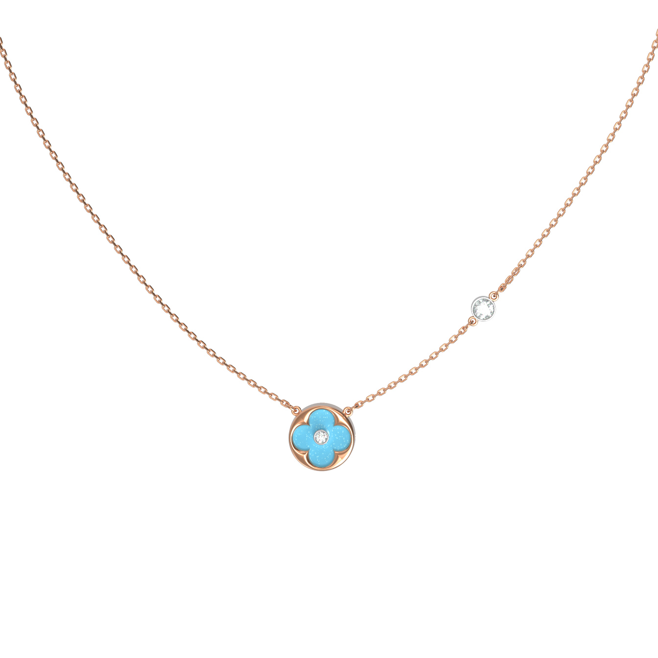 В центре композиции расположена бирюза небесно-голубого цвета, эффектно дополненная сияющим бриллиантом. Общее количество вставок составляет 6 штук, среди которых представлены как круглые бриллианты белого цвета, так и выразительные вставки бирюзового оттенка. Такое сочетание материалов придает колье особую эстетику и глубину.