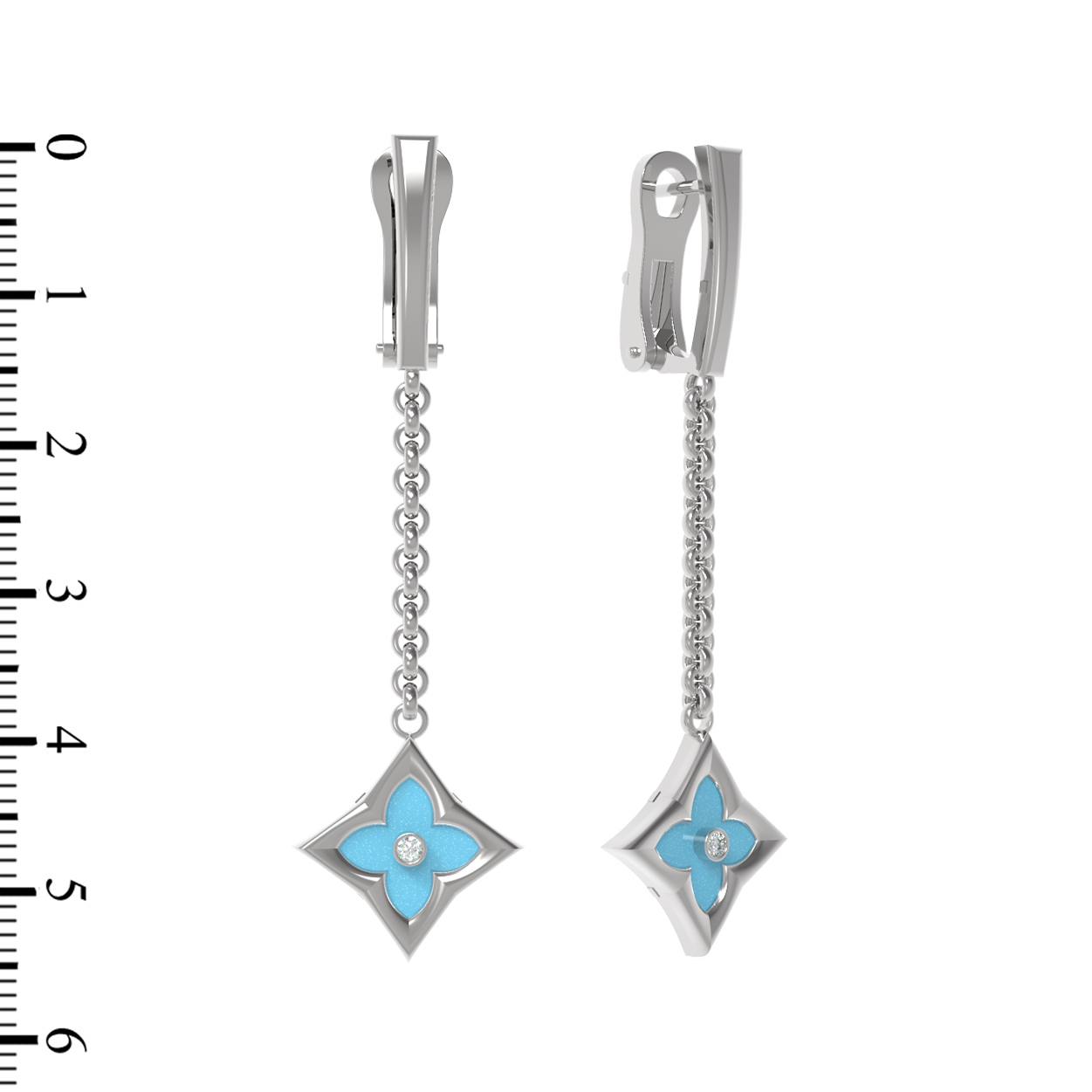 Особое внимание привлекает сочетание вставок: насыщенный бирюзовый цвет камней в форме ромба идеально дополняется сиянием бриллиантов круглой огранки. Всего в украшении использованы 4 вставки, которые создают неповторимую игру света и цвета. Холодный блеск белого золота подчеркивает чистоту белых бриллиантов и глубину небесного оттенка бирюзы. Такие серьги универсальны — они прекрасно подойдут как для женщин, так и для мужчин, предпочитающих изящные и стильные аксессуары.