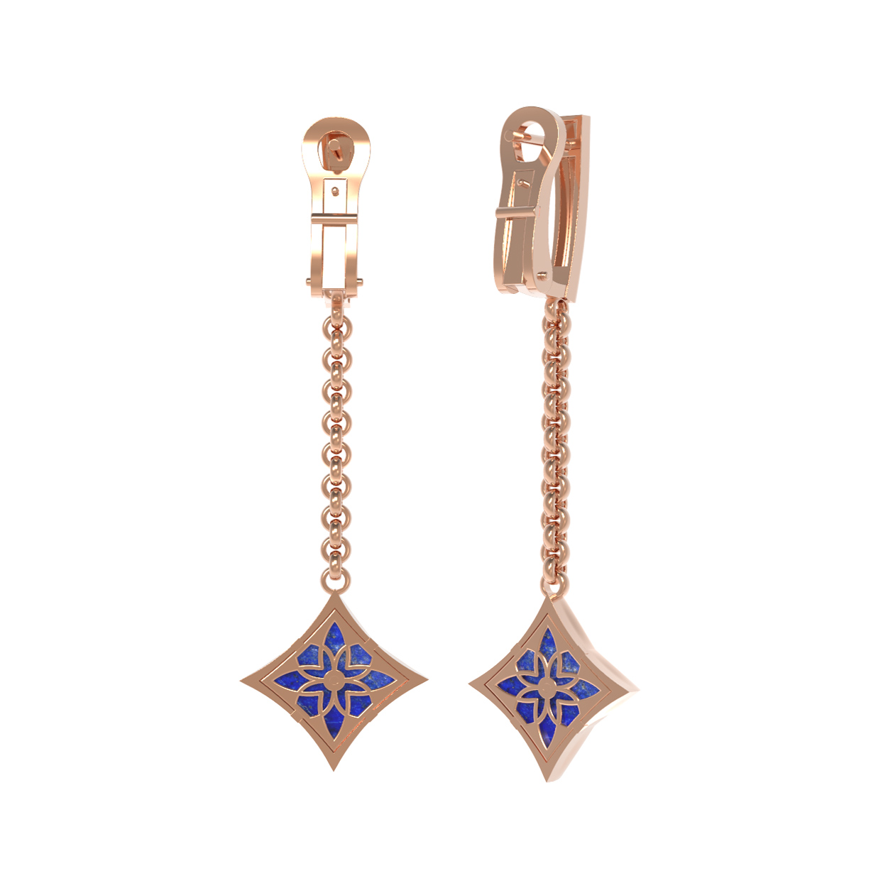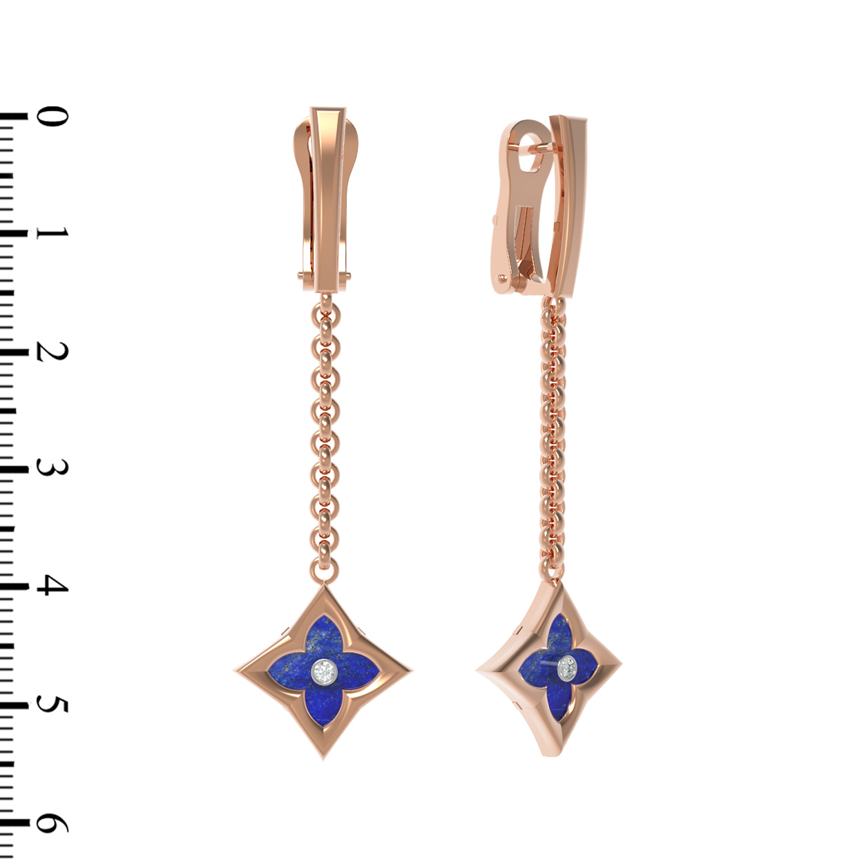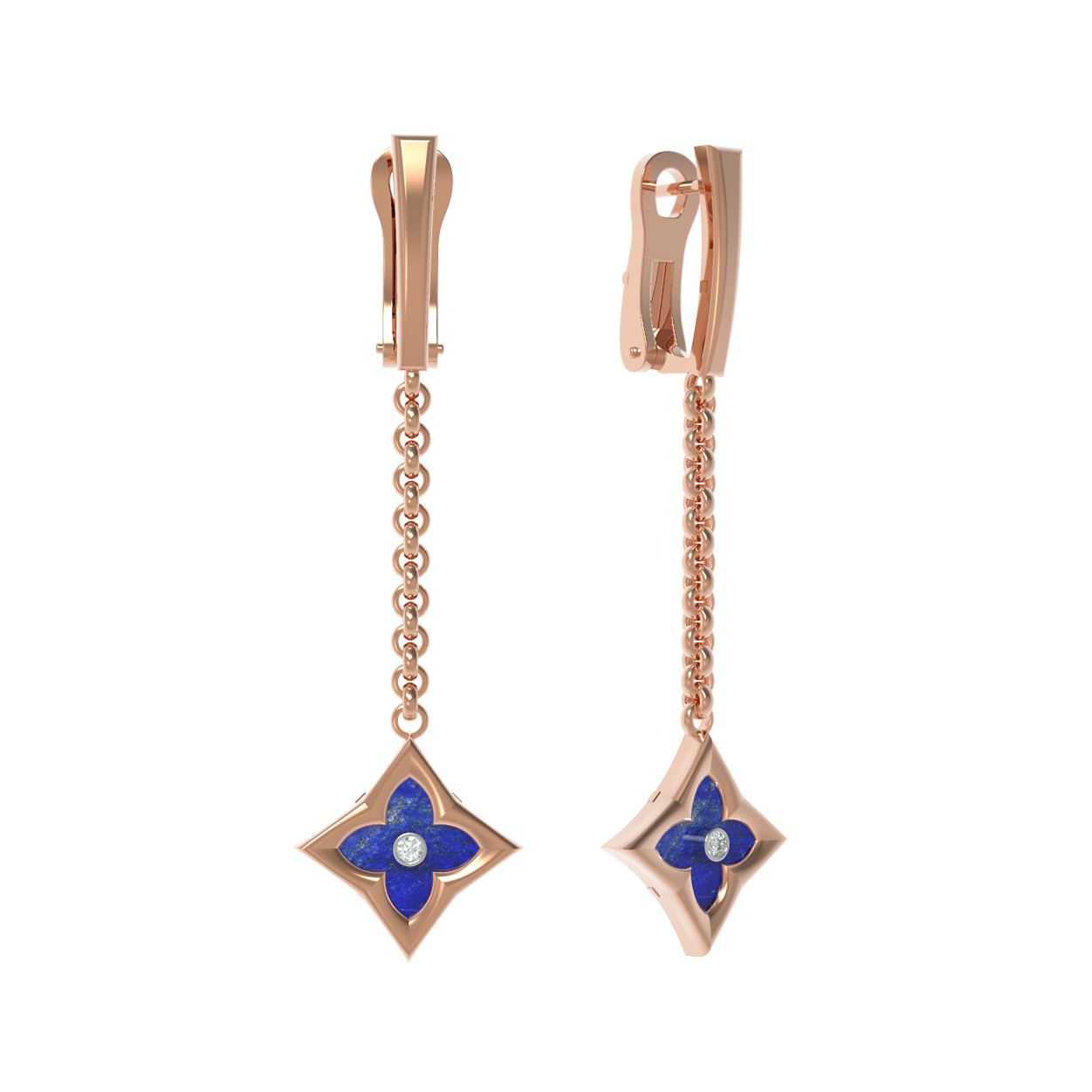 Центральным элементом композиции является вставка в форме ромба, внутри которой гармонично расположился глубокий синий лазурит. Контрастный тандем дополняет яркий белый бриллиант круглой огранки, который играет бликами света при любом освещении. Всего в изделии использованы 4 вставки, создающие завершенный и выразительный облик. Красное золото придает украшению теплое сияние, которое идеально сочетается с холодным блеском камней.