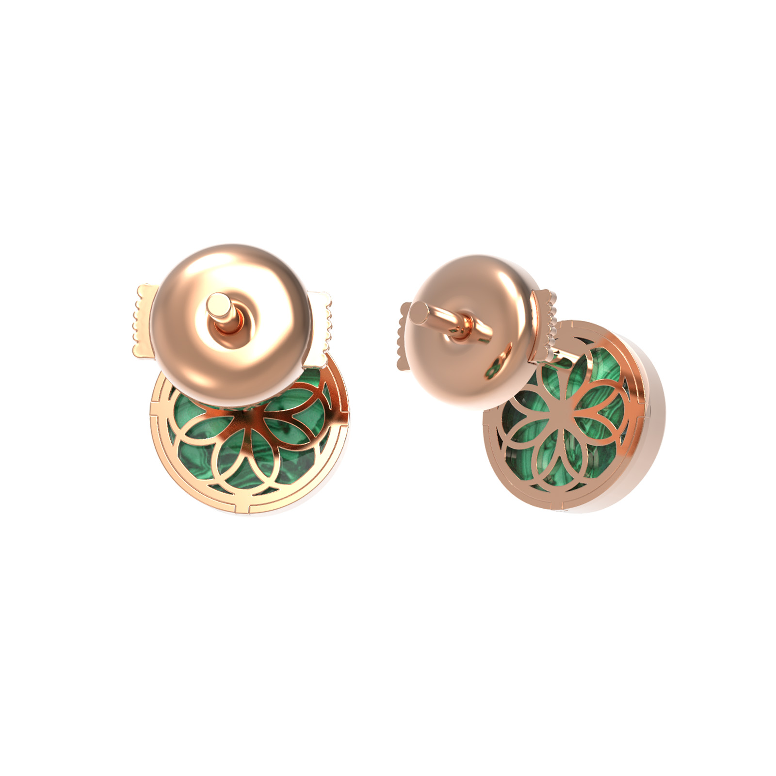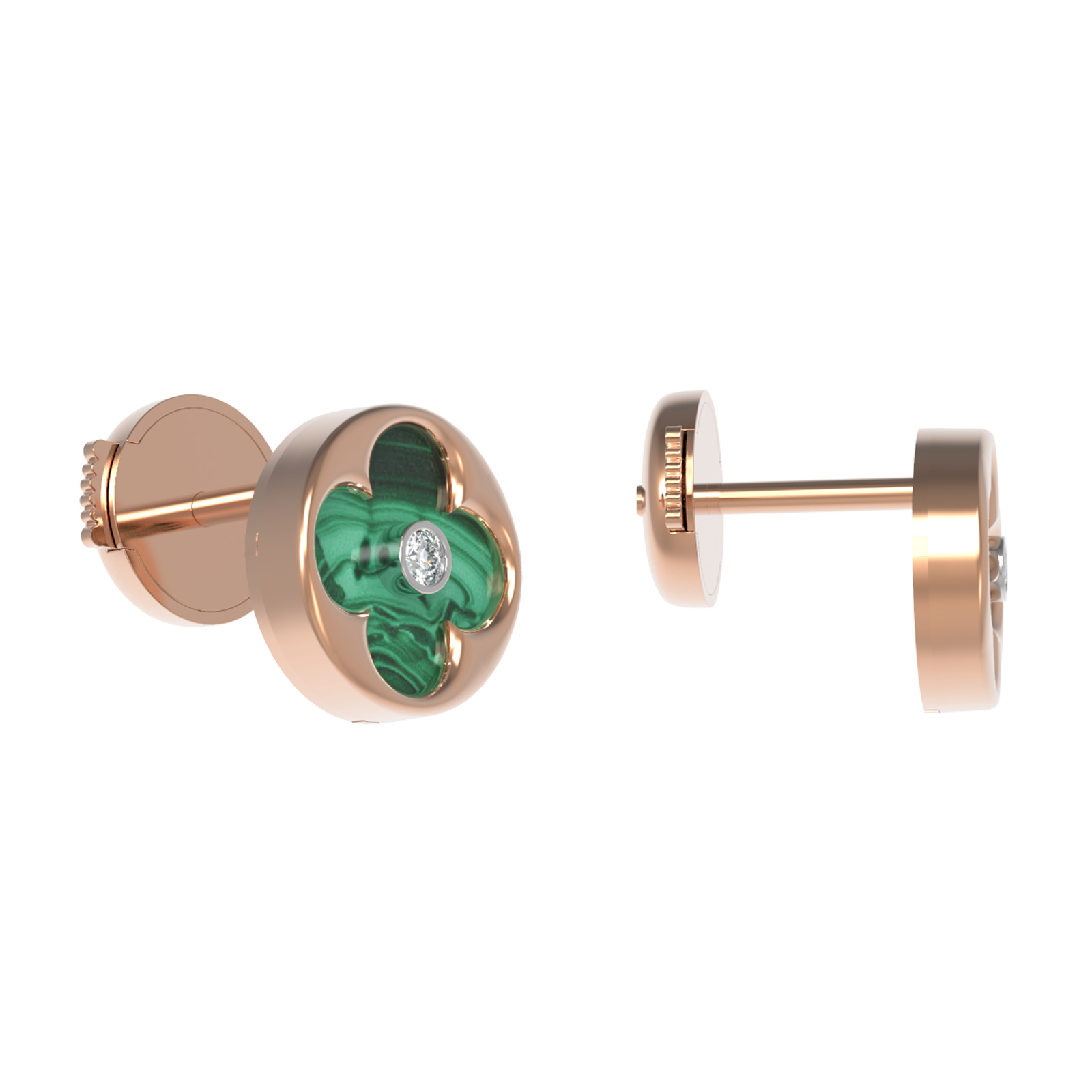 В центре композиции расположен насыщенный зеленый малахит, чей уникальный природный рисунок эффектно контрастирует с теплым блеском красного золота. Вставки круглой формы подчеркнуты сиянием белых бриллиантов, расположенных в самом сердце каждого клевера. Общее количество вставок составляет 4 штуки, что создает сбалансированный и выразительный образ.