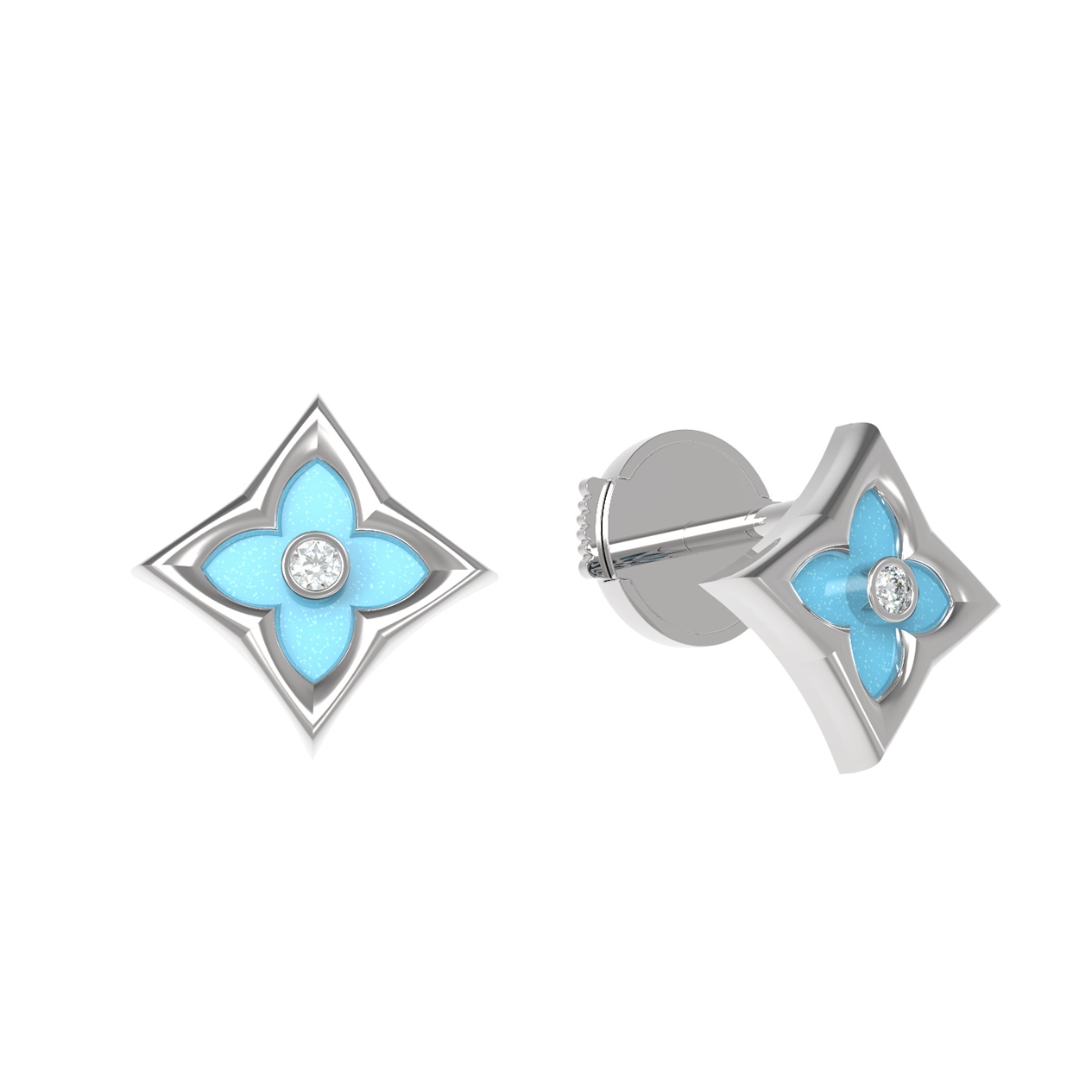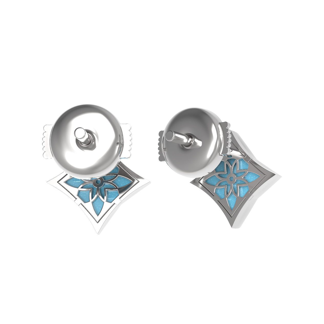 Дизайн изделия вдохновлен символикой клевера, что придает украшению особую эстетику. Центральным акцентом композиции стали вставки из яркой бирюзы бирюзового цвета, выполненные в форме ромба, которые деликатно дополняют сияющие бриллианты круглой формы. Контрастное сочетание белых бриллиантов и насыщенного цвета бирюзы создает запоминающийся образ, притягивающий восхищенные взгляды.