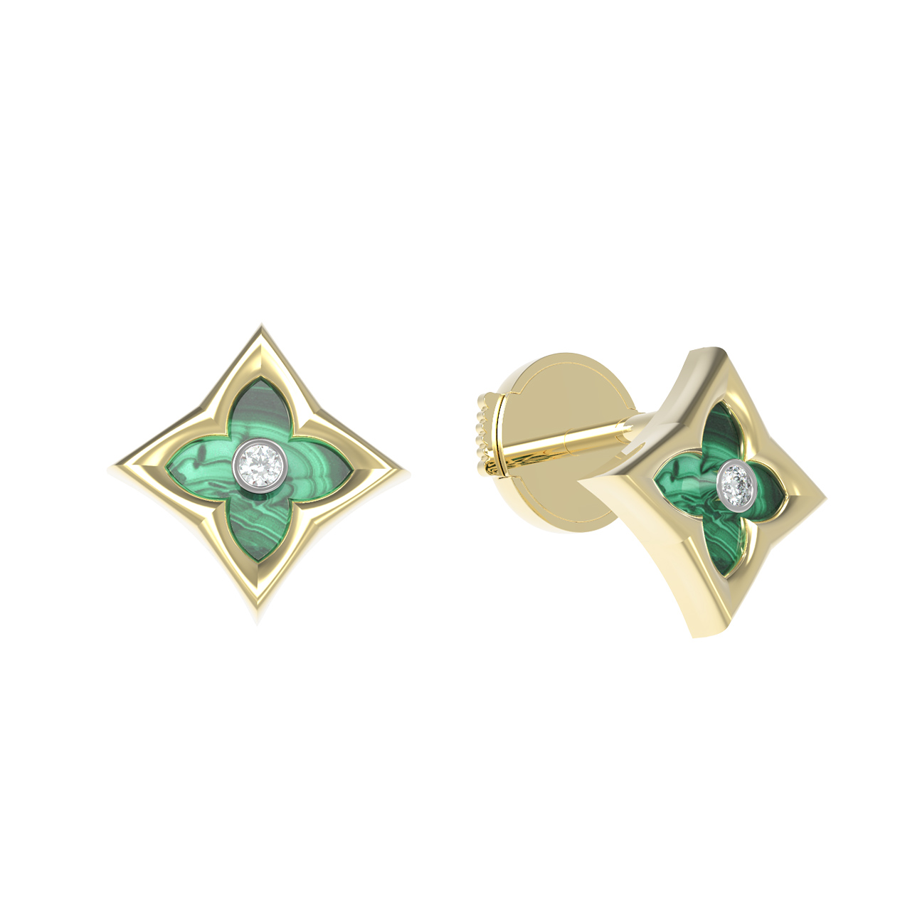 В центре композиции расположен яркий зеленый малахит, ограненный в форме ромба, что создает неповторимый цветовой акцент. Изысканность дизайна дополнена сиянием белых бриллиантов круглой формы, которые мягко обрамляют природный камень. Всего в изделии использованы 4 вставки, гармонично дополняющие друг друга. Эти серьги созданы для тех, кто ценит эстетику и качество: они подойдут как для женщин, так и для мужчин, добавляя любому стилю ноту роскоши. Данное изделие прекрасно сочетается с другими украшениями, что позволяет легко составлять элегантные комплекты для любого повода.