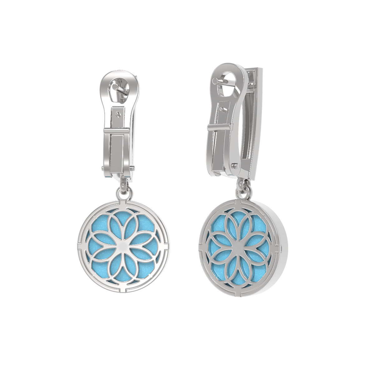 В дизайне каждой серьги использованы вставки круглой формы, всего в комплекте 4 драгоценных камня. Яркий бирюзовый оттенок вставок гармонично дополняется холодным блеском белого металла, создавая притягательный визуальный эффект. Качественная проработка деталей и лаконичная геометрия делают эти серьги универсальным аксессуаром, который подойдет как для женщин, так и для мужчин, предпочитающих подчеркнуть свою индивидуальность качественными ювелирными изделиями.