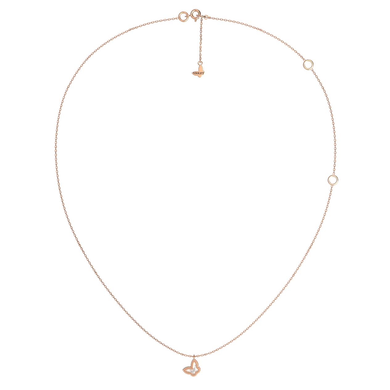 Элегантное колье из красного золота 585 пробы станет утонченным дополнением вашего образа. Это украшение из коллекции De Luxe — Бабочки привлекает внимание своим лаконичным и изящным дизайном, центральным элементом которого является декоративная вставка в форме бабочки. Нежный перламутр, обладающий естественным мягким сиянием, гармонично сочетается с теплым оттенком красного золота, создавая сбалансированное и стильное изделие.