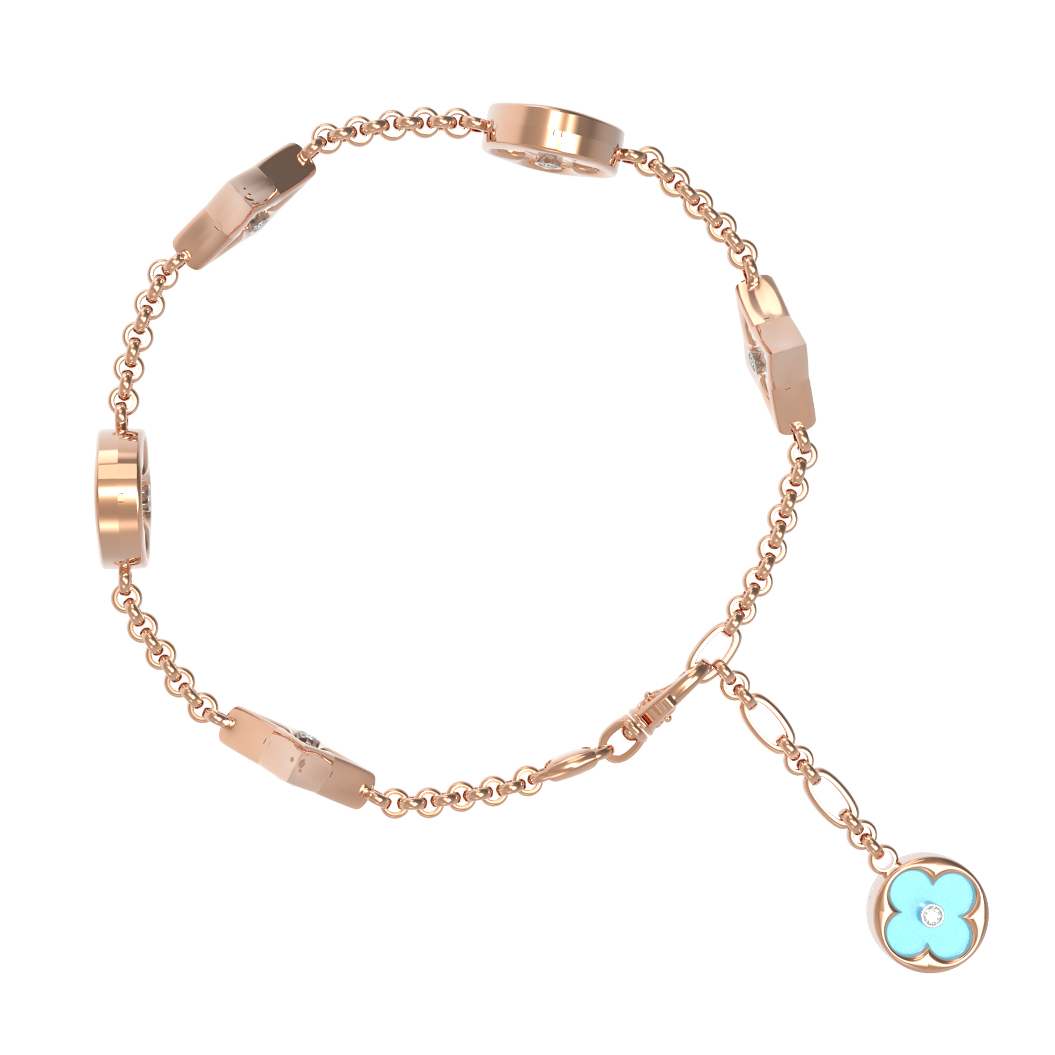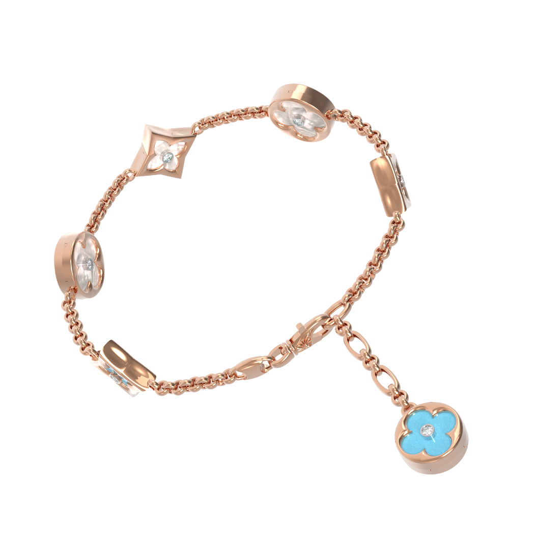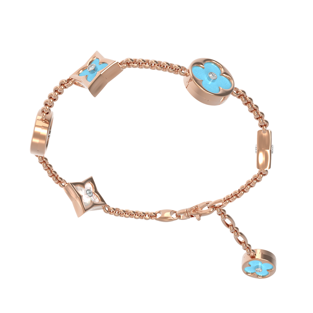 В центре композиции — 18 вставок, искусно сочетающих природную красоту бирюзы бирюзового цвета и нежное сияние перламутра. Дополняют этот ансамбль искрящиеся бриллианты белого цвета, которые придают украшению роскошный вид. Вставки различной геометрической формы — круг и ромб — создают динамичный и современный облик, подчеркивая безупречное мастерство исполнения.