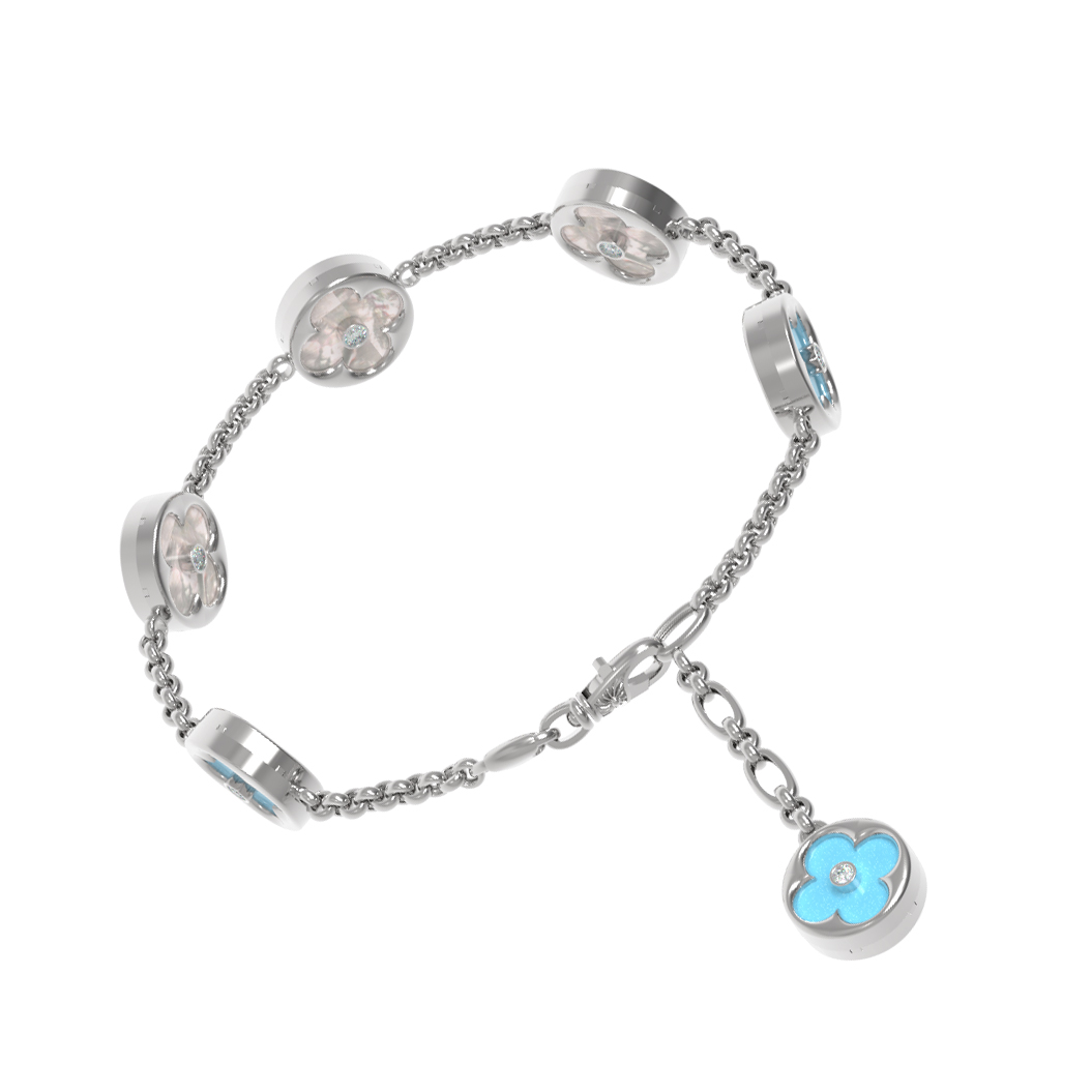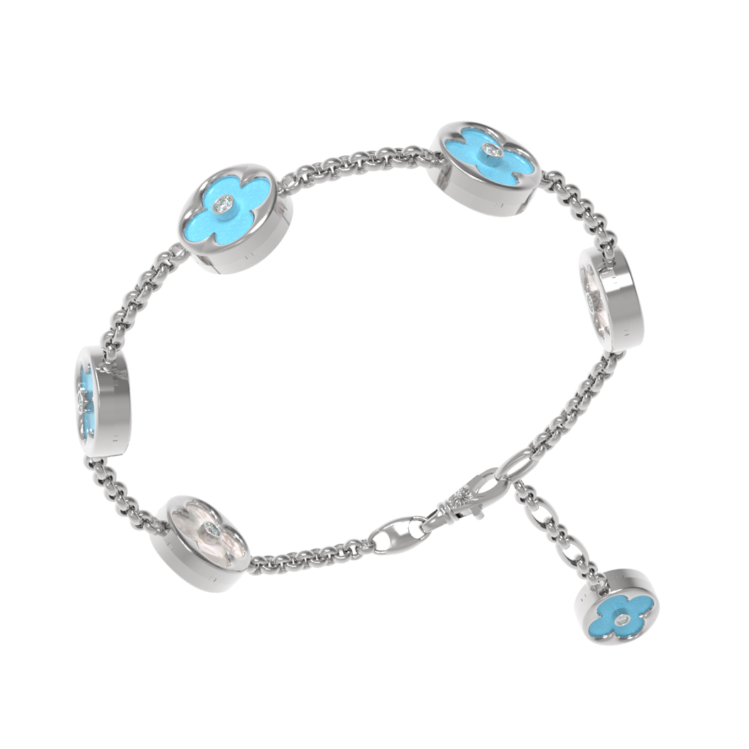 В оформлении модели использовано 18 вставок круглой формы, создающих чарующую игру света и цвета. Роскошная комбинация яркой бирюзы, нежного перламутра и классических бриллиантов превращает этот браслет в настоящее произведение искусства. Белоснежный блеск металла идеально гармонирует с белыми бриллиантами, небесно-бирюзовыми оттенками и мягким перламутровым сиянием вставок.