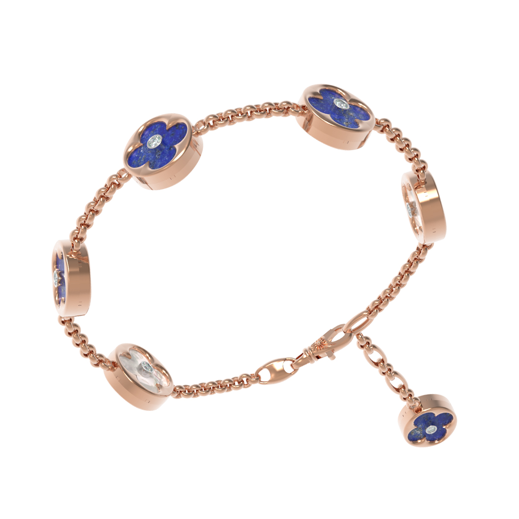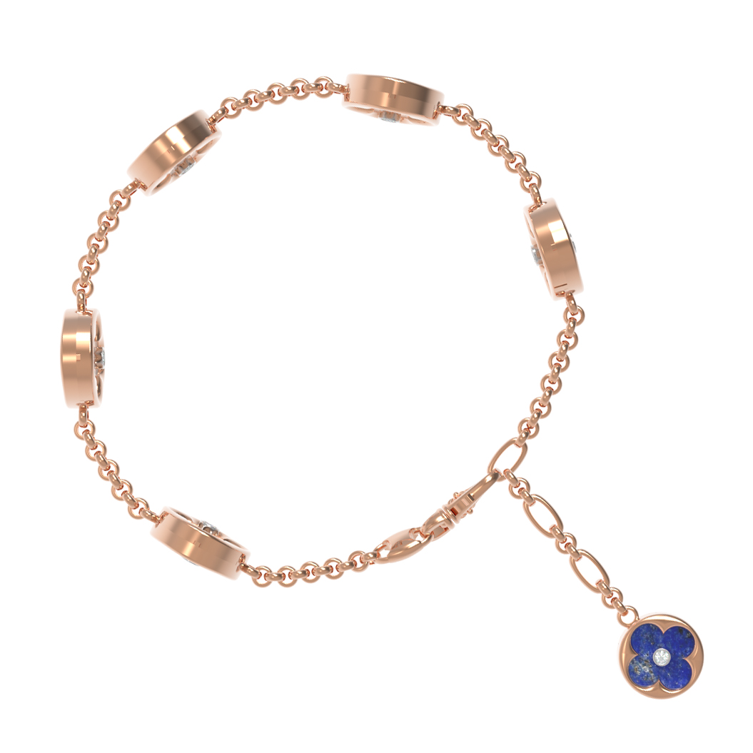 Откройте для себя воплощение элегантности и утонченного стиля с браслетом из коллекции De Luxe — Амальфи — Бриллианты. Это изысканное ювелирное изделие выполнено из красного золота 585 пробы, которое своим теплым оттенком подчеркивает благородство дизайна в форме клевера. Центральным элементом украшения стали вставки из лазурита синего цвета и перламутра, создающие гармоничный контраст с белыми вставками. Общее количество вставок составляет 18 штук, каждая из которых имеет круглую форму и дополнена сияющим бриллиантом.