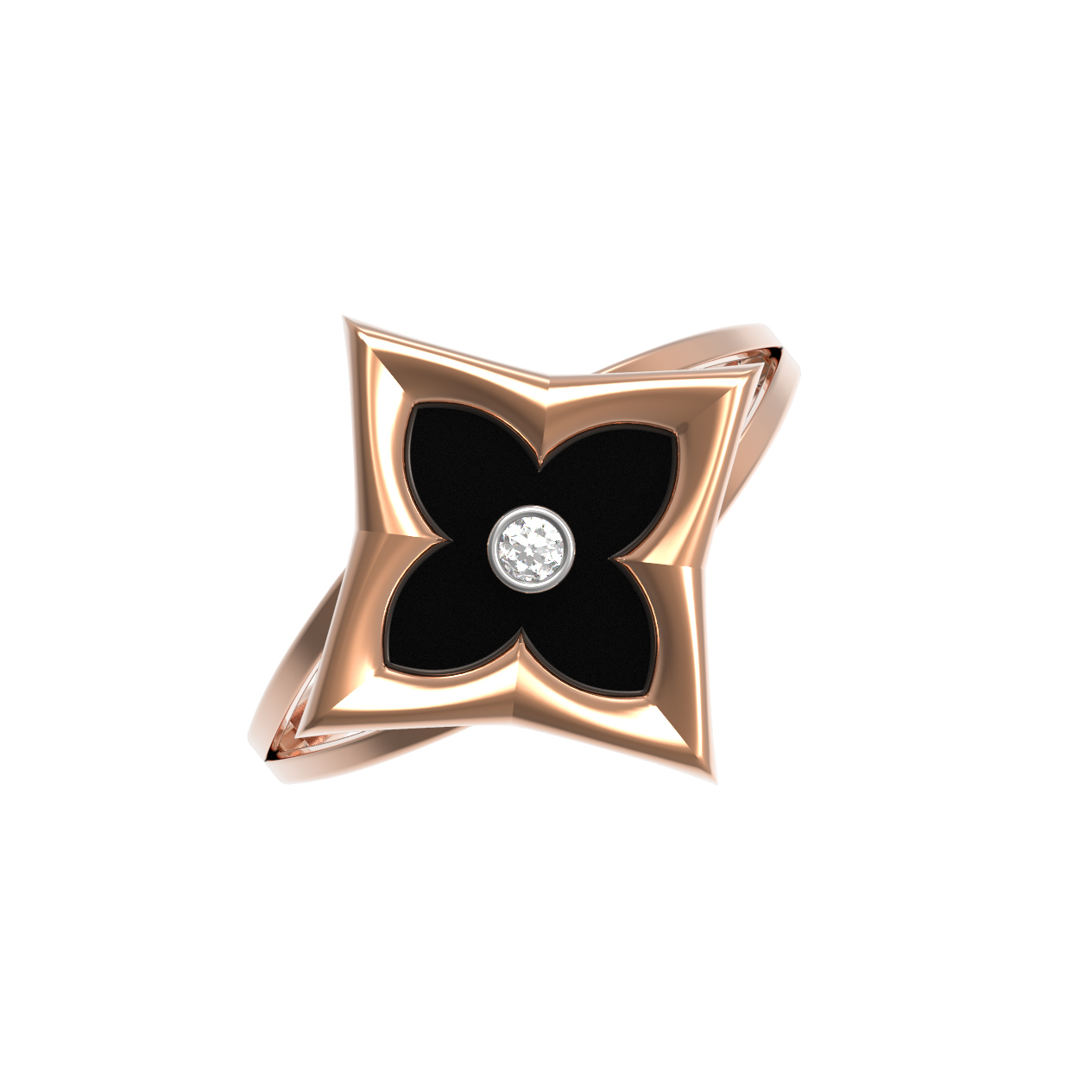 Элегантное кольцо из красного золота 585 пробы — это воплощение утонченного стиля и современного дизайна. Данное украшение, представленное в коллекции De Luxe — Амальфи — Бриллианты, сразу привлекает внимание своей необычной формой в виде клевера, которая придает изделию особое очарование и символический смысл. Благородный блеск красного золота гармонично сочетается с контрастными вставками: глубоким черным ониксом ромбовидной формы и сияющим белым бриллиантом круглой огранки.