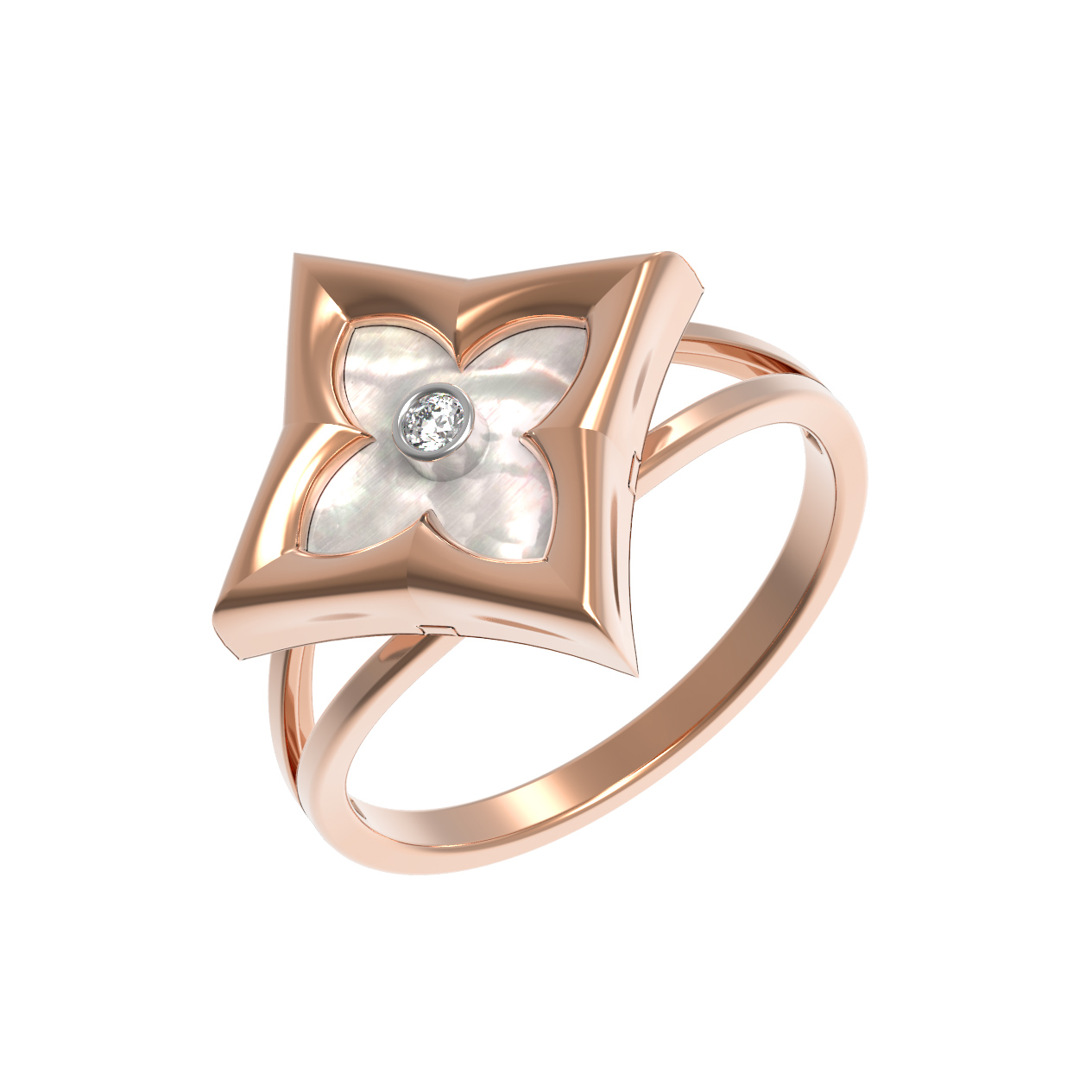Элегантное кольцо из красного золота 585 пробы — гармоничное сочетание классики и современного ювелирного дизайна. Украшение входит в коллекцию De Luxe — Амальфи — Бриллианты, отличающуюся своим утонченным стилем. Центральным элементом композиции является вставка в форме клевера, выполненная из нежного перламутра с характерным переливающимся белым оттенком. В самом сердце перламутровой вставки, имеющей форму ромба, расположен сияющий бриллиант круглой огранки.