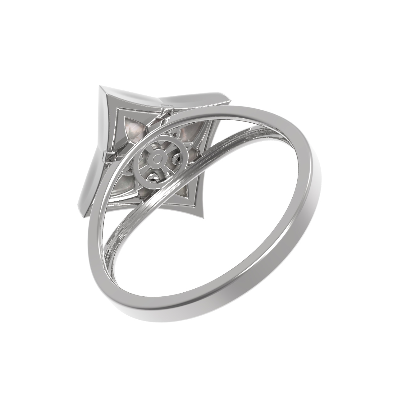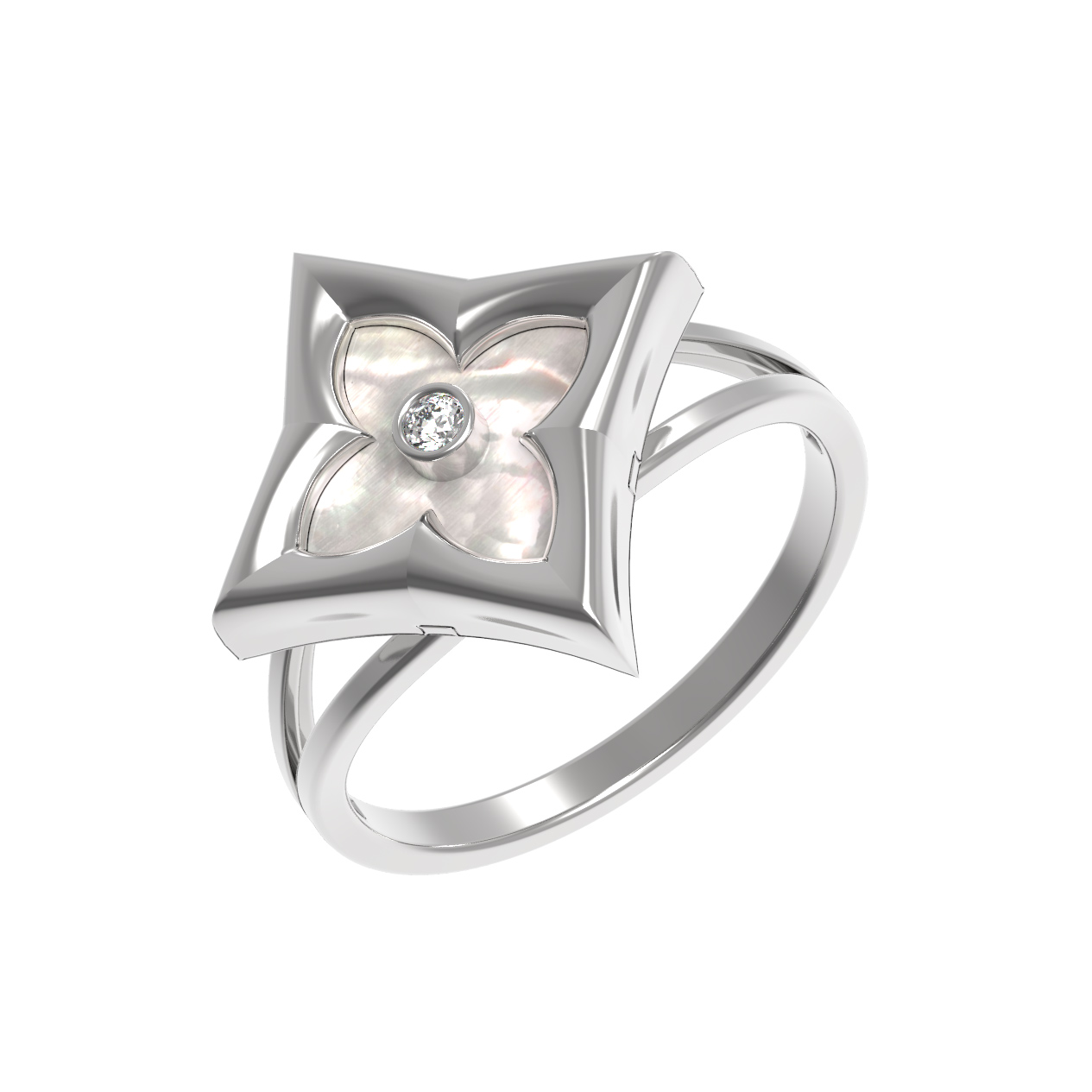 Кольцо из белого золота 585 пробы из коллекции De Luxe — Амальфи — Бриллианты воплощает в себе лаконичность и изысканный стиль. Дизайн изделия вдохновлен образом клевера: центральным элементом украшения стала геометрическая вставка в форме ромба, внутри которой деликатно расположился перламутр с его мягким внутренним свечением. В самом сердце композиции сияет круглый бриллиант, добавляя акцент и подчеркивая благородство белого золота.