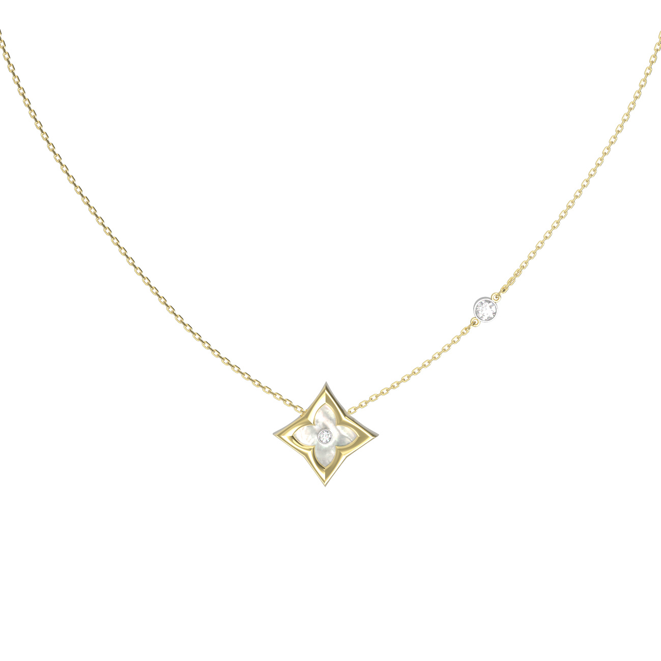 Данная модель отличается продуманной композицией, в которой сочетаются вставки различных форм — ромб и круг. Общее количество вставок составляет 2. Универсальность изделия позволяет носить его как мужчинам, так и женщинам, что делает это колье прекрасным выбором для тех, кто ценит унисекс-эстетику в ювелирном искусстве. Тонкая, изящная цепочка, дополненная вторым бриллиантом, придает украшению легкость и современный вид.