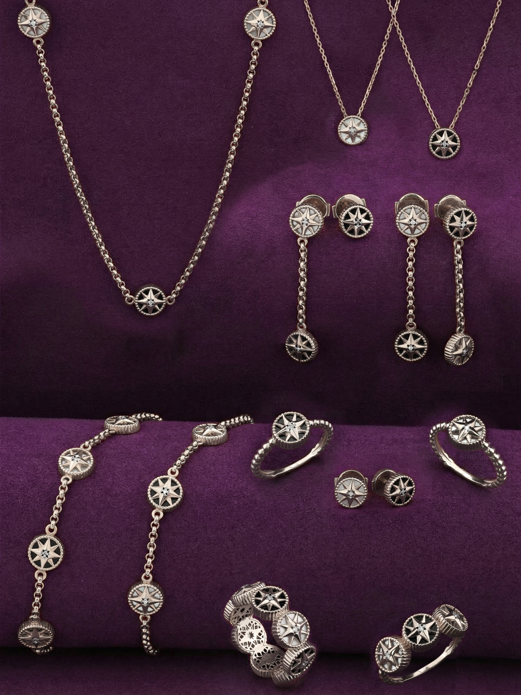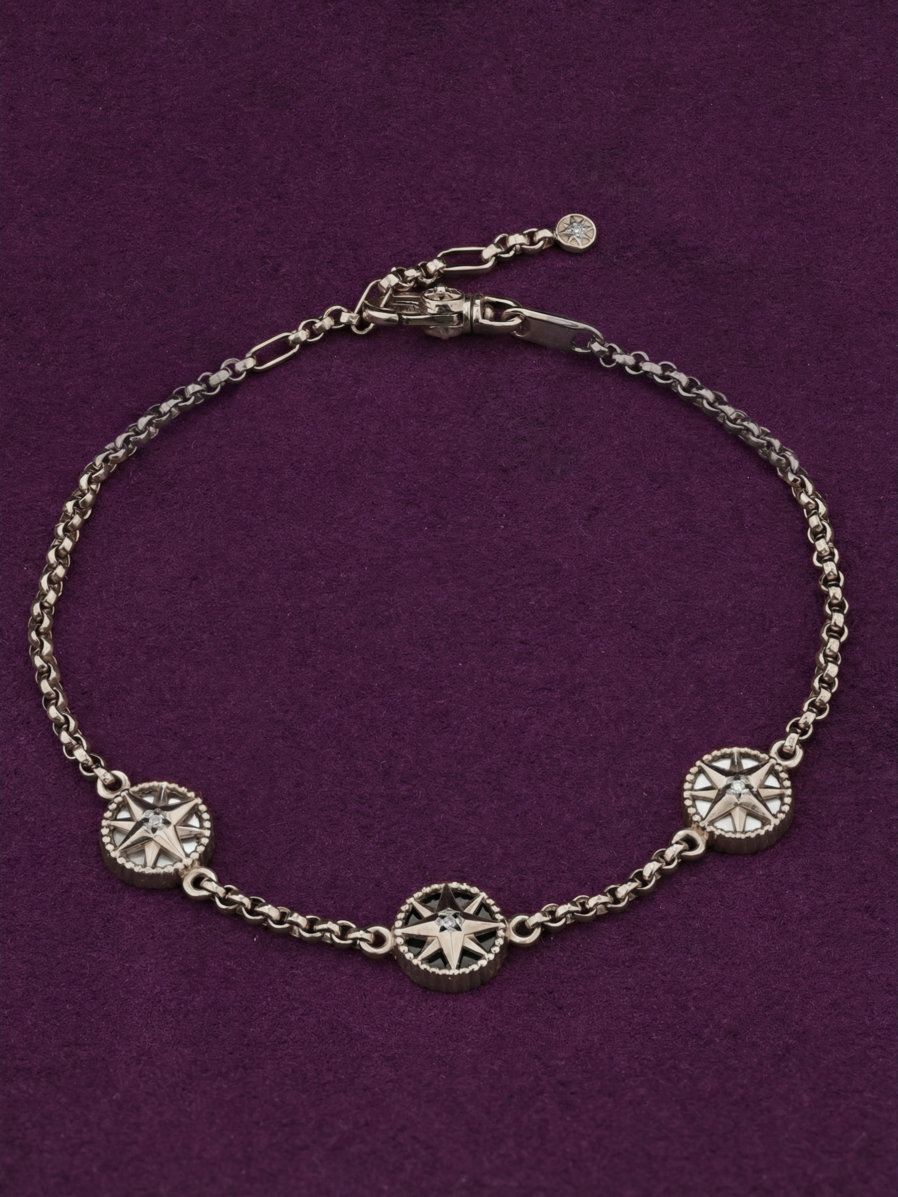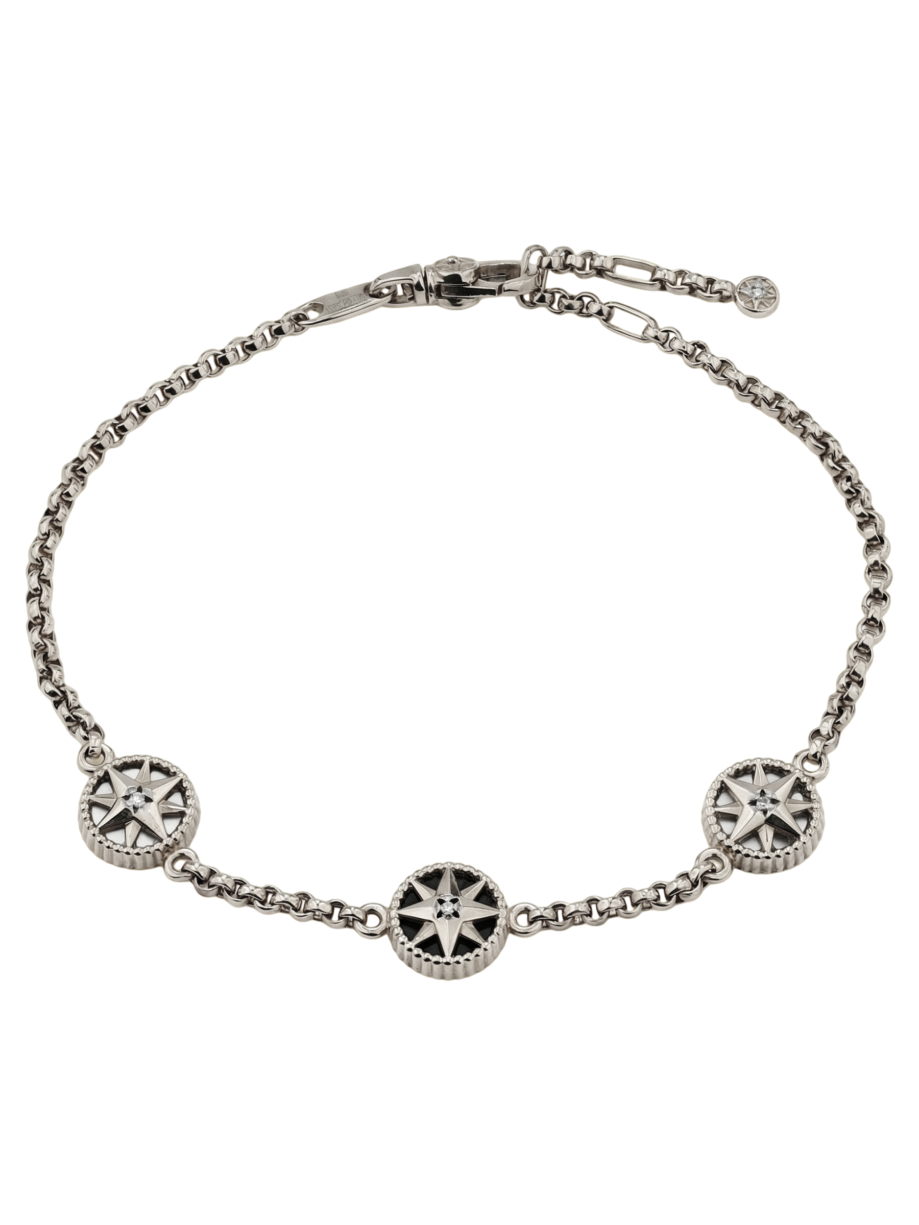 В оформлении браслета гармонично сочетаются четыре круглые вставки. Глубокий черный оникс перекликается с нежным перламутром, создавая выразительный визуальный эффект. Каждая звезда украшена сияющим бриллиантом, который добавляет аксессуару премиального блеска. Такое сочетание материалов — белого золота, черного оникса и светлого перламутра — позволяет браслету выглядеть современно и статусно.