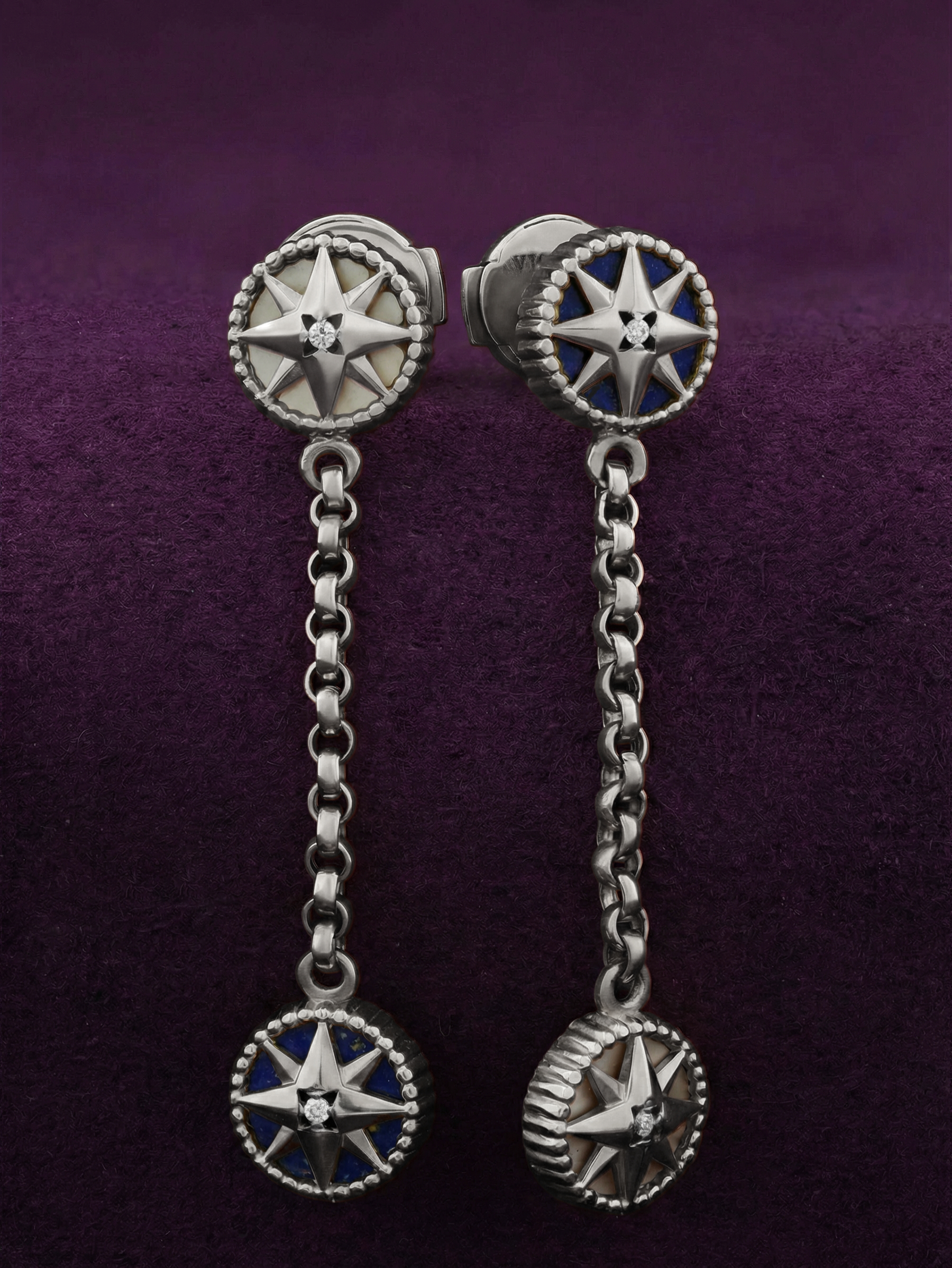 В центре композиции расположены 6 вставок круглой формы, которые создают неповторимую игру света. Контрастное сочетание благородного белого золота с природной глубиной синего лазурита и нежным сиянием перламутра придает изделию особое очарование. Завершающим акцентом выступают искристые бриллианты, подчеркивающие премиальный статус украшения.