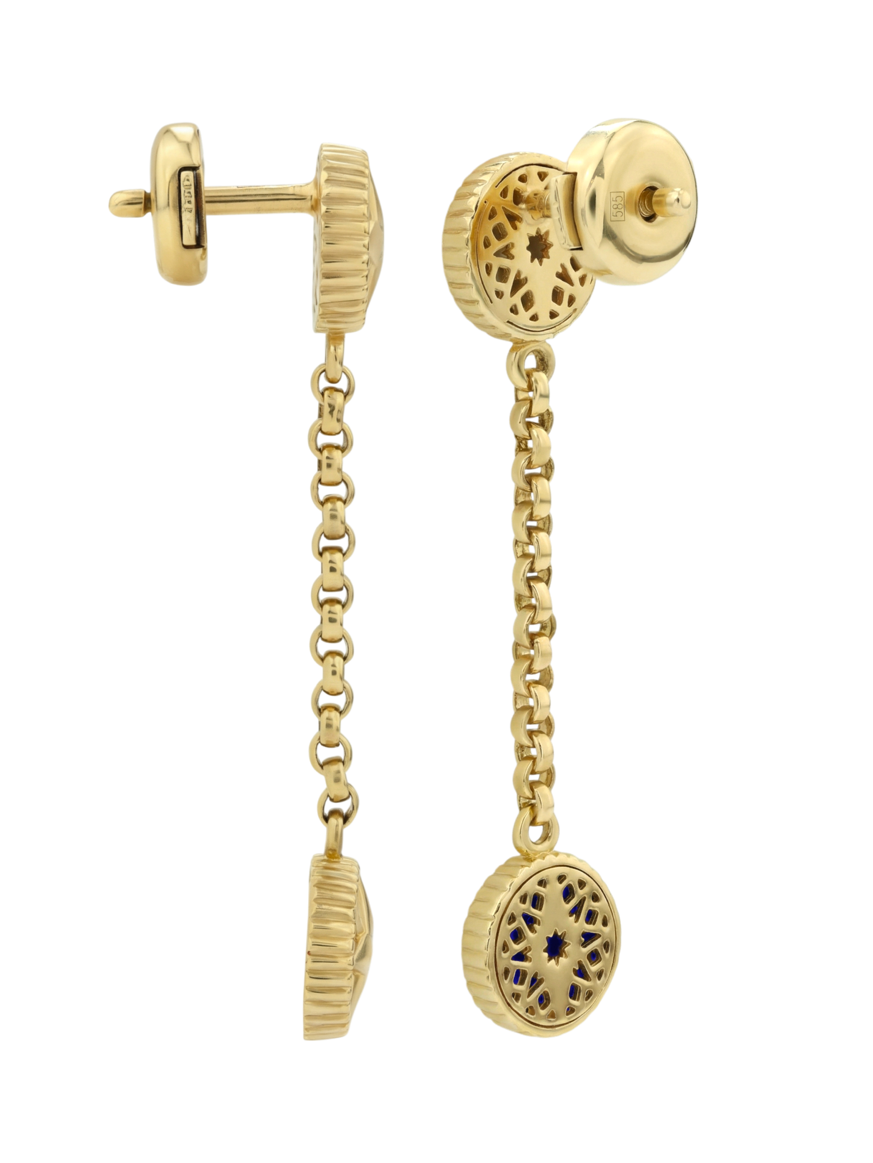 В центре композиции гармонично сочетаются драгоценные и полудрагоценные камни. Инкрустация включает 6 круглых вставок: сияющие бриллианты, глубокий синий лазурит и нежный перламутр. Контраст белого цвета бриллиантов, перламутровых переливов и яркого синего оттенка лазурита придает серьгам особую выразительность. Тщательная проработка деталей делает это украшение универсальным аксессуаром, который одинаково гармонично подойдет как для женщин, так и для мужчин.