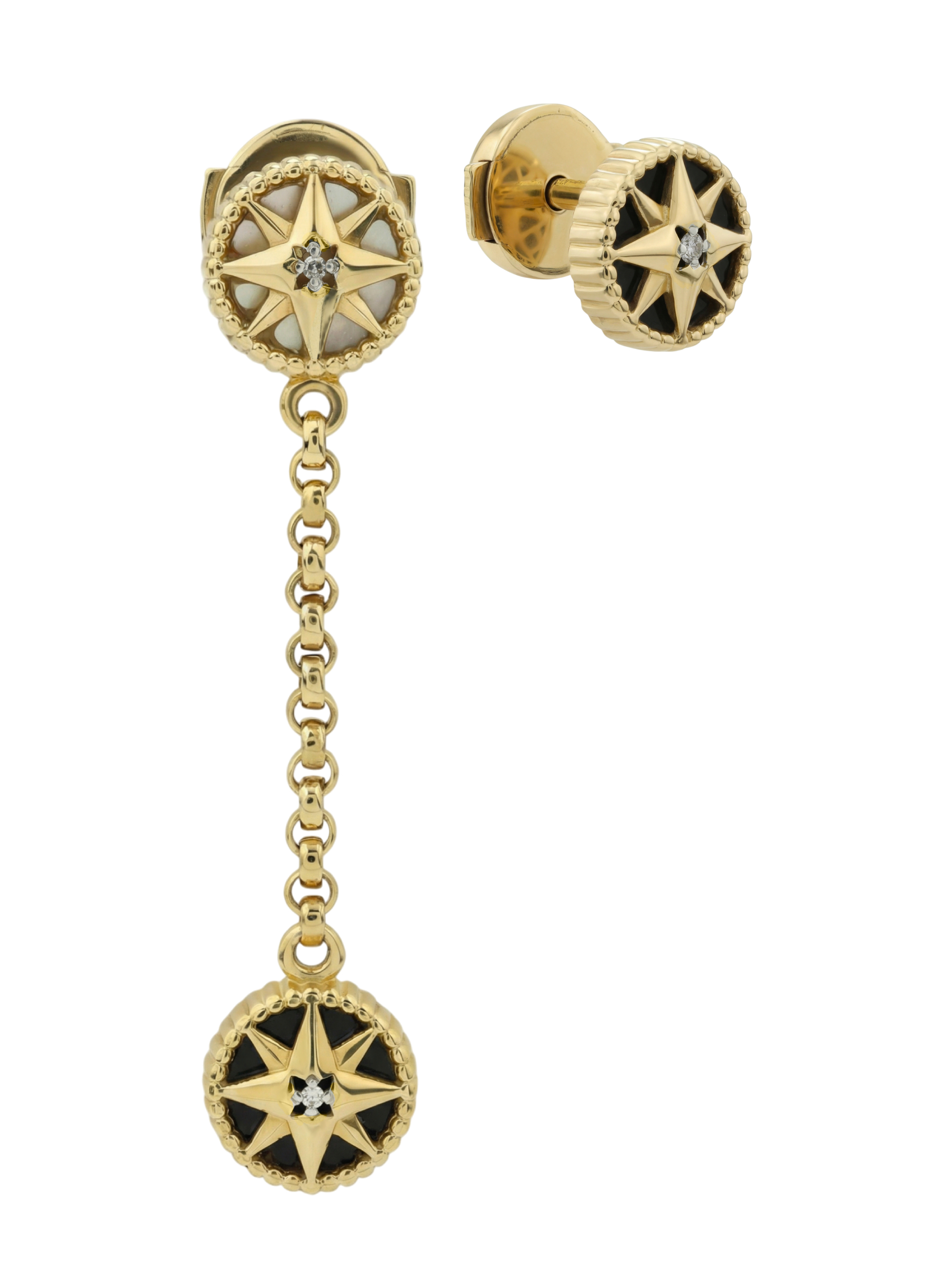 В центре внимания — 5 вставок круглой формы, которые гармонично сочетают в себе благородный блеск бриллиантов, таинственную глубину черного оникса и нежное сияние перламутра. Комбинация белого, черного и перламутрового цветов создает неповторимый визуальный акцент, делая эти серьги идеальным дополнением к вечернему наряду или акцентным элементом делового стиля.