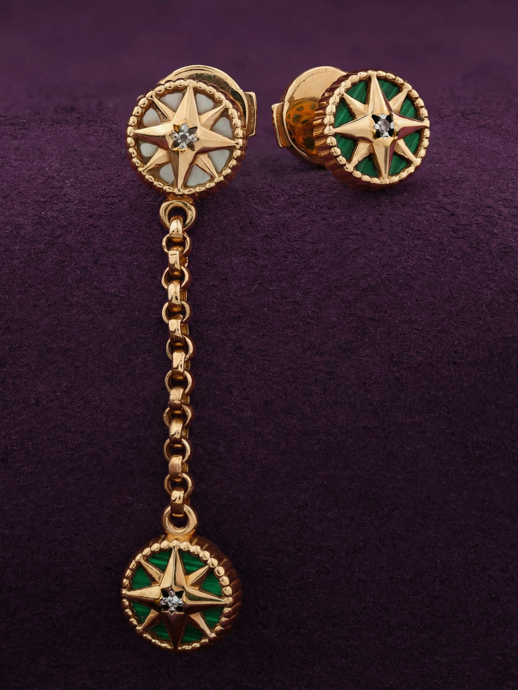 В дизайне использовано 5 вставок круглой формы: благородный бриллиант, глубокий зеленый малахит и нежный переливающийся перламутр. Контрастные цвета вставок — белый, зеленый и перламутровый — создают яркую визуальную игру на фоне теплого красного золота. Ювелиры тщательно проработали детали, чтобы подчеркнуть красоту каждого материала.