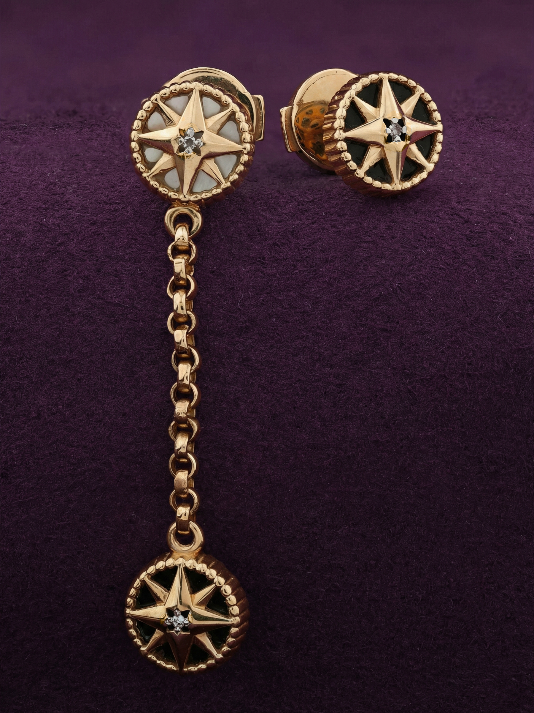 Эффектные серьги из красного золота 585 пробы — воплощение ювелирного искусства, вдохновленное небесными светилами. Украшения из коллекции De Luxe — Звёзды — Бриллианты притягивают взгляд своим глубоким контрастом и выверенным дизайном в форме звезды. В центре композиции — 5 вставок круглой формы: сияющие бриллианты, глубокий черный оникс и нежный перламутр. Такое сочетание материалов создает игру фактур и оттенков — от благородного белого блеска драгоценного камня и мягкого перелива перламутра до строгого черного оникса.