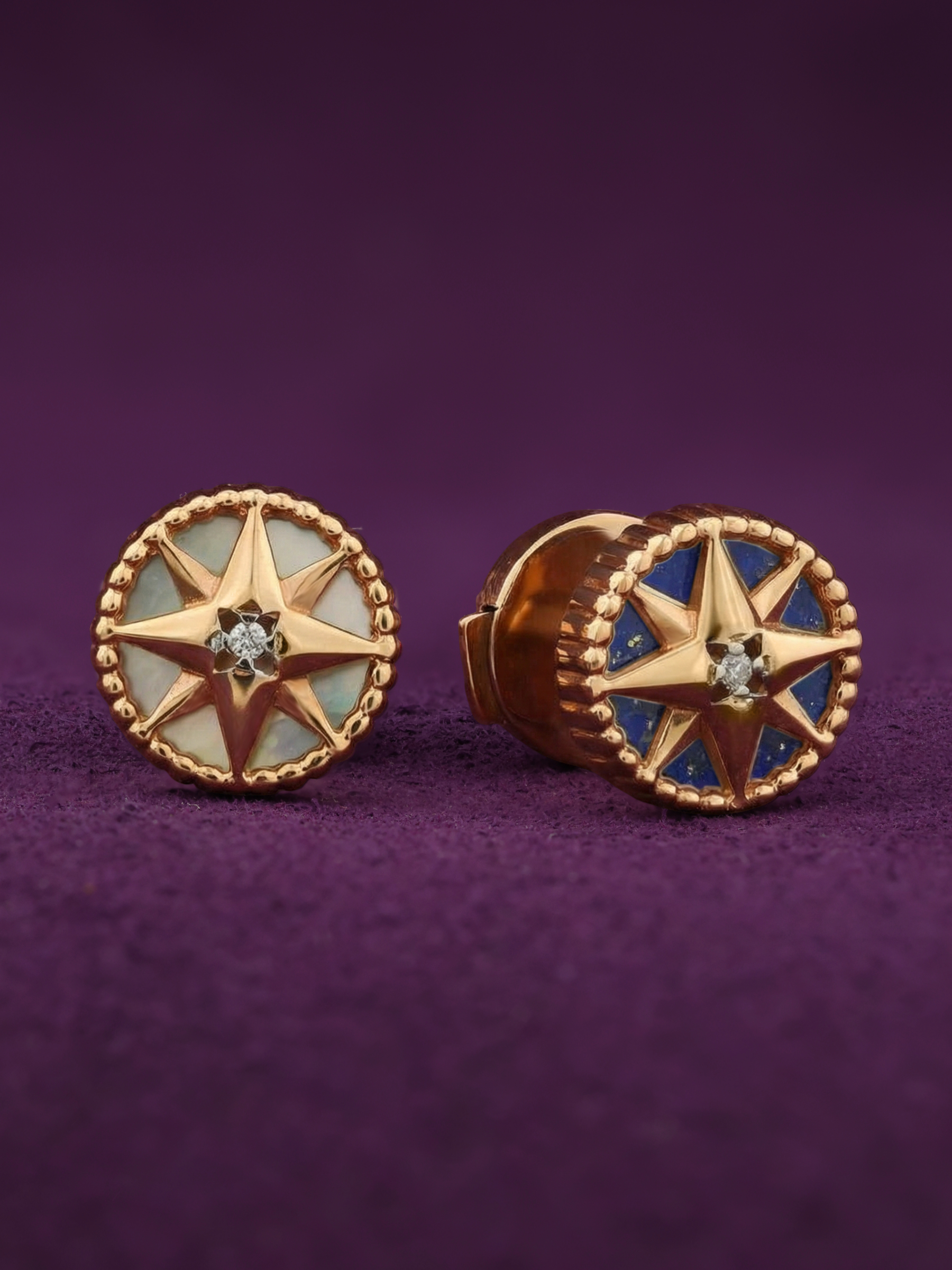 Серьги изготовлены из красного золота 585 пробы, которое обеспечивает глубину и насыщенность цвета, подчеркивая статусность украшения. В центре каждой композиции расположен сверкающий бриллиант круглой формы, олицетворяющий сияние ночного светила. Контрастное сочетание вставок придает изделию неповторимый шарм: глубокий синий лазурит гармонично дополняется нежным перламутром белого цвета. Лаконичная круглая форма делает это украшение универсальным аксессуаром.