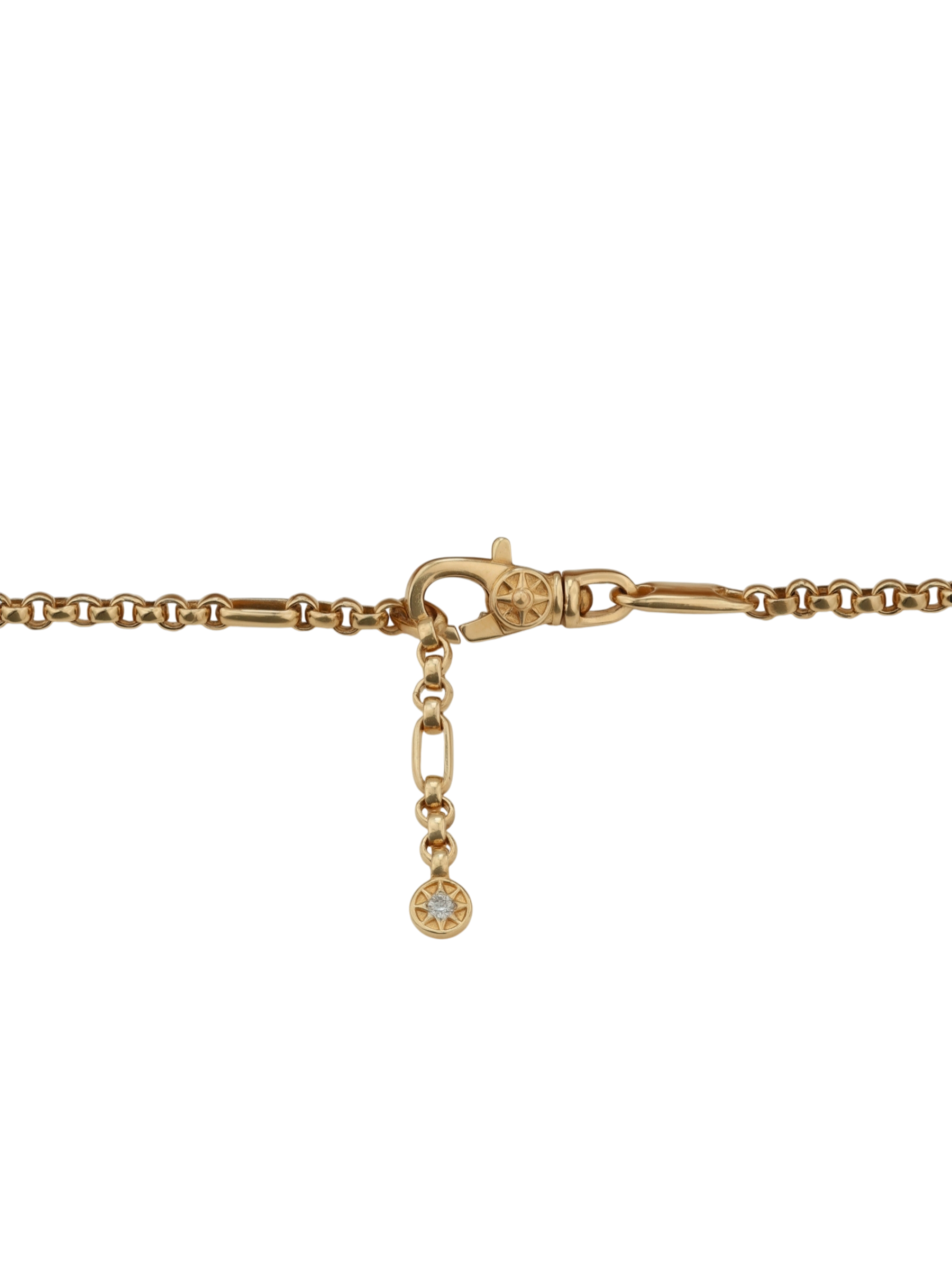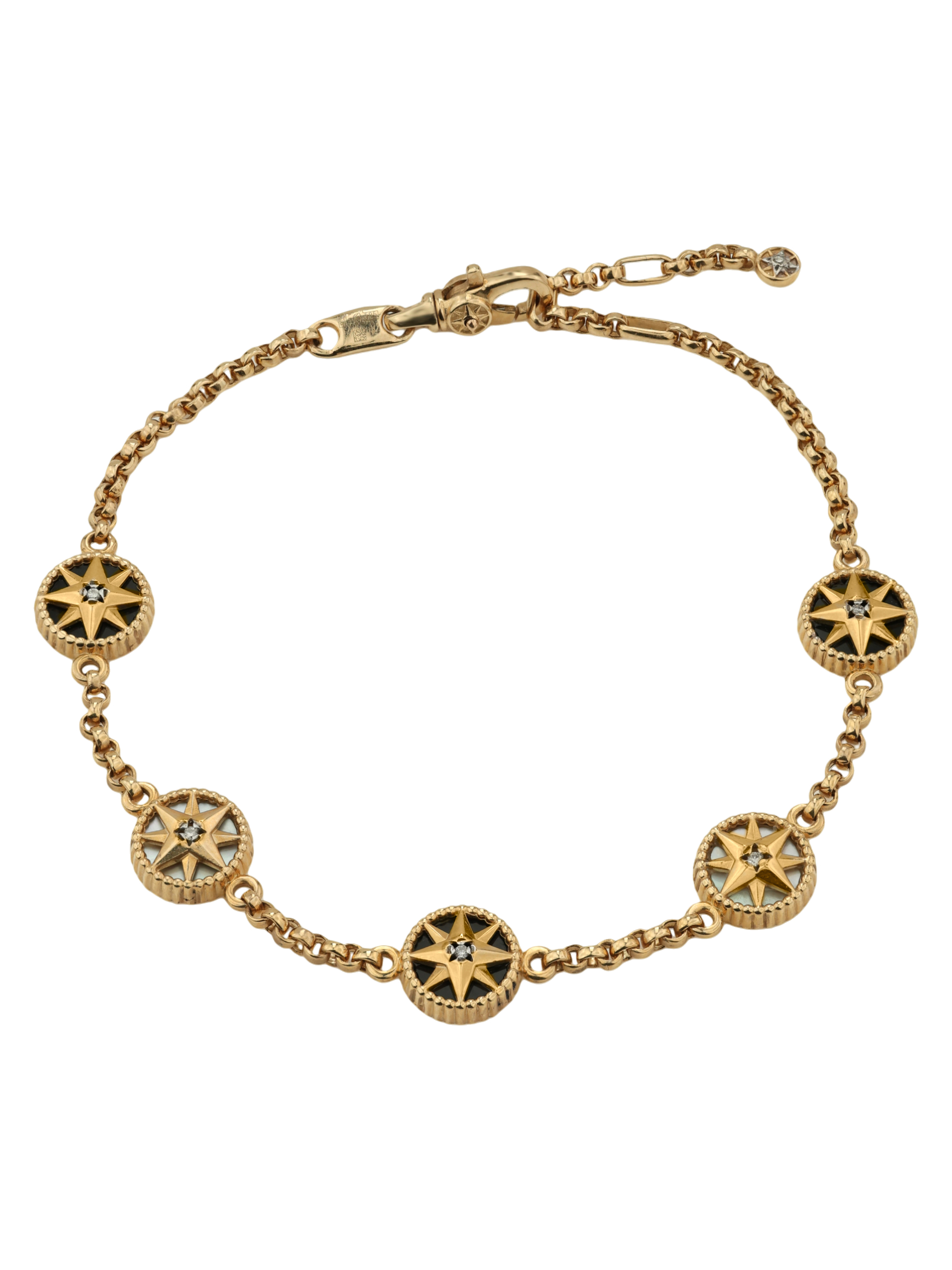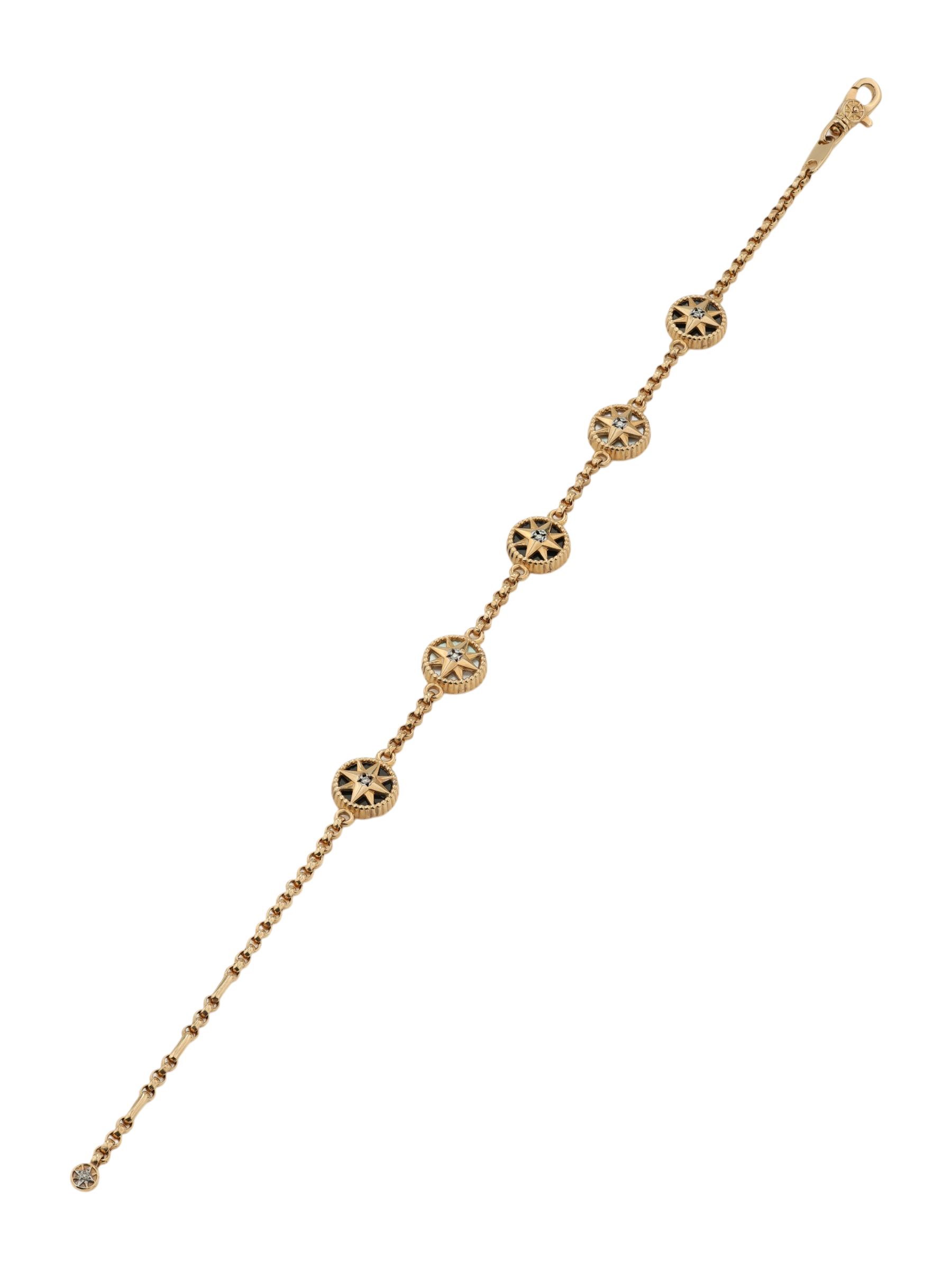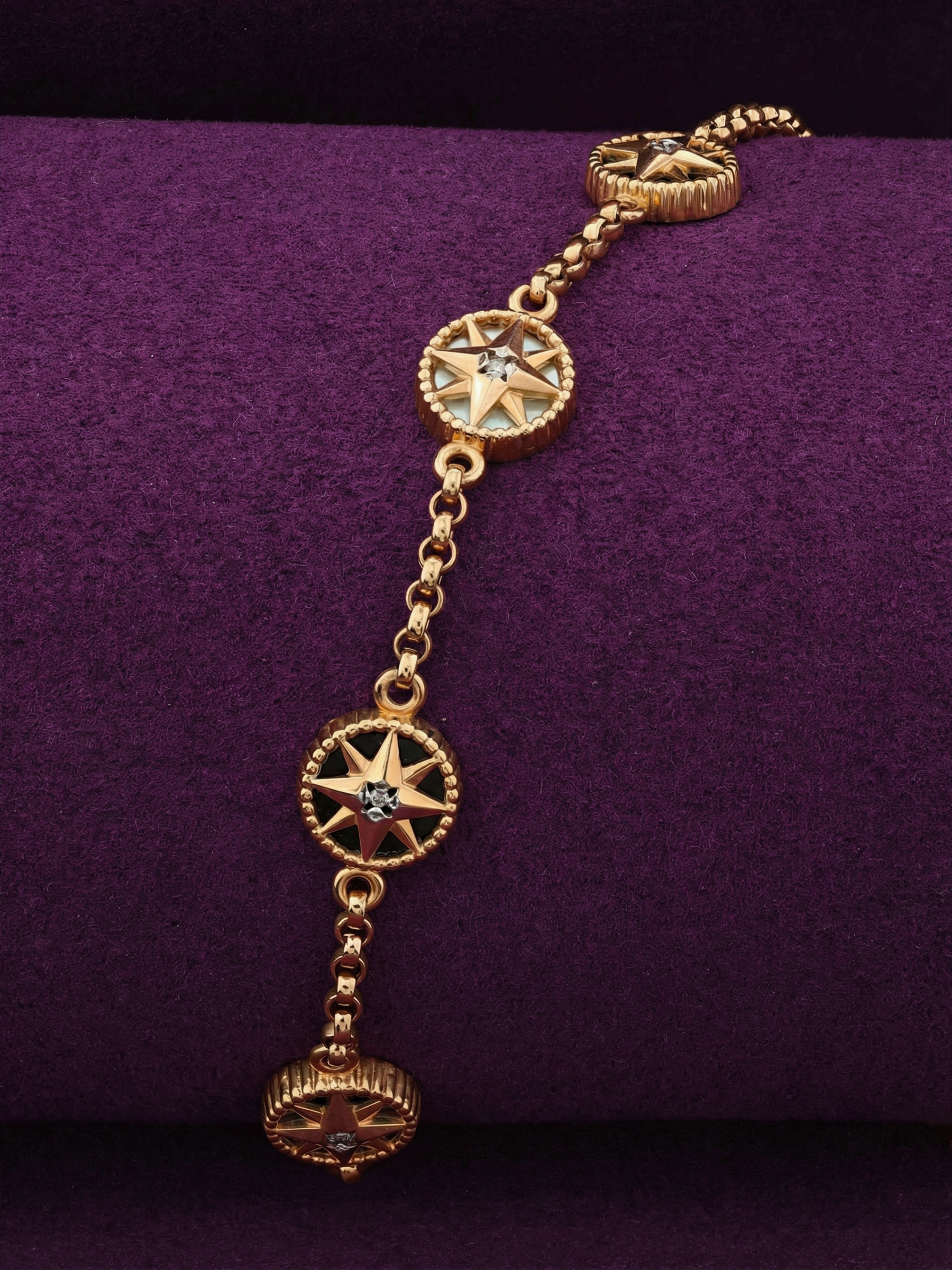 Особую привлекательность браслету придает изысканная инкрустация: в изделии гармонично сочетаются восемь вставок, среди которых драгоценные бриллианты, загадочный черный оникс и нежный перламутр. Контраст между белым цветом бриллиантов, переливами перламутра и насыщенным черным оттенком оникса создает завораживающий визуальный эффект. Круглая форма вставок в сочетании со строгой геометрией звезд делает дизайн изделия одновременно динамичным и элегантным.