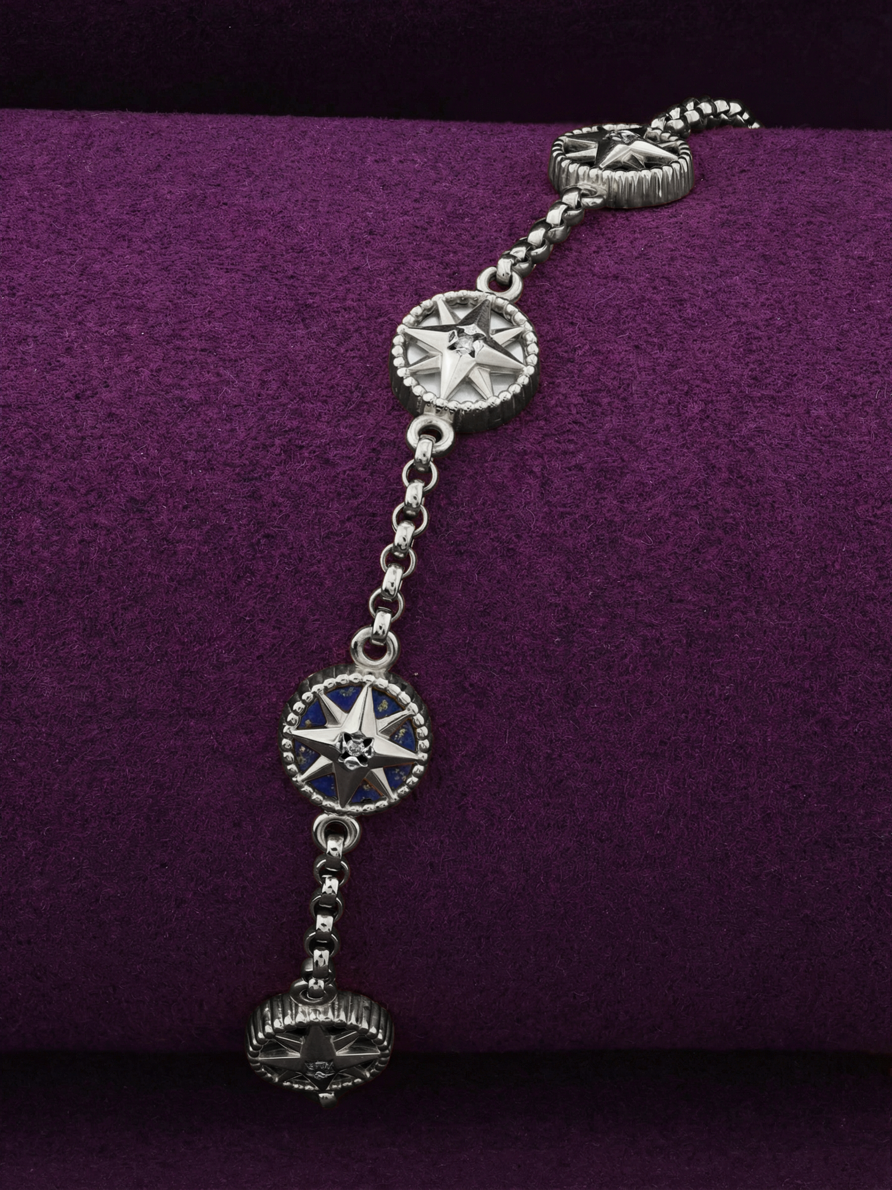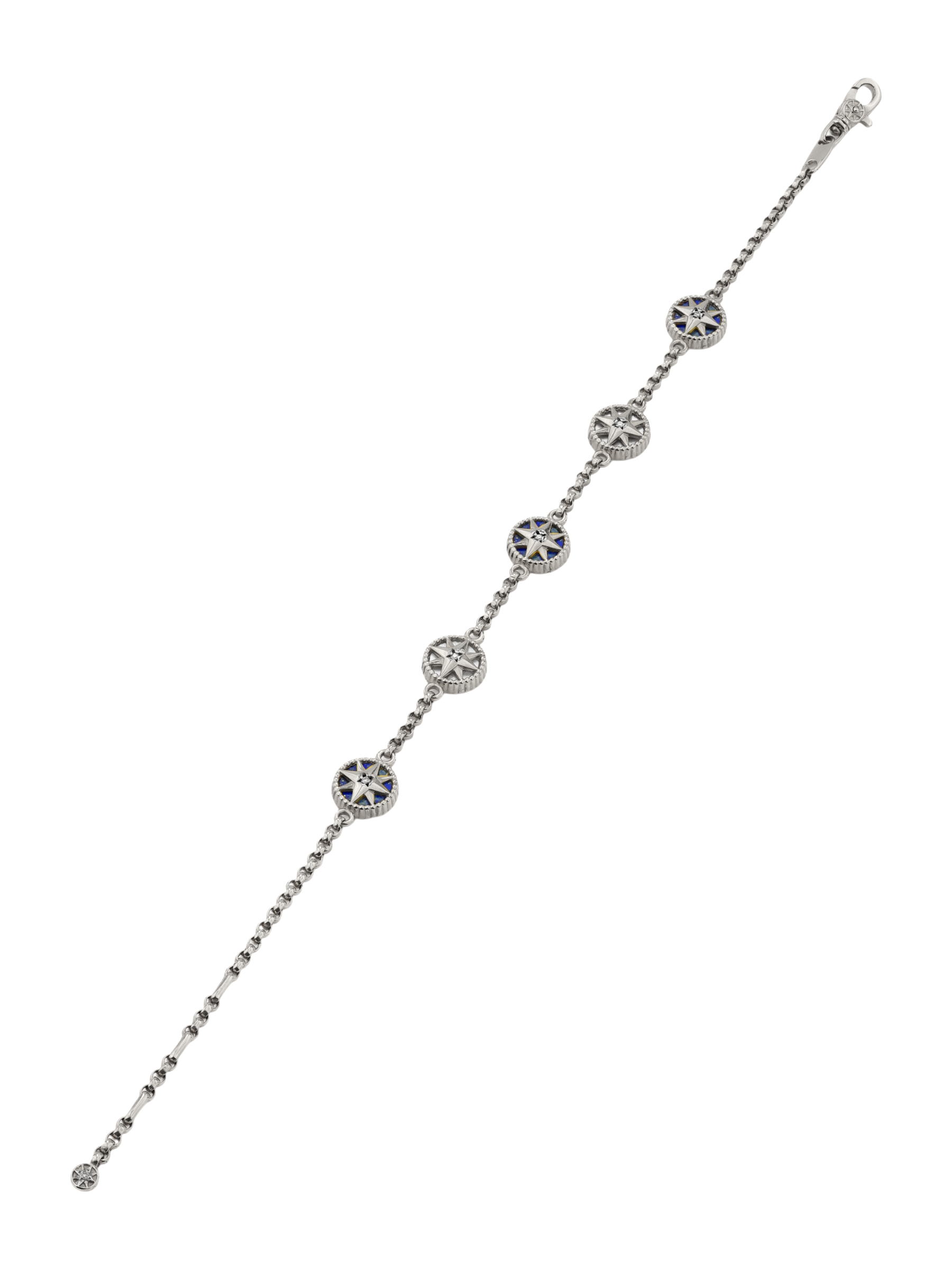 В оформлении модели гармонично сочетаются благородные материалы. Контрастная игра цветов вставок — глубокого синего лазурита, нежного перламутра и сверкающего бриллианта — создает неповторимую эстетику. Всего в украшении использовано 8 вставок круглой формы, которые эффектно перекликаются с холодным блеском белого золота. Детализированная проработка каждого элемента делает браслет не просто украшением, а символом утонченного стиля.