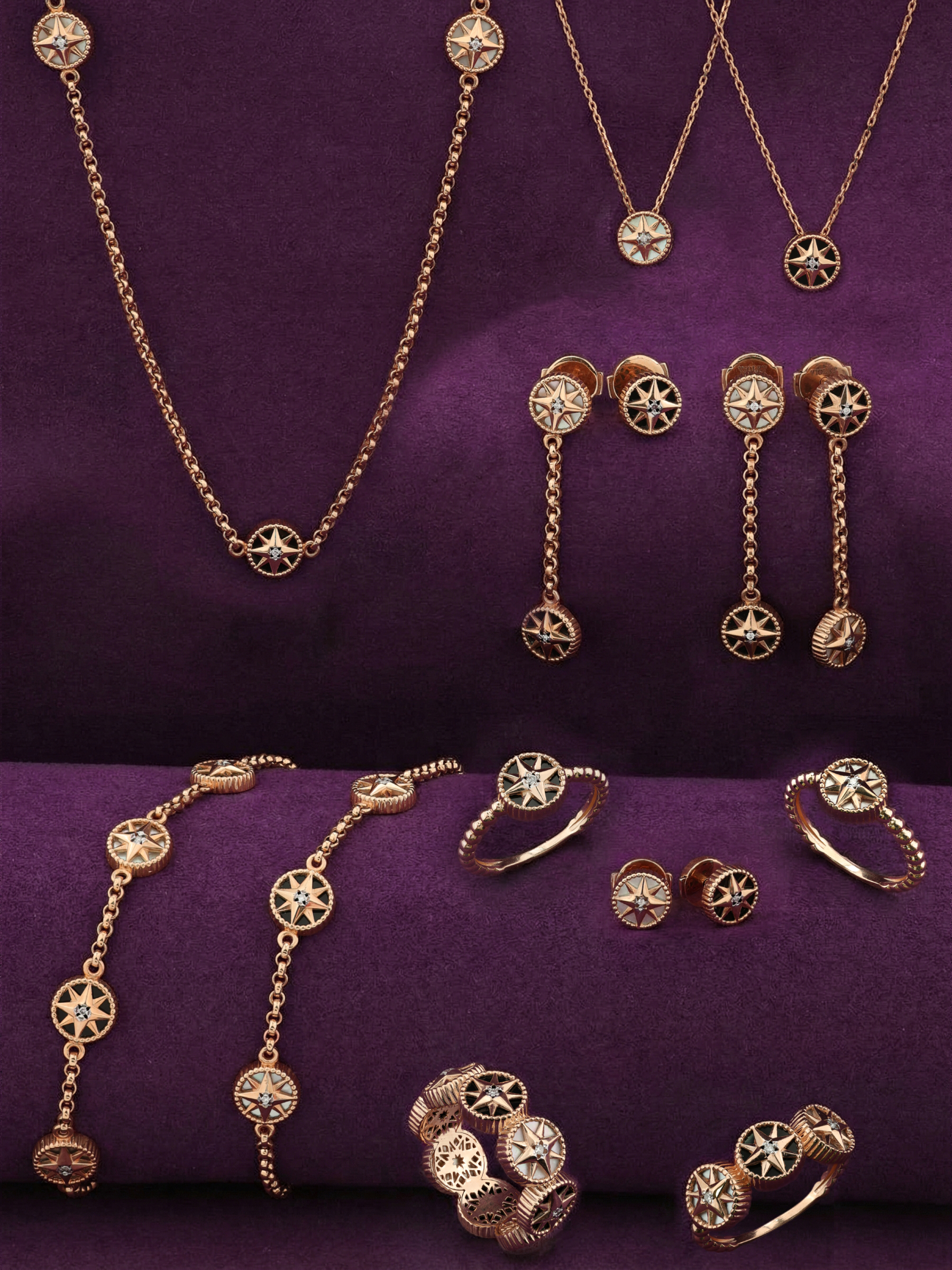 Мастерство исполнения подчеркивают 24 драгоценные вставки круглой формы. Контрастное сочетание глубокого черного оникса и нежного перламутра создает уникальную игру цвета, а сияние бриллиантов добавляет украшению благородного блеска. Использование красного золота придает изделию теплое, насыщенное свечение, которое идеально сочетается с любым оттенком кожи.