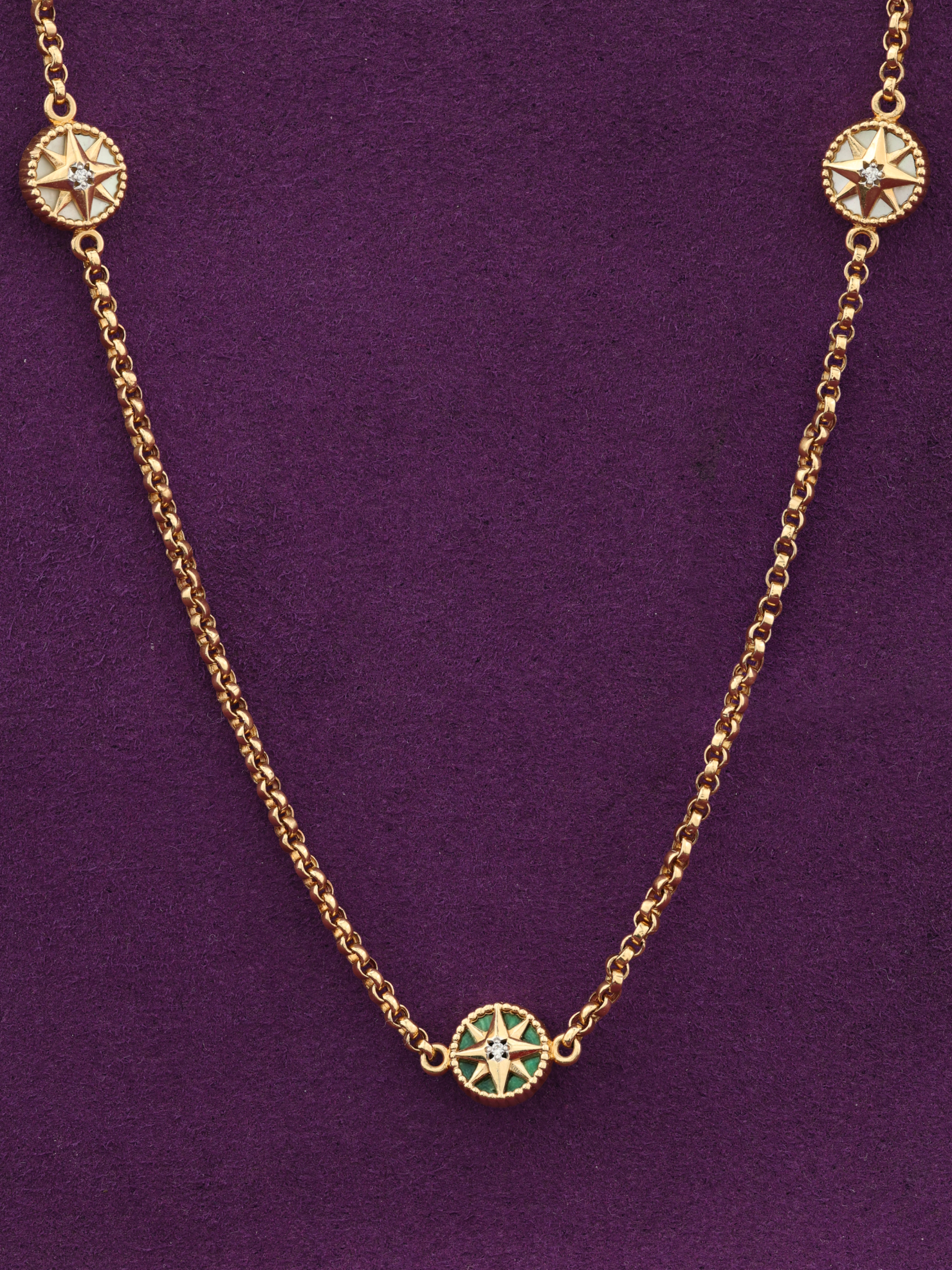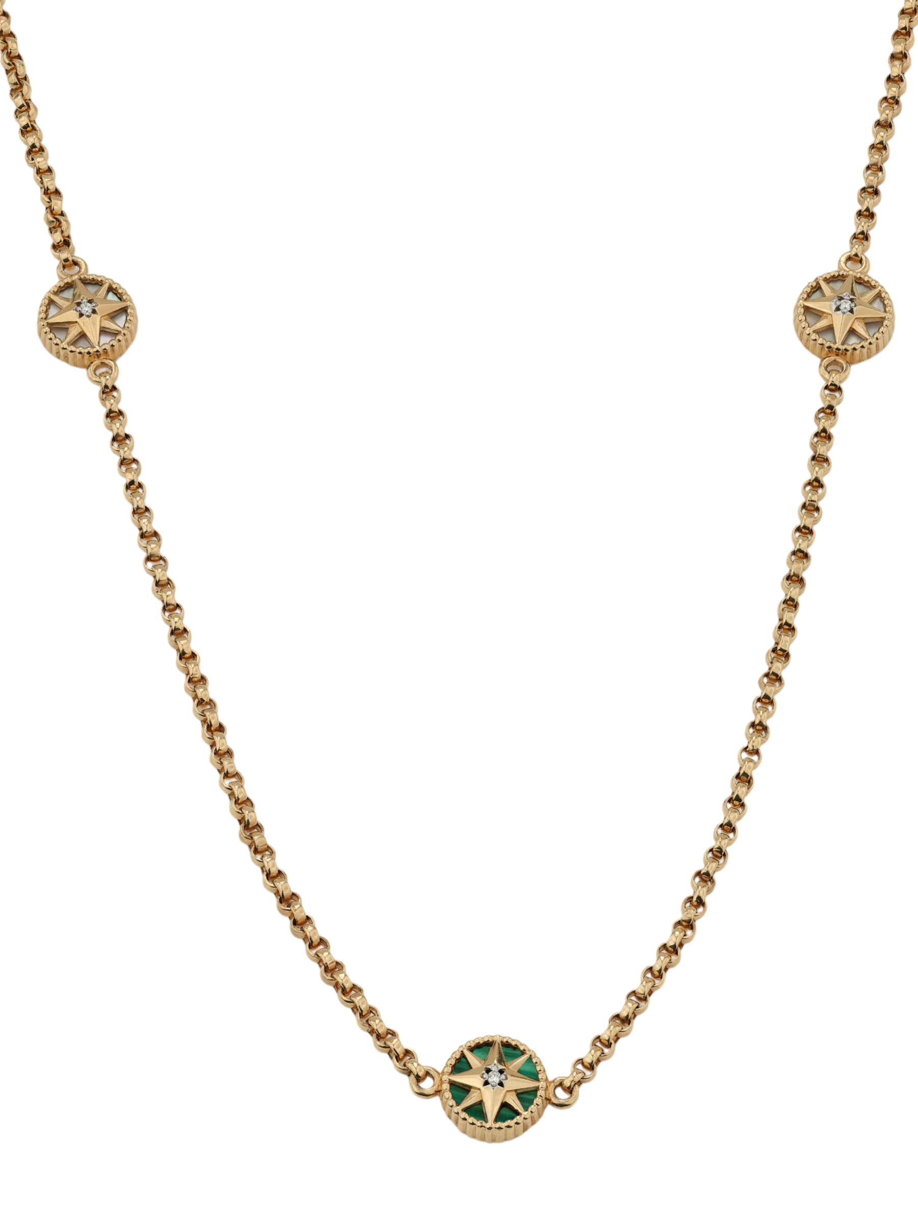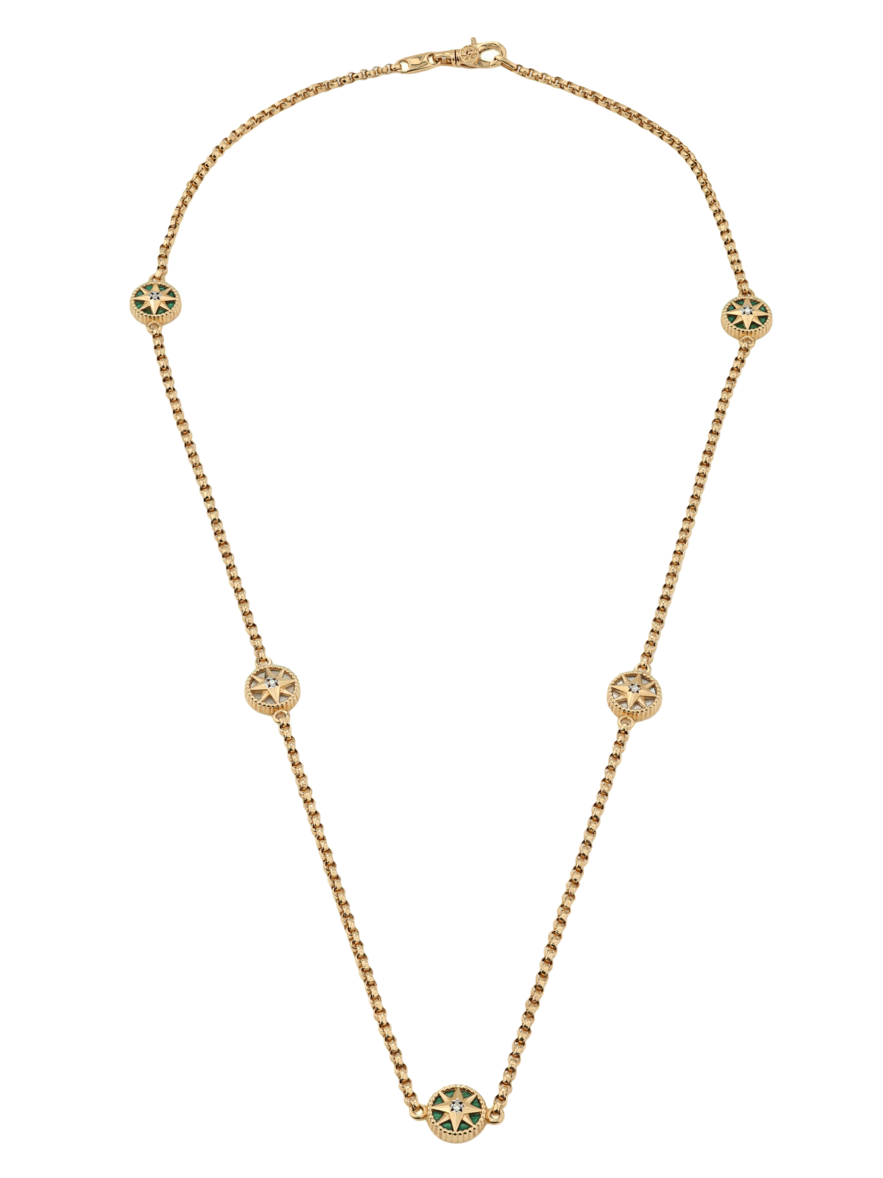 В центре композиции и декоративных элементов расположены 24 вставки круглой формы: сияющие бриллианты, глубокий зеленый малахит и нежный перламутр создают контрастный и притягательный визуальный ряд. Белый, зеленый и перламутровый цвета вставок подчеркивают мастерство исполнения и глубину дизайна. Это колье — универсальное украшение, которое одинаково гармонично дополнит стиль как женщин, так и мужчин, становясь ярким завершением любого образа.
