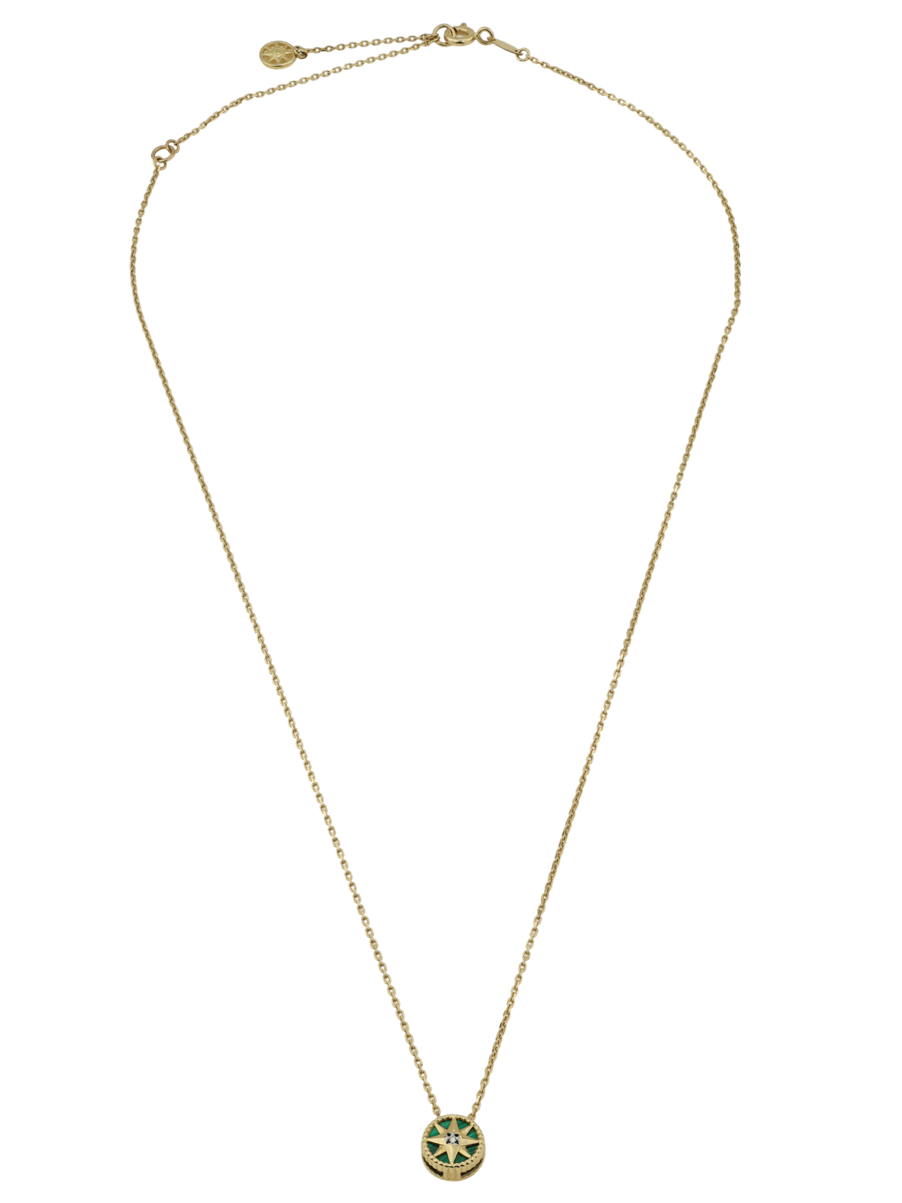 Элегантное колье из лимонного золота 585 пробы станет центральным акцентом вашего образа, подчеркивая безупречный вкус и статус. Это стильное украшение из коллекции De Luxe — Звёзды — Бриллианты выполнено в выразительном дизайне в виде звезды, символизирующей путеводный свет и успех. Центральным элементом ювелирного изделия является гармоничное сочетание теплых оттенков благородного металла и насыщенного малахита глубокого зеленого цвета. Фигурные вставки из малахита идеально дополняют облик колье, а контрастный блеск белого бриллианта круглой формы добавляет изделию роскошное сияние.