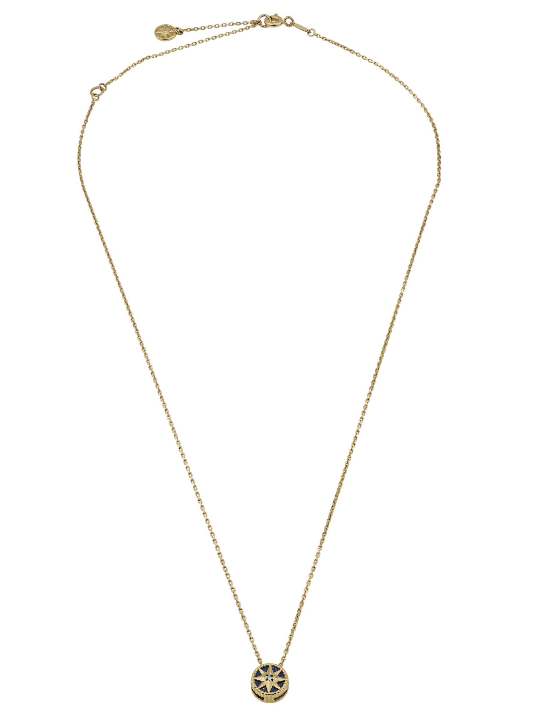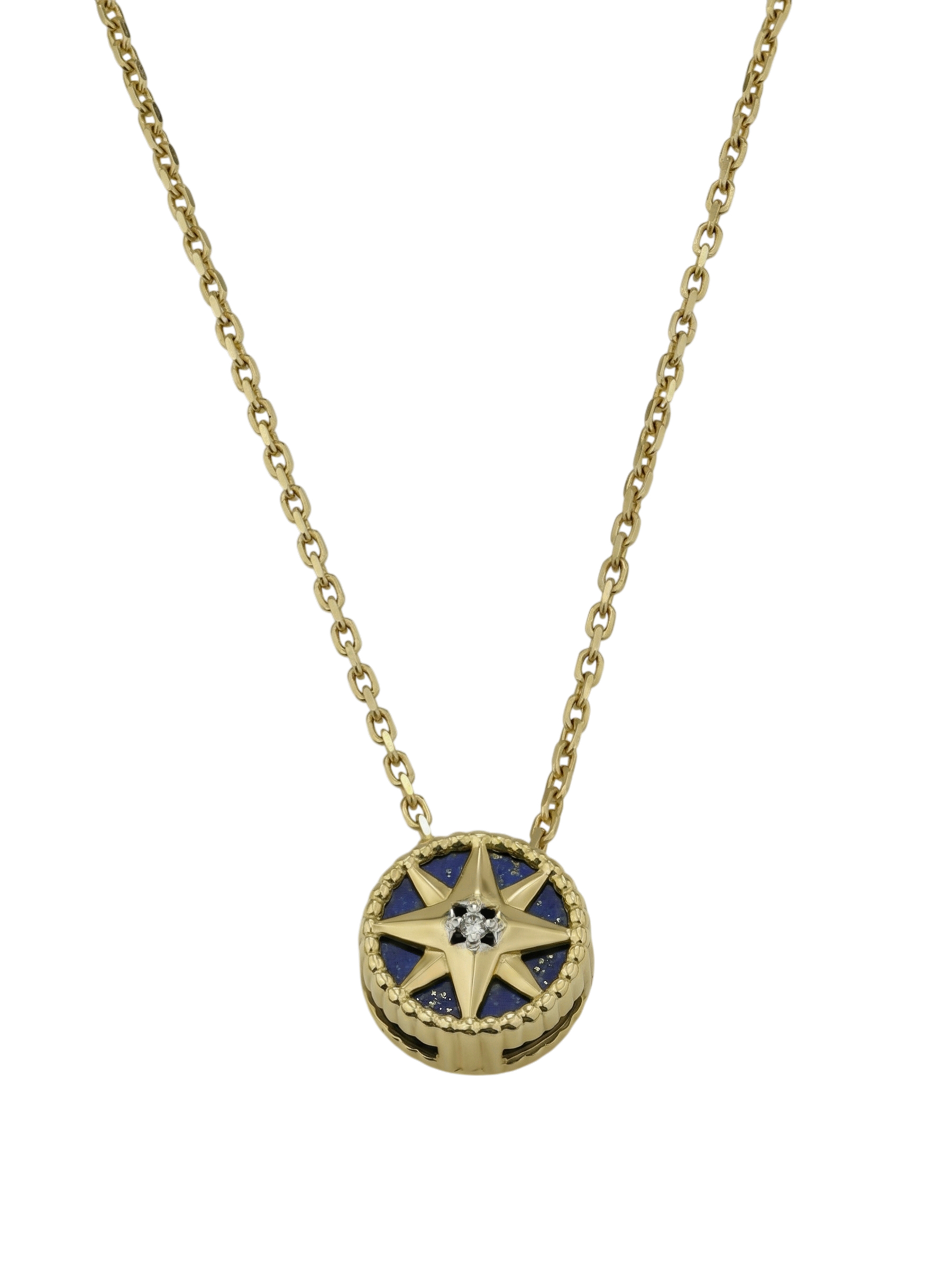 В центре композиции гармонично сочетаются две вставки: благородный лазурит синего цвета и сверкающий бриллиант белого оттенка. Обе вставки имеют правильную форму круга, создавая идеальный баланс между строгостью линий и роскошью драгоценных камней. Лимонное золото, из которого выполнено колье, добавляет изделию особого шарма и выразительности.