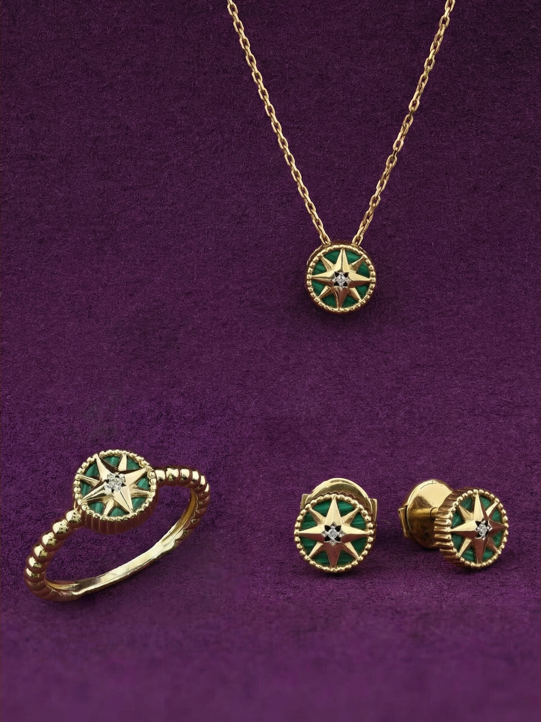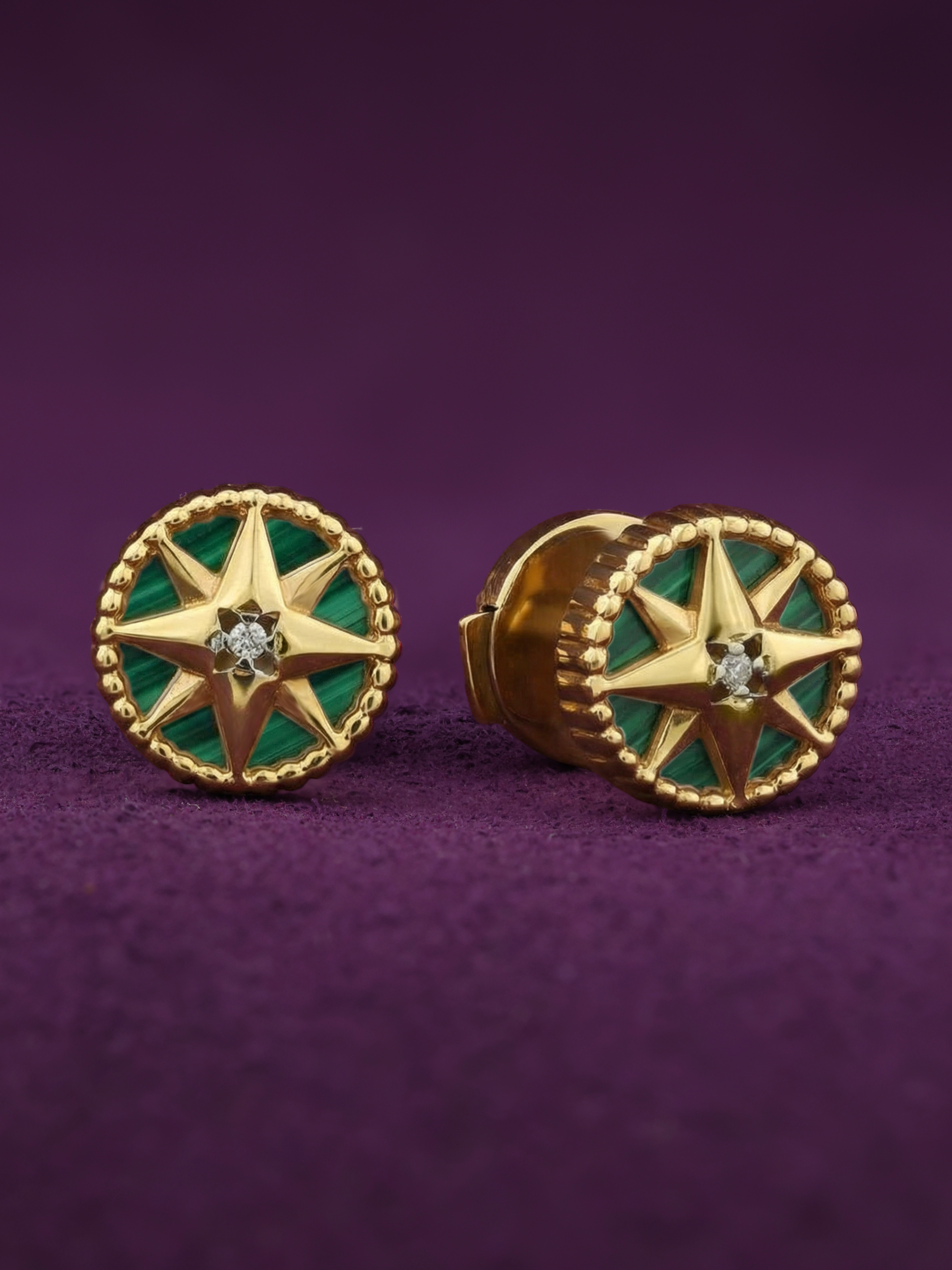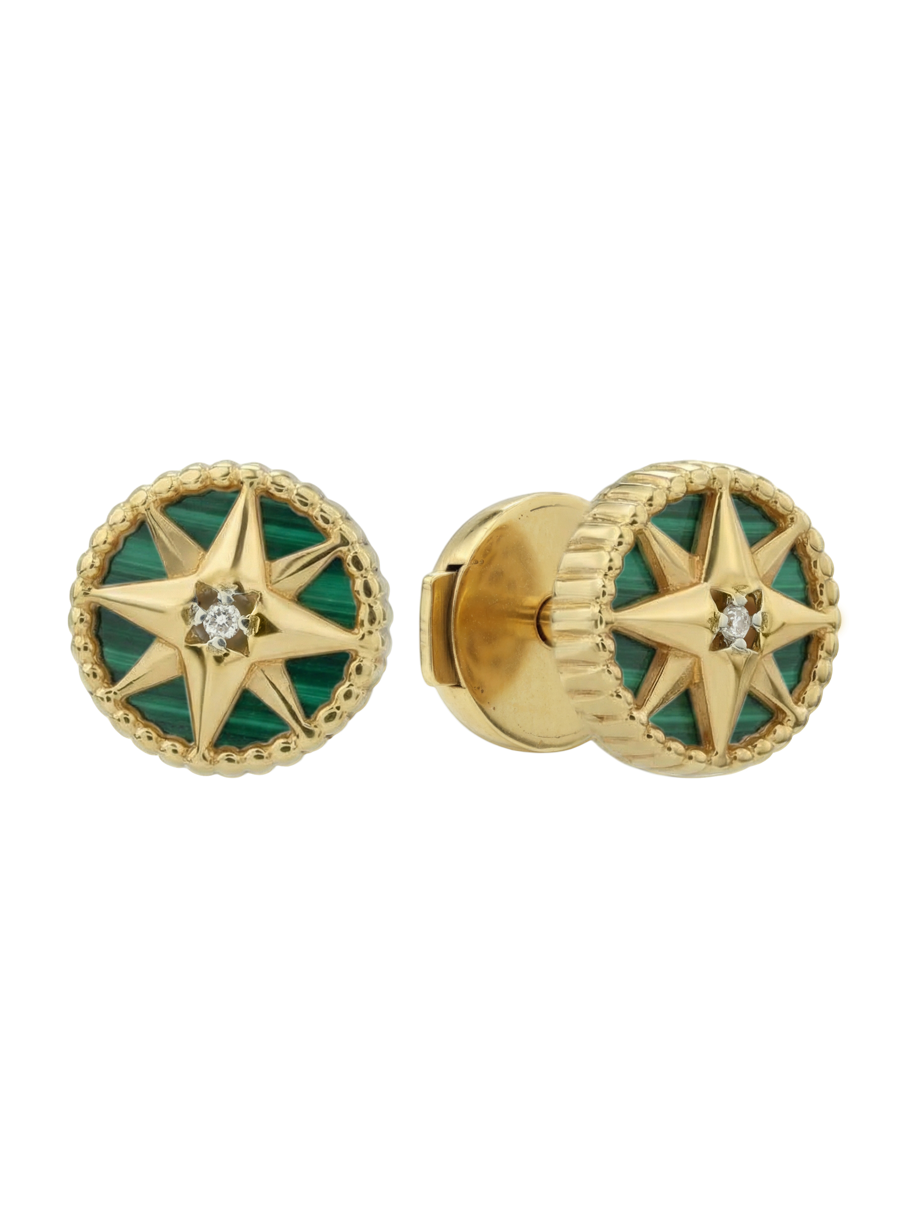 Центральным элементом композиции является яркое сочетание камней: насыщенный зеленый малахит круглой формы соседствует с искрящимся белым бриллиантом, расположенным в самом сердце звезды. Всего в украшении использовано 4 вставки, которые гармонично дополняют друг друга, создавая эффектный и статусный аксессуар. Универсальный дизайн позволяет носить эти серьги как женщинам, так и мужчинам, предпочитающим утонченные и символичные украшения.