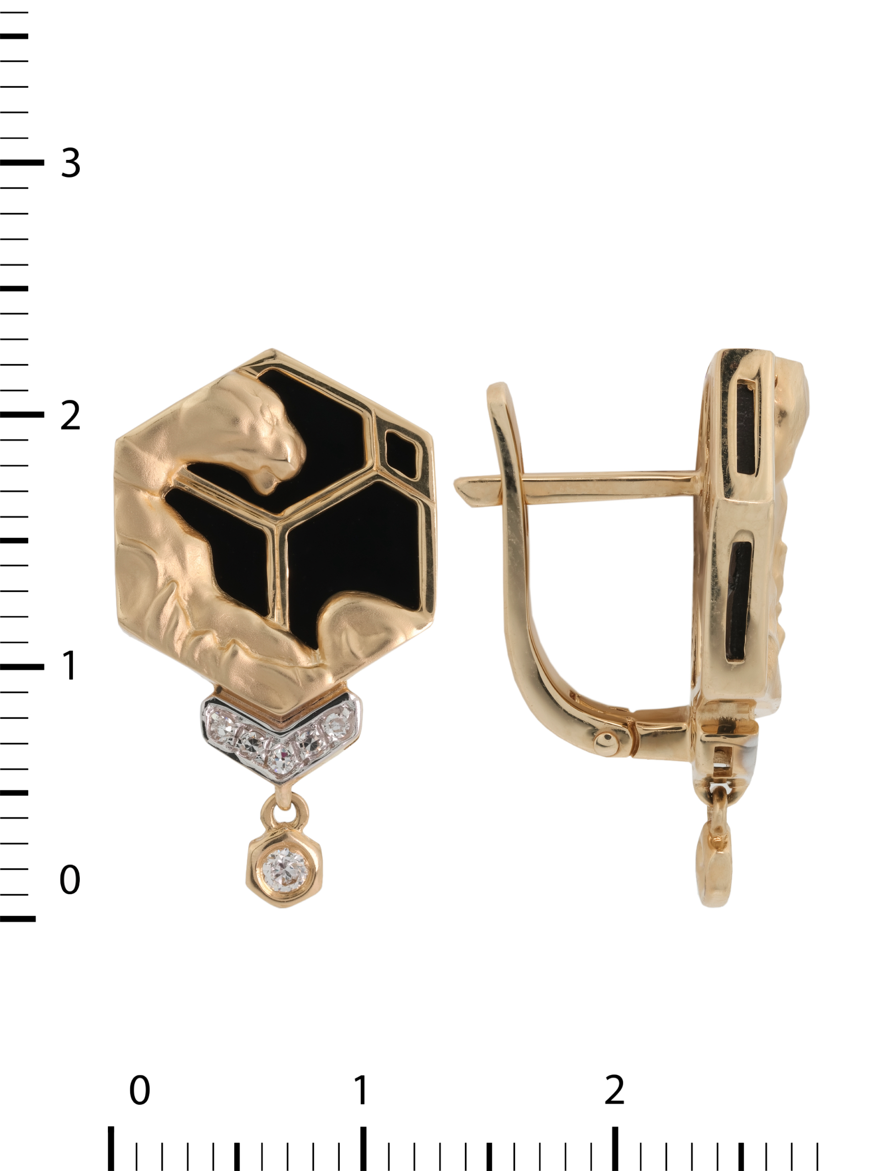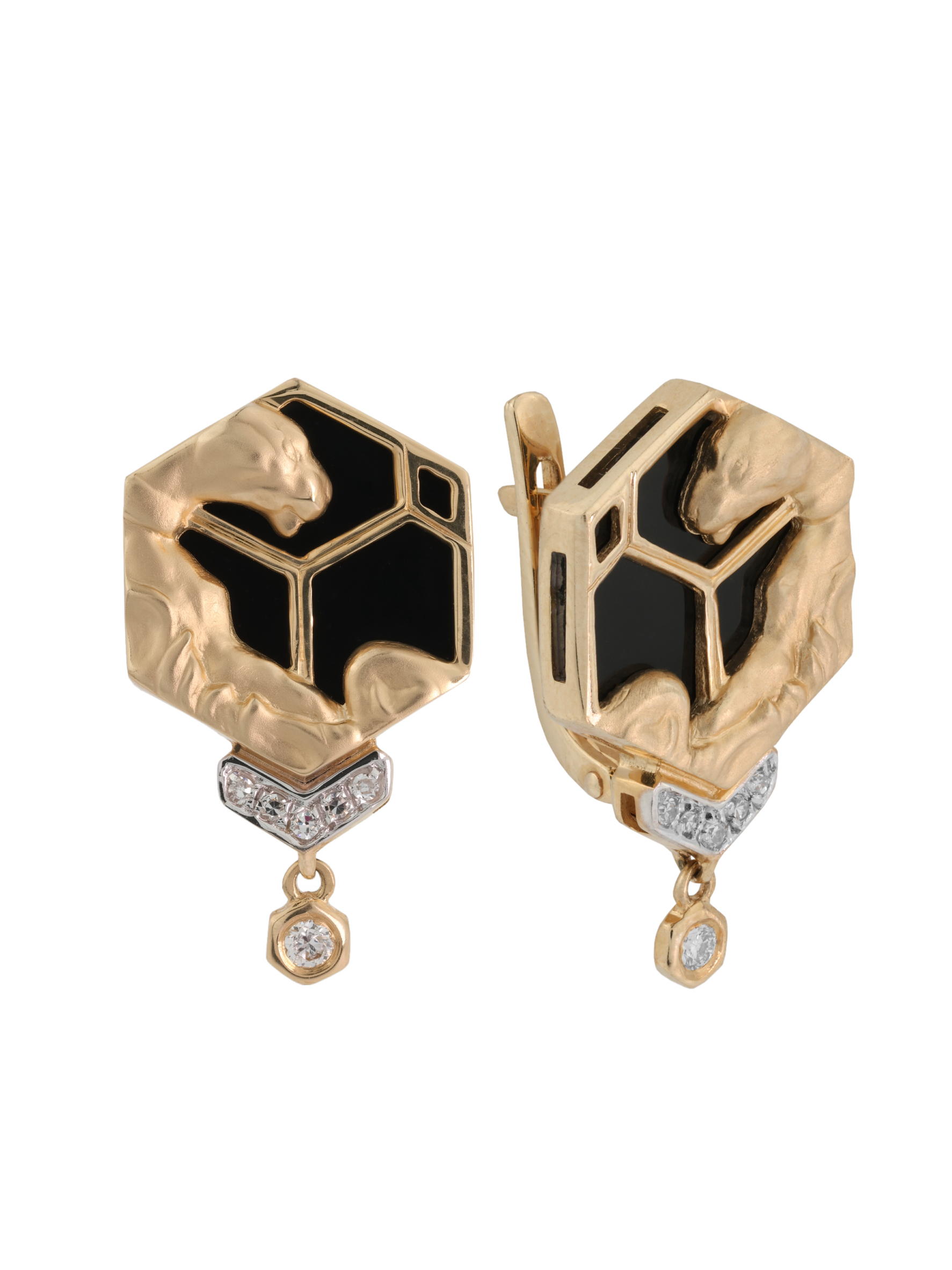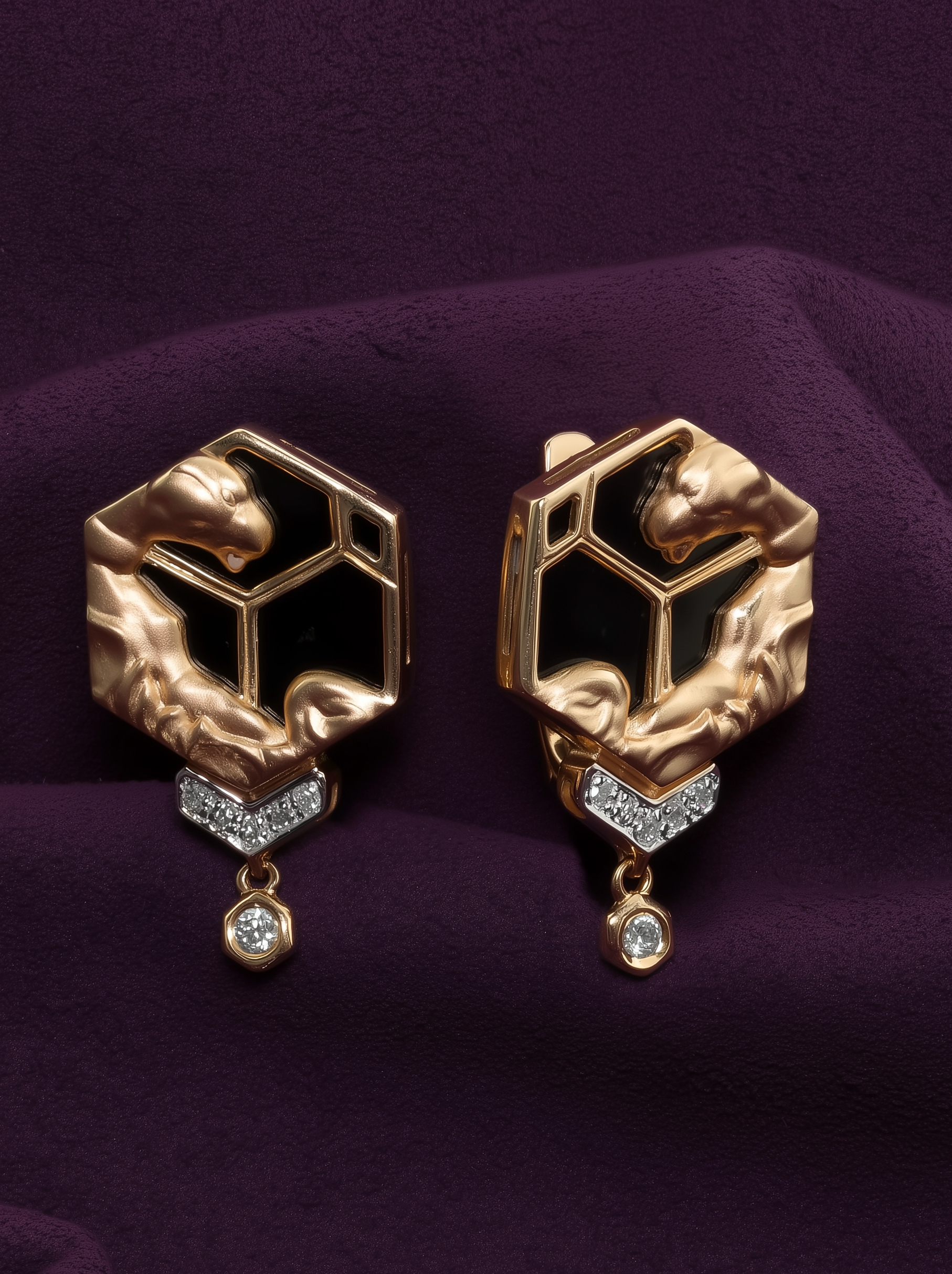 Серьги из красного золота 585 пробы из коллекции De Luxe — Гексагон представляют собой воплощение дерзкого стиля и ювелирного мастерства. В дизайне украшения центральное место занимает анималистичный мотив в виде грациозных пантер, которые изящно обрамляют вставку из глубокого черного оникса. Геометрическая форма шестигранника придает изделию современный и узнаваемый облик, объединяя строгость линий и природную эстетику.