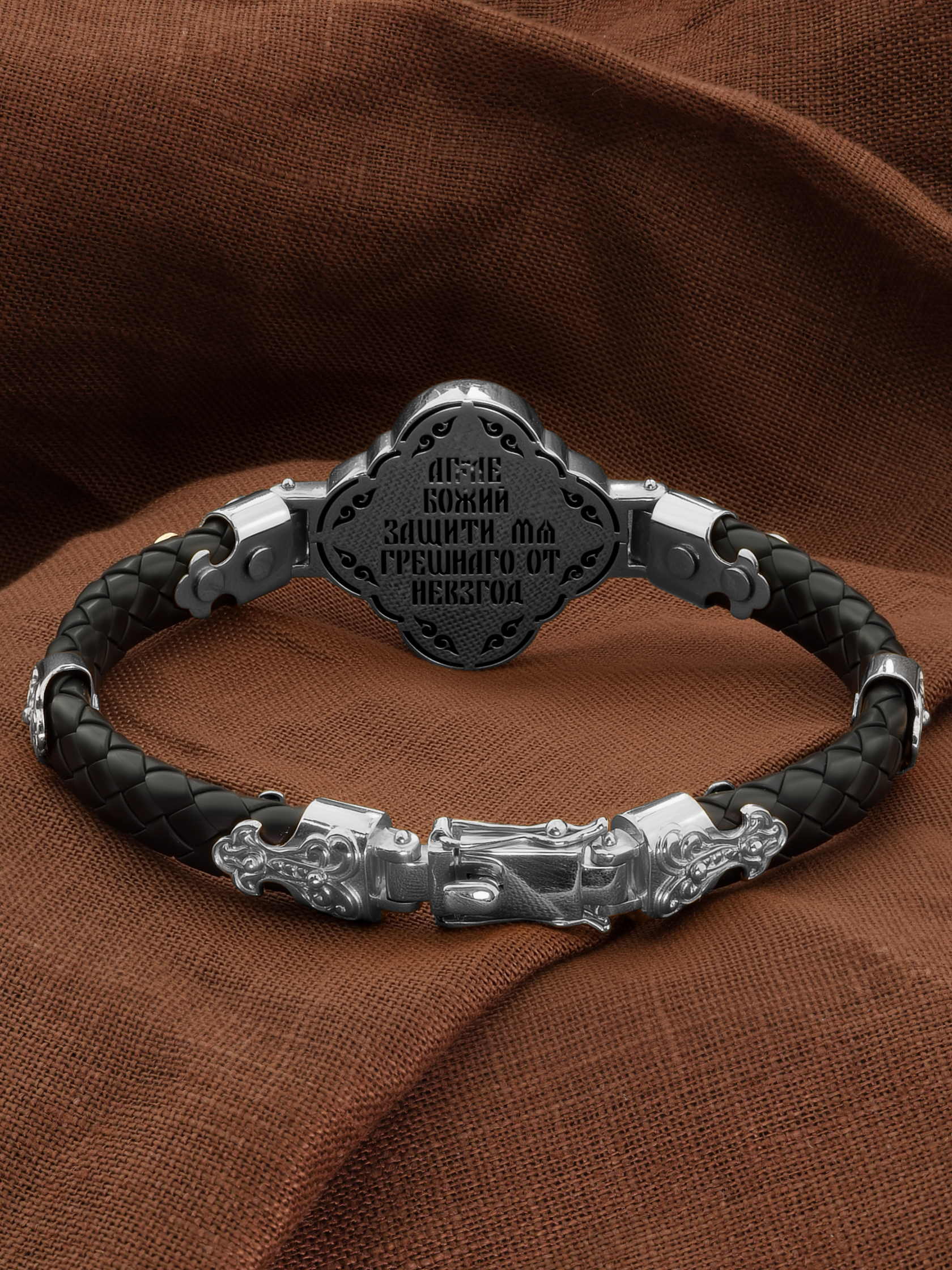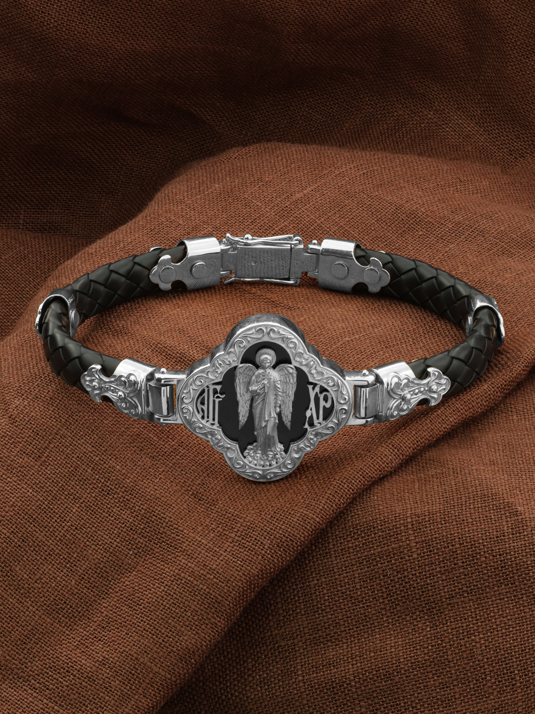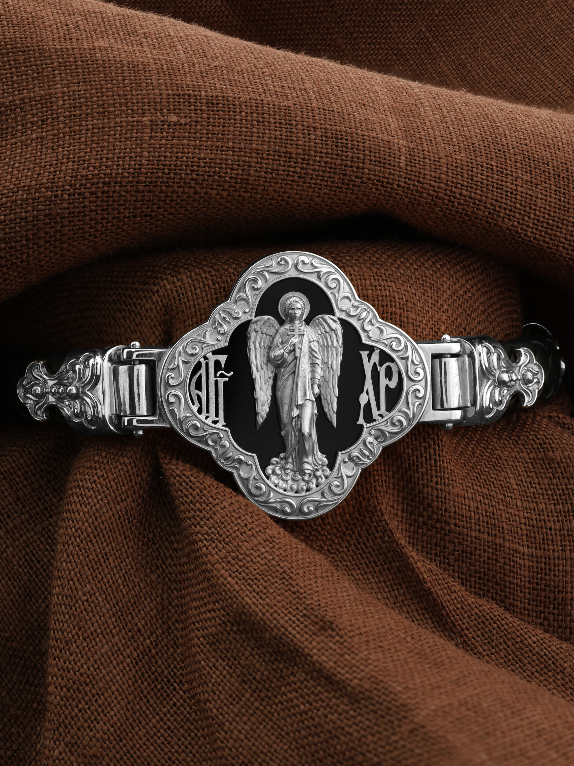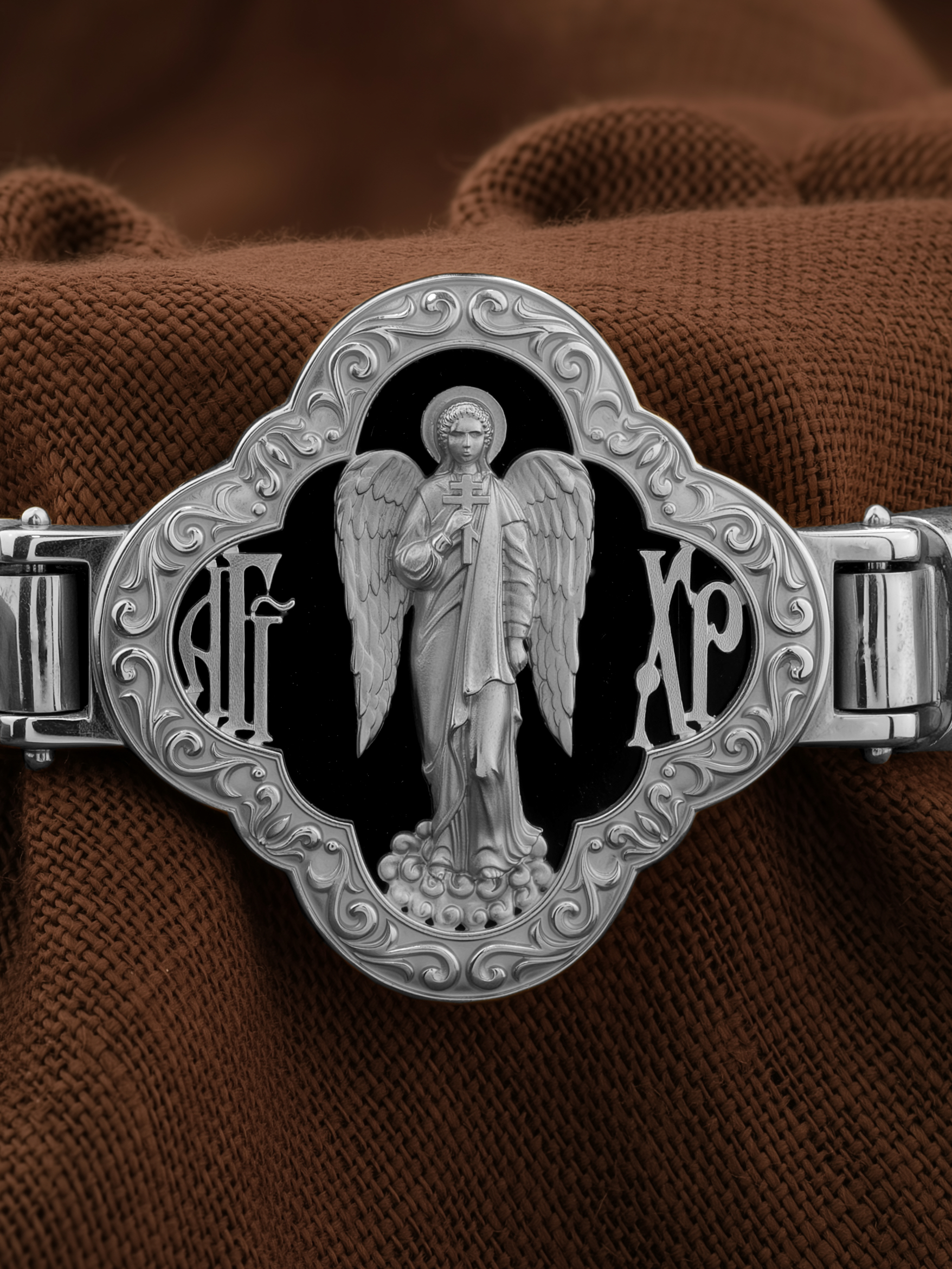 На лицевой стороне основного звена изображён Святой Ангел-Хранитель. Ангел Хранитель — это Ангел приставляемый Богом к человеку при крещении для охраны и помощи в добрых делах. Он невидимо находится при человеке на протяжении всей его жизни, если человек сохраняет в себе любовь к Богу и истинную веру перед Ним. Ангел-Xранитель делают для нас все, что служит к истинному нашему благу и спасению. Невидимо пребывая при нас постоянно, он, руководствуя нас ко спасению, не только по нашему желанию таинственно наставляет нас на все доброе и полезное, не только возносит наши молитвы к Богу, но еще и сам от себя охраняют и защищают нас от врагов видимых и невидимых и ходатайствует за нас пред Богом. Ангел-Хранитель так любит нас, как никто на земле любить не может. Ангел-Хранитель — присный друг наш, незримый тихий собеседник, пресладостный утешитель. Одного лишь каждому из нас он желает — спасения души; к этому он направляет все свои заботы. И если видит нас также заботящимися о спасении, радуется, если же видит нас пребывающими в нерадении о душе своей, скорбит.