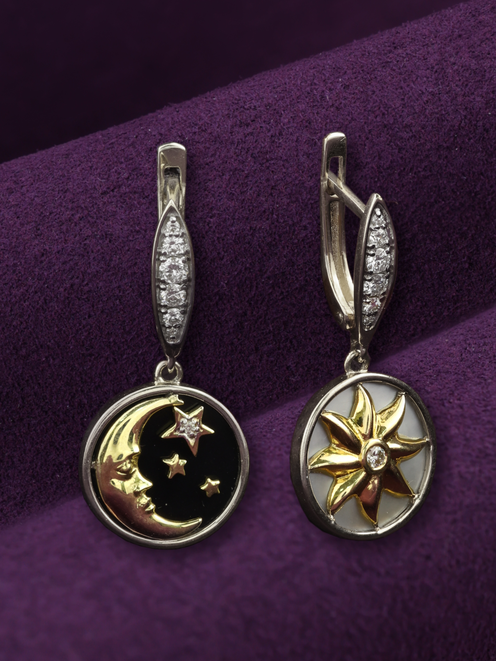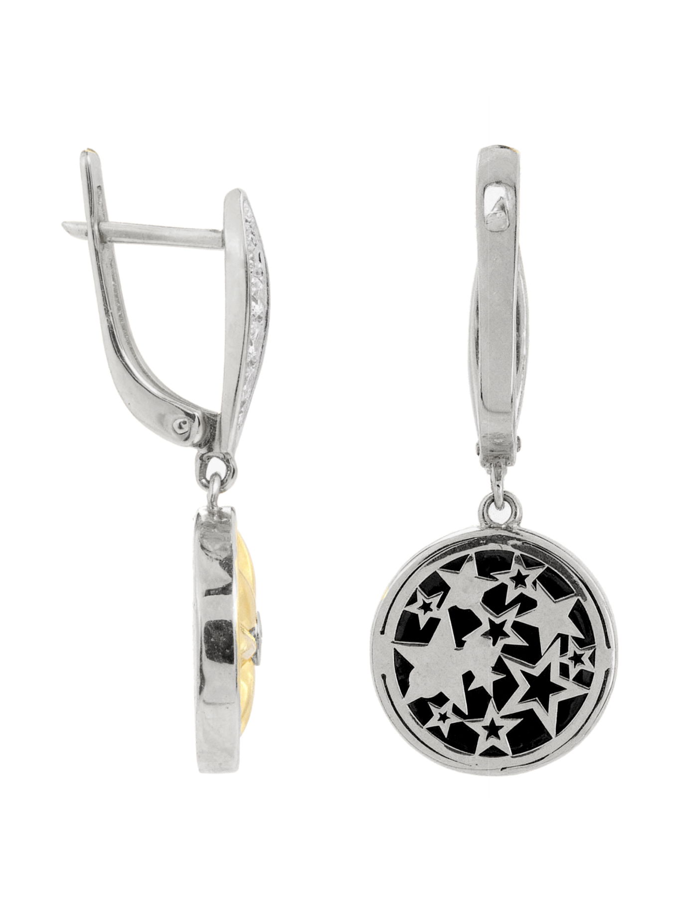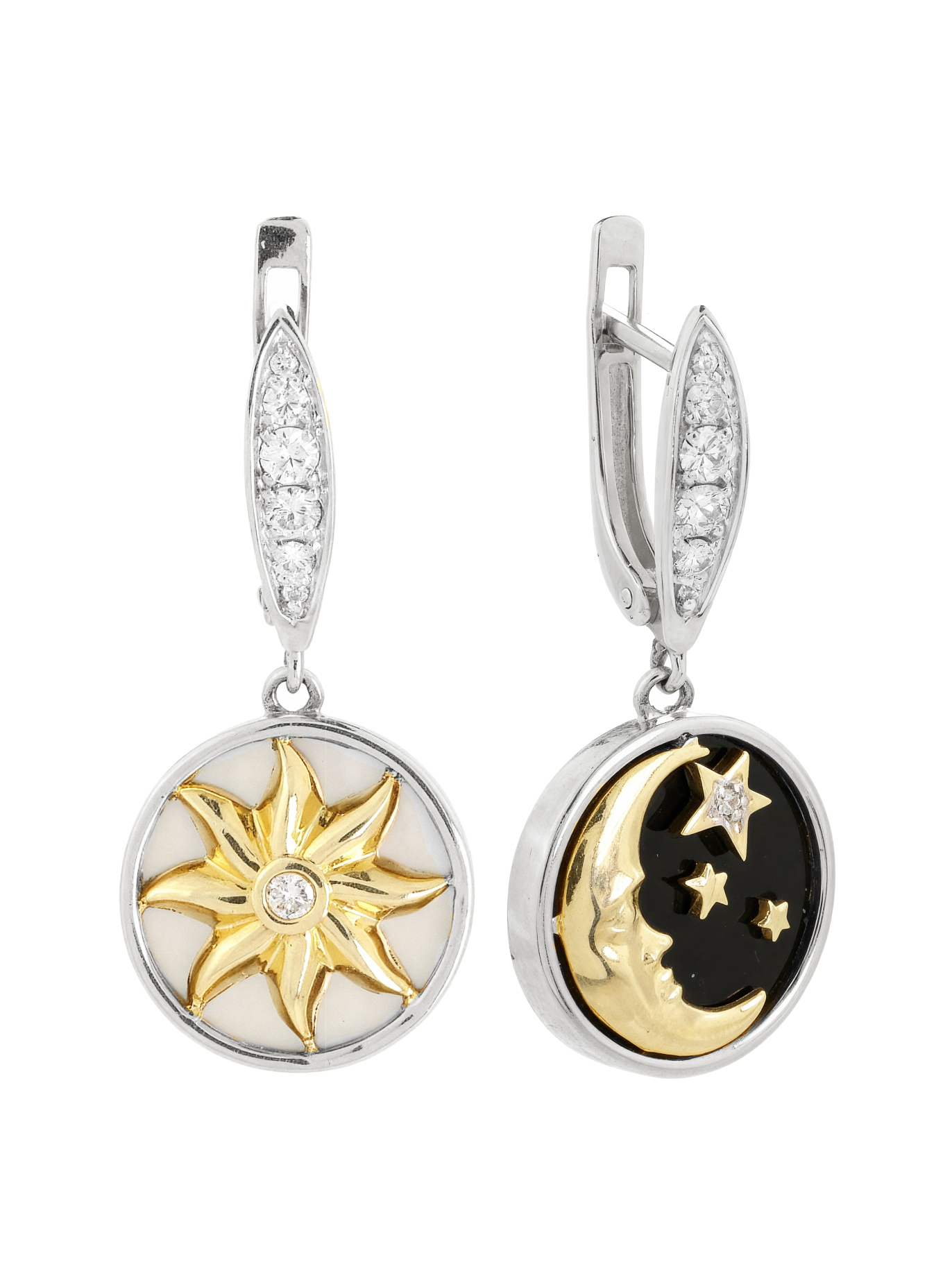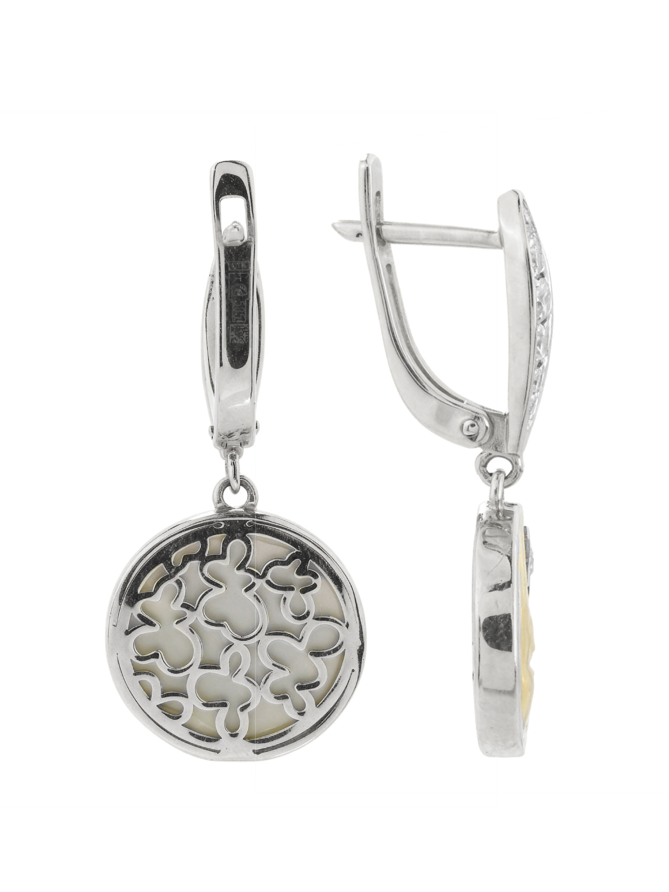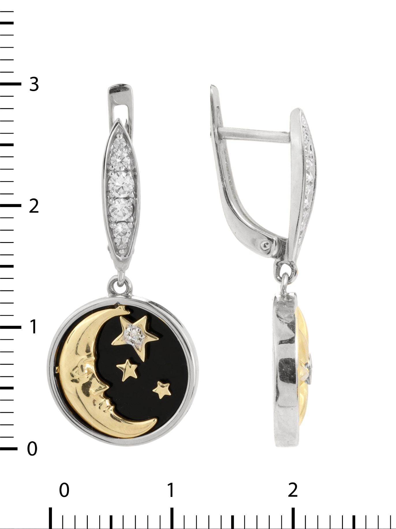 Серьги из белого золота 585 пробы c бриллиантами, ониксом и перламутром
