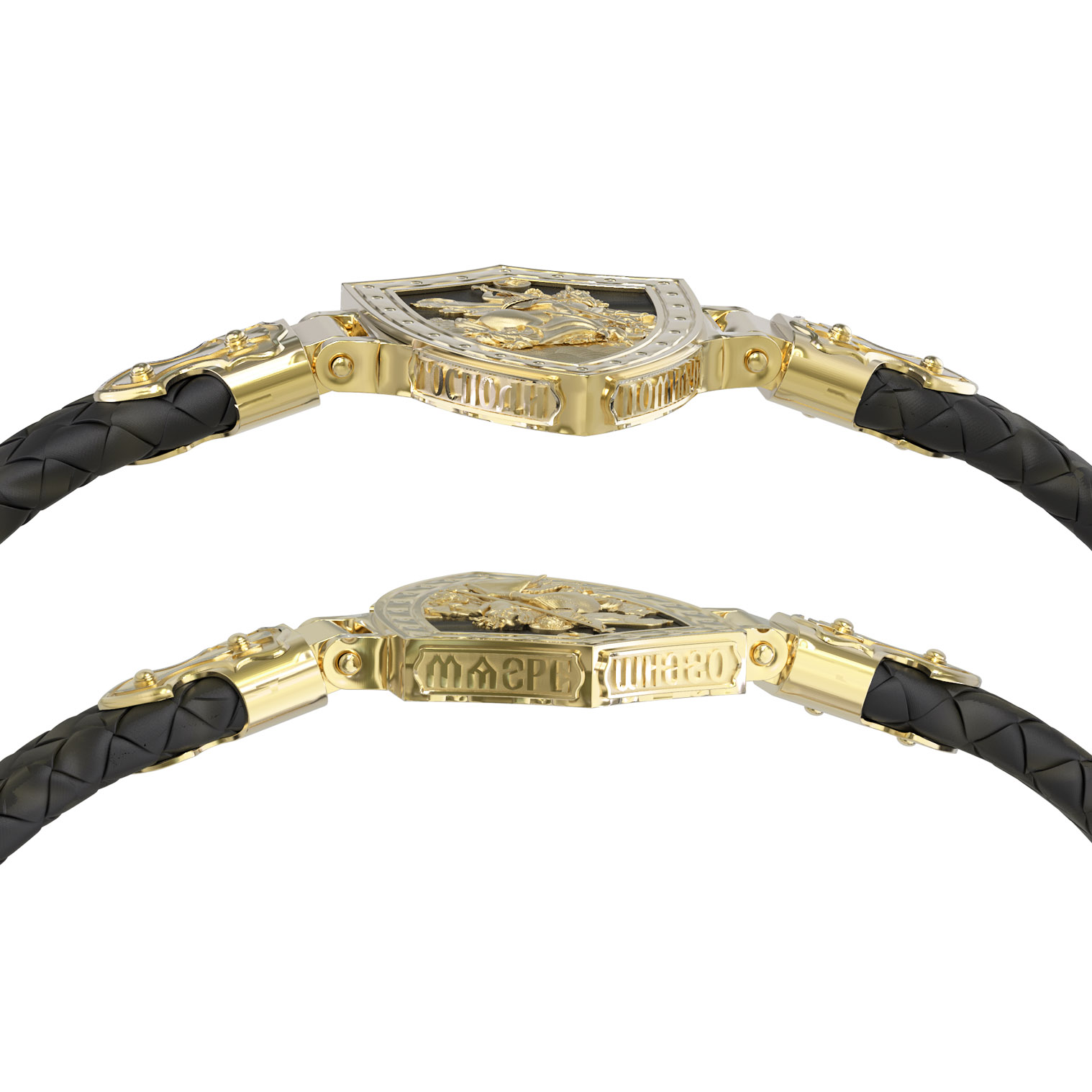 Основой композиции лицевой стороны браслета является изображение Святого Великомученика Георгия Победоносца — одного из самых почитаемых и удивительных святых. Георгий родился в Каппадокии (Малая Азия) в семье богатых и знатных горожан. Юношей поступил на службу к римскому императору Диоклетиану, за отличное знание военного дела и проявленную в боях и походах храбрость был приближен к императору и удостоен высокого воинского звания. Во время начавшихся гонений на христиан, перешел на сторону гонимых и, отвергнув человеческий страх, стал ярым проповедником учения Христа. Мучители подвергли опального воеводу жесточайшим восьмидневным пыткам и казнили его (обезглавили) в возрасте около тридцати лет в 303 году. На Руси он известен как Юрий или Егорий, заступник для верующих, чья жизнь имеет какое-либо отношение к военным делам, помощник в крестьянском труде. Браслет сделан в виде воинского щита. На нем Георгий изображен как воитель, сидящий на вздыбленном коне и поражающий копьем огнедышащего змея. Над образом изображена благословляющая Божия десница. Змей символизирует собою сатанинские силы. Молитвами вознесенными к Всевышнему и своей непреклонной верой он смог одолеть чудовище. Святой убил змея, спас царскую дочь, принесенную в жертву, и жителей города, их души от влияния дьявола, породив в них надежду и веру в Господа, призывая людей принять христианскую веру. На торце изделия помещена молитва: «Господи, помилуй мя грешного».