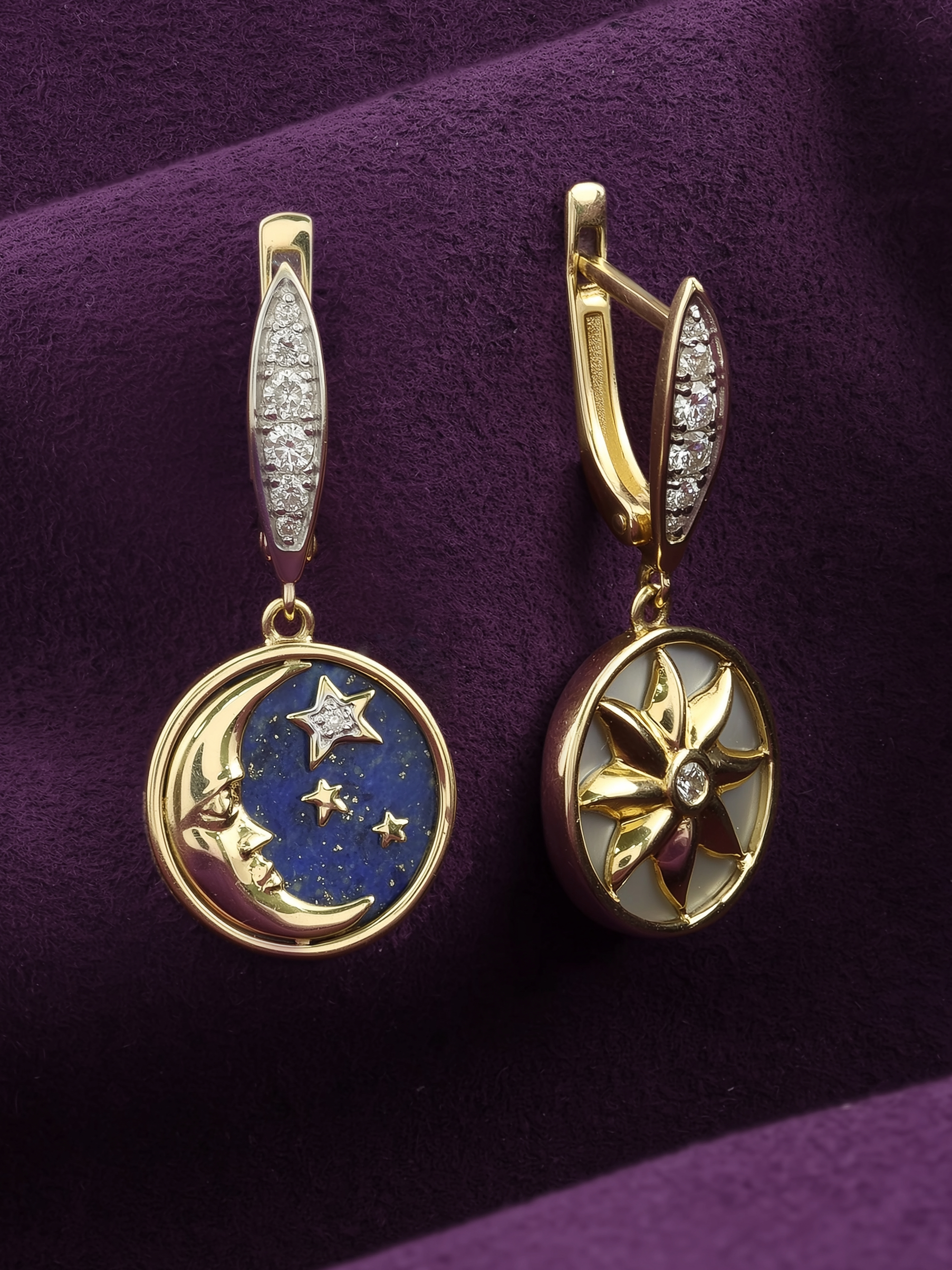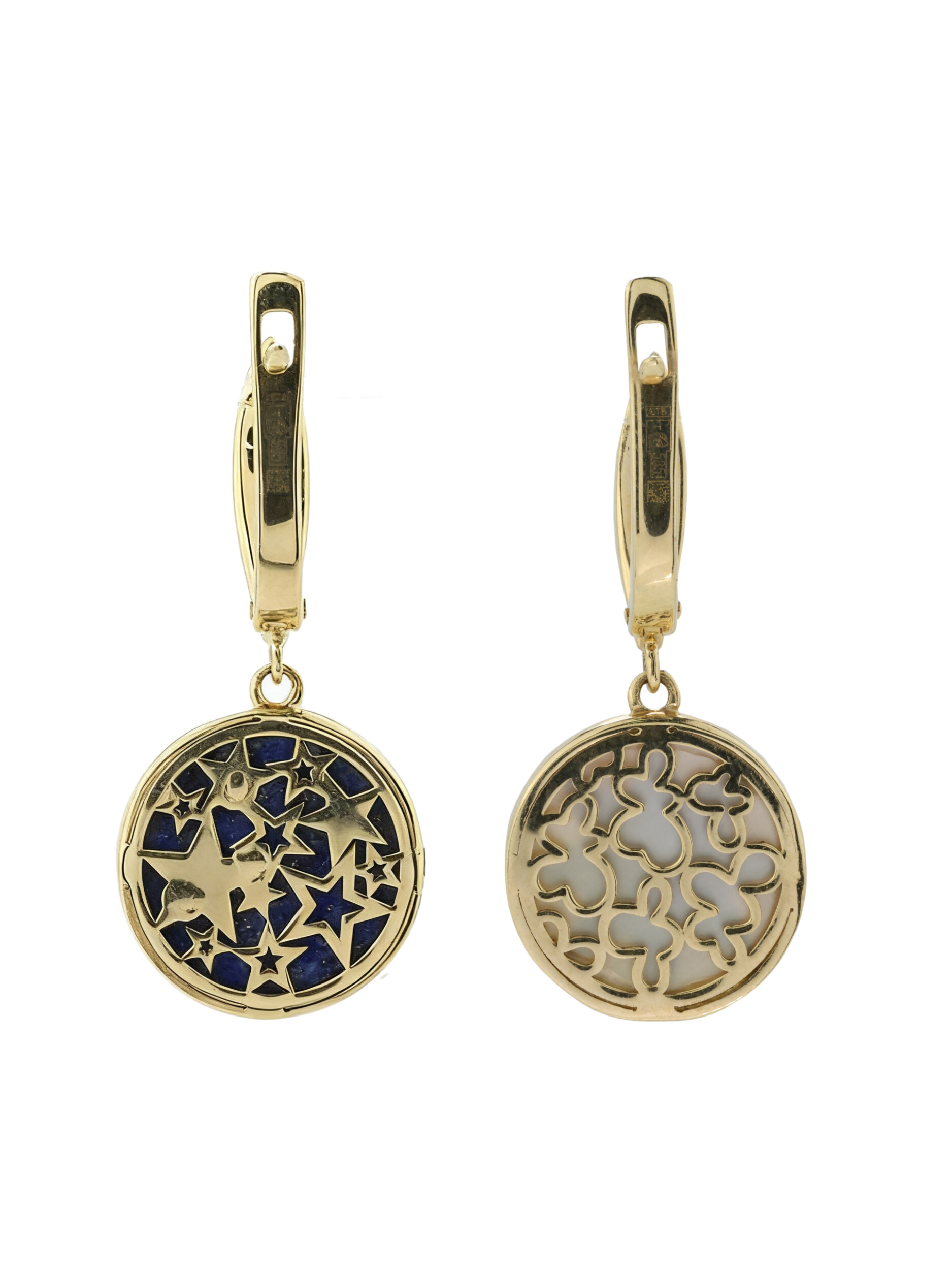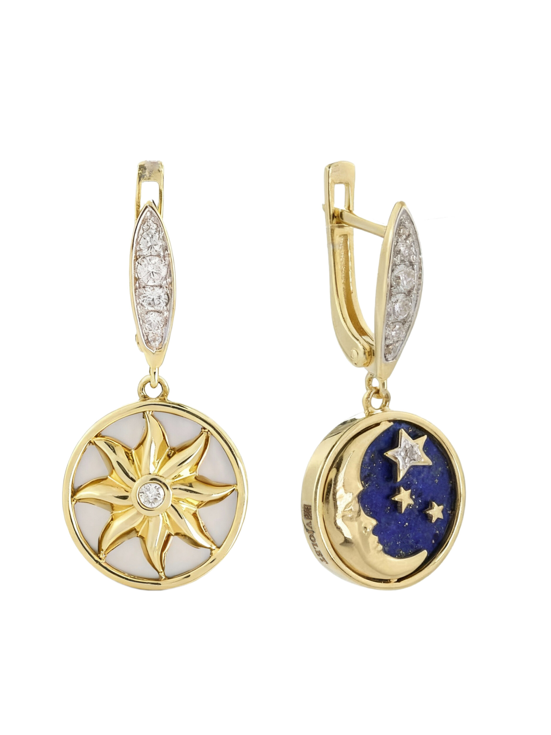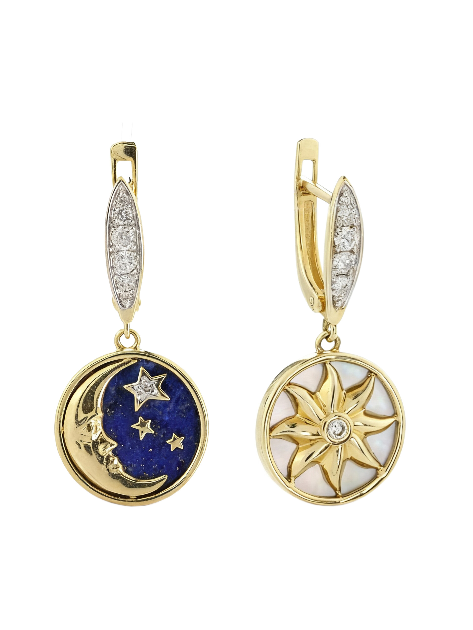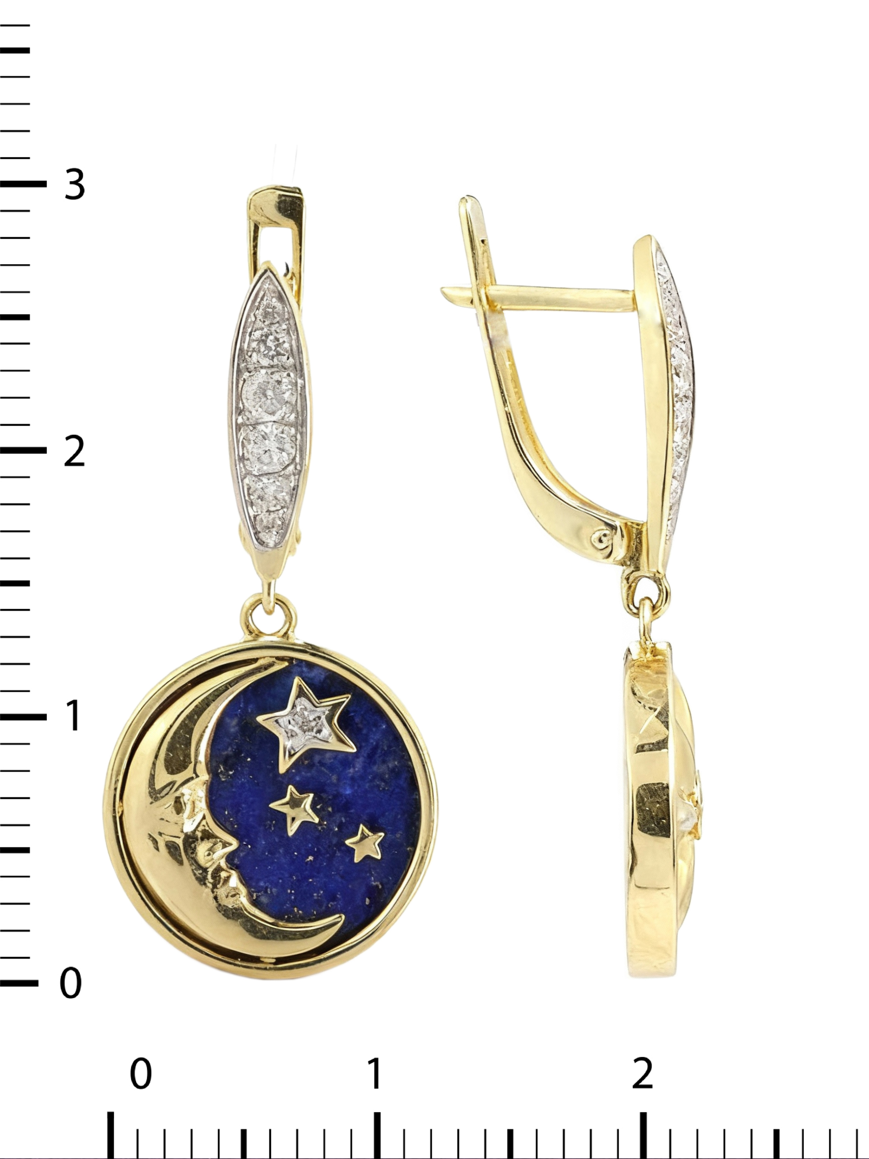 Серьги из лимонного золота 585 пробы c бриллиантами, лазуритом и перламутром
