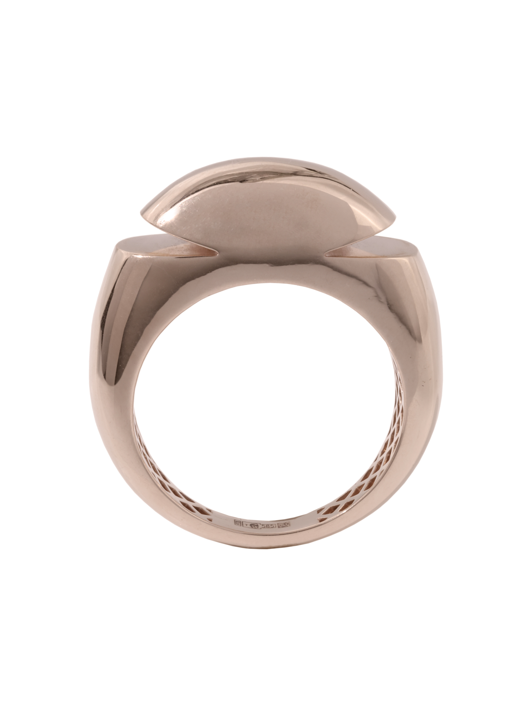 Модель выполнена из качественного красного золота 585 пробы. Конструкция кольца отличается интересным дизайнерским решением: массивная, объемная верхняя часть плавно переходит в утонченное основание с ажурной внутренней фактурой, что обеспечивает комфортную посадку на пальце. Данное изделие является универсальным аксессуаром, который одинаково гармонично дополнит как женский, так и мужской гардероб.