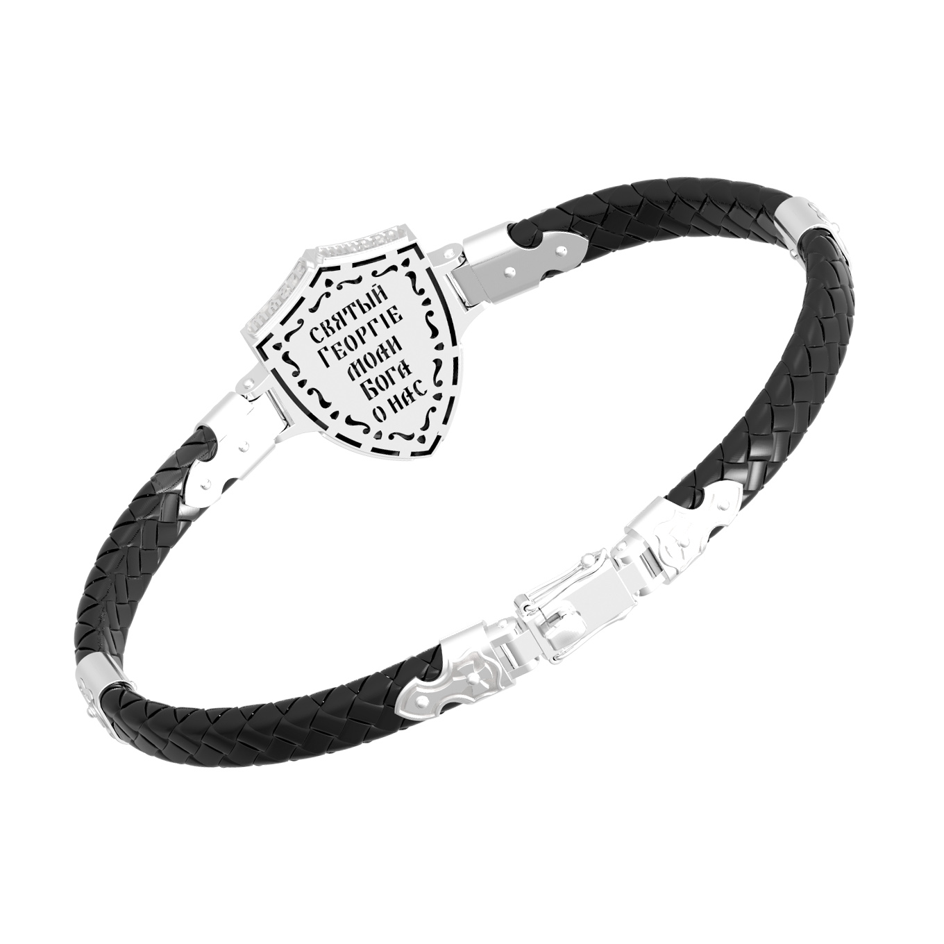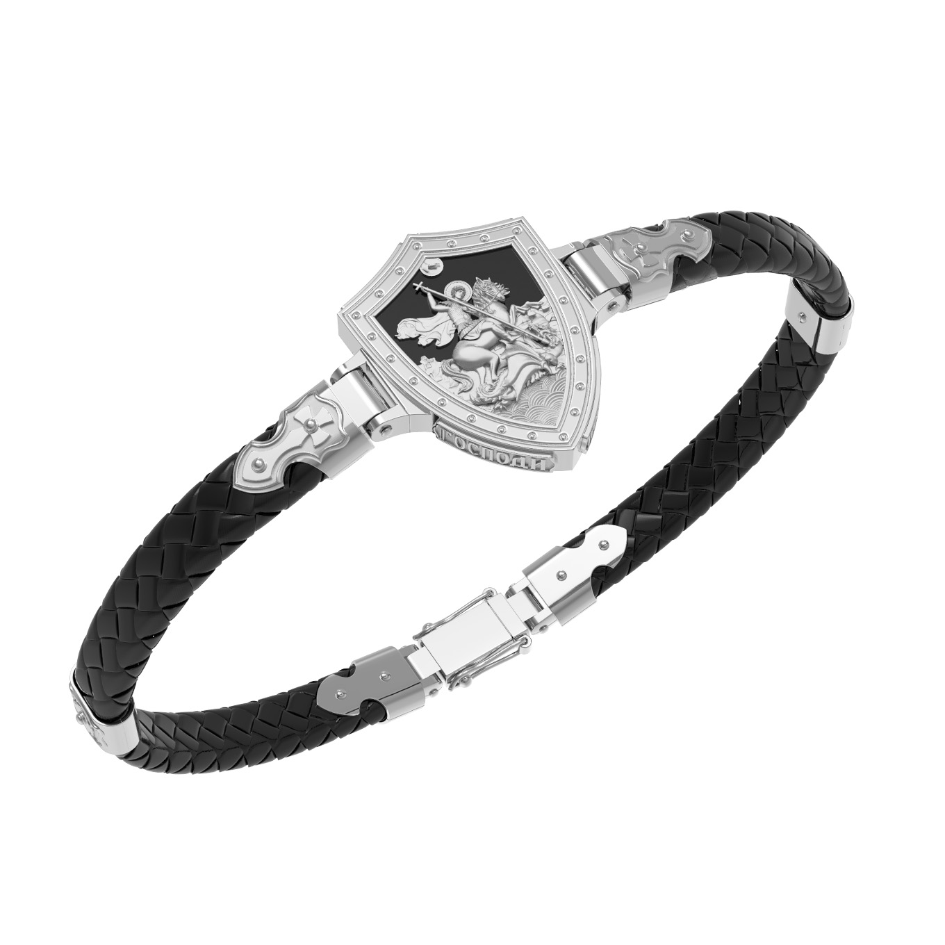 Основой композиции лицевой стороны браслета является изображение Святого Великомученика Георгия Победоносца — одного из самых почитаемых и удивительных святых. Георгий родился в Каппадокии (Малая Азия) в семье богатых и знатных горожан. Юношей поступил на службу к римскому императору Диоклетиану, за отличное знание военного дела и проявленную в боях и походах храбрость был приближен к императору и удостоен высокого воинского звания. Во время начавшихся гонений на христиан, перешел на сторону гонимых и, отвергнув человеческий страх, стал ярым проповедником учения Христа. Мучители подвергли опального воеводу жесточайшим восьмидневным пыткам и казнили его (обезглавили) в возрасте около тридцати лет в 303 году. На Руси он известен как Юрий или Егорий, заступник для верующих, чья жизнь имеет какое-либо отношение к военным делам, помощник в крестьянском труде. Браслет сделан в виде воинского щита. На нем Георгий изображен как воитель, сидящий на вздыбленном коне и поражающий копьем огнедышащего змея. Над образом изображена благословляющая Божия десница. Змей символизирует собою сатанинские силы. Молитвами вознесенными к Всевышнему и своей непреклонной верой он смог одолеть чудовище. Святой убил змея, спас царскую дочь, принесенную в жертву, и жителей города, их души от влияния дьявола, породив в них надежду и веру в Господа, призывая людей принять христианскую веру. На торце изделия помещена молитва: «Господи, помилуй мя грешного».
