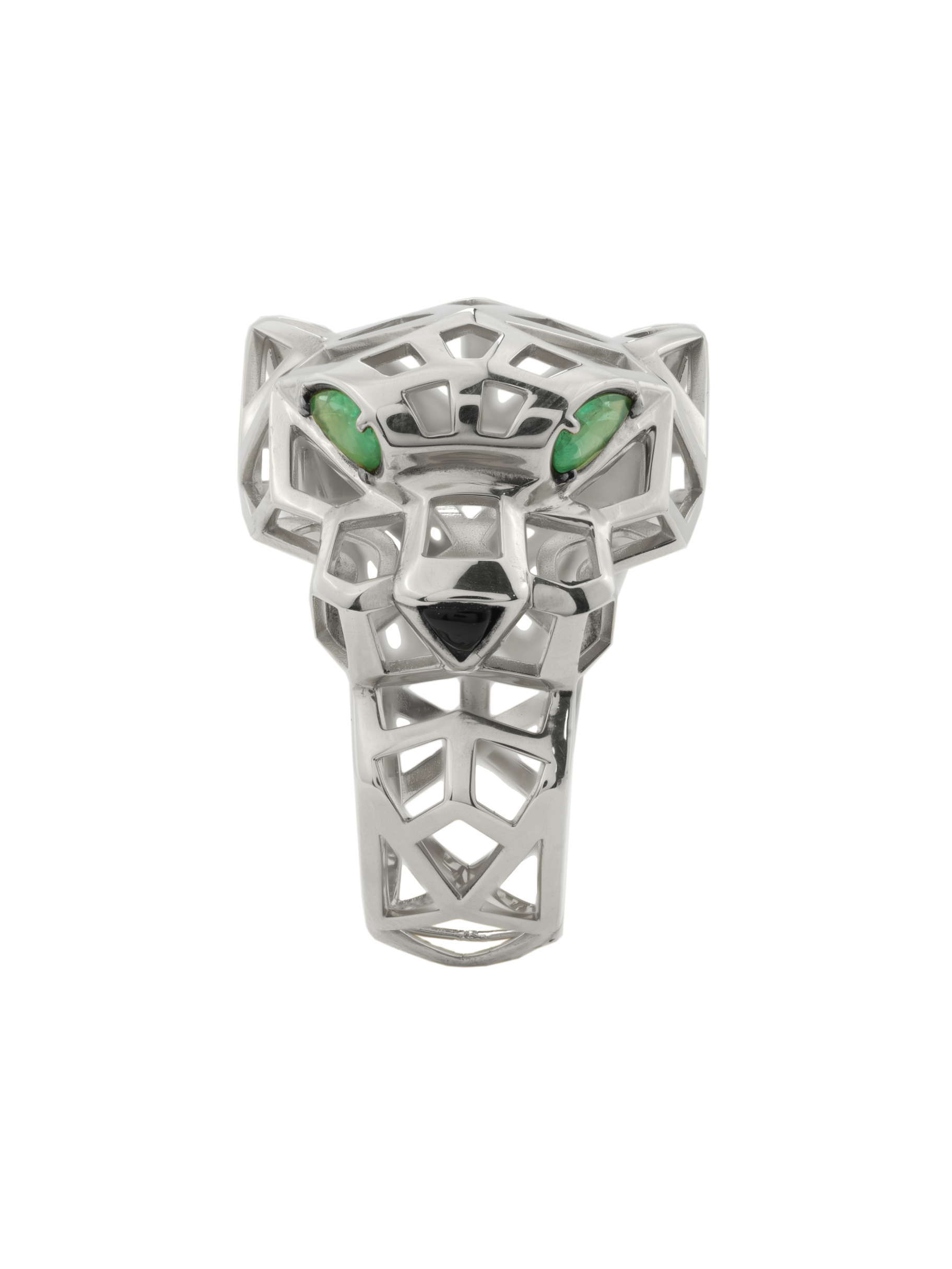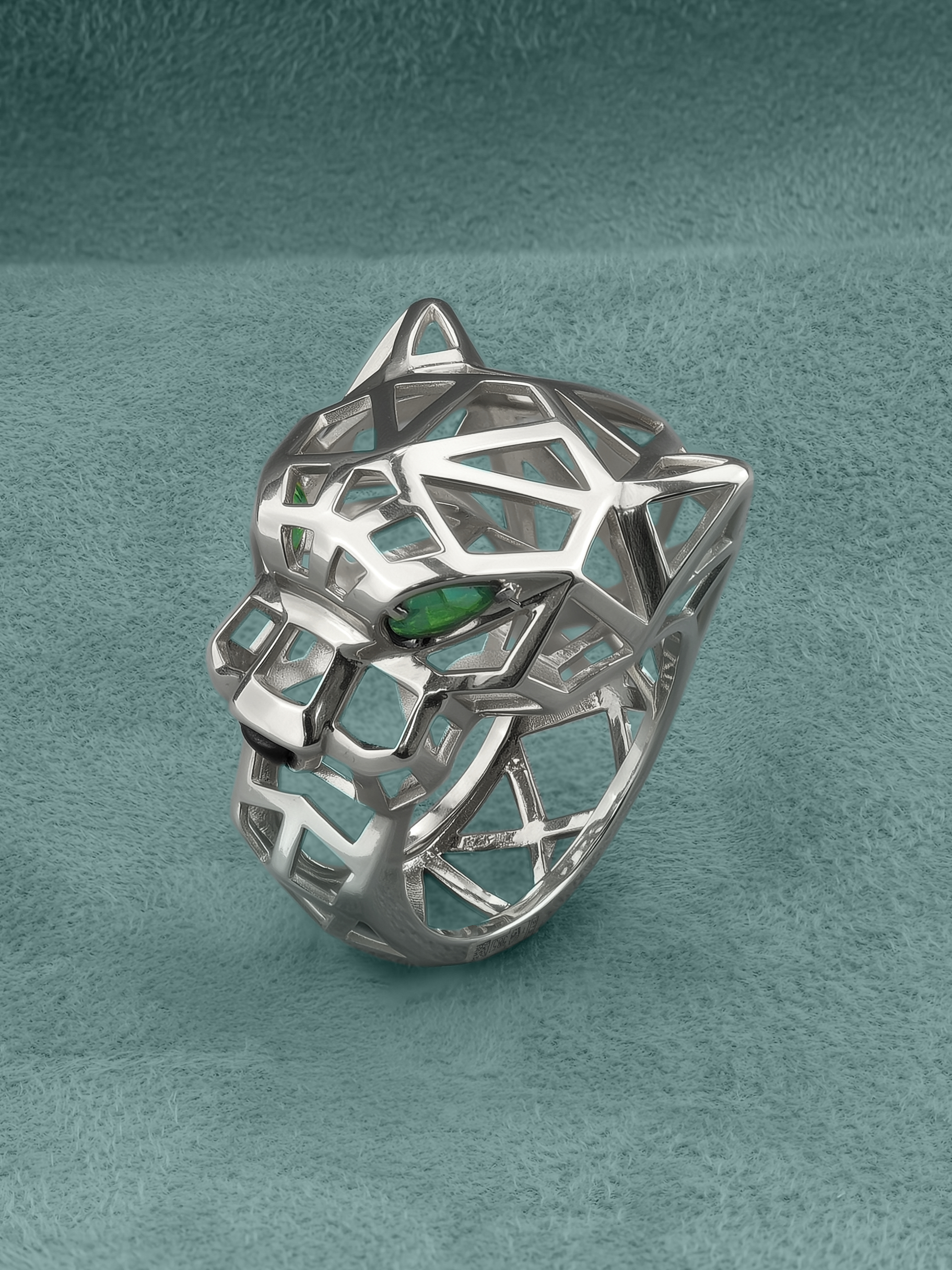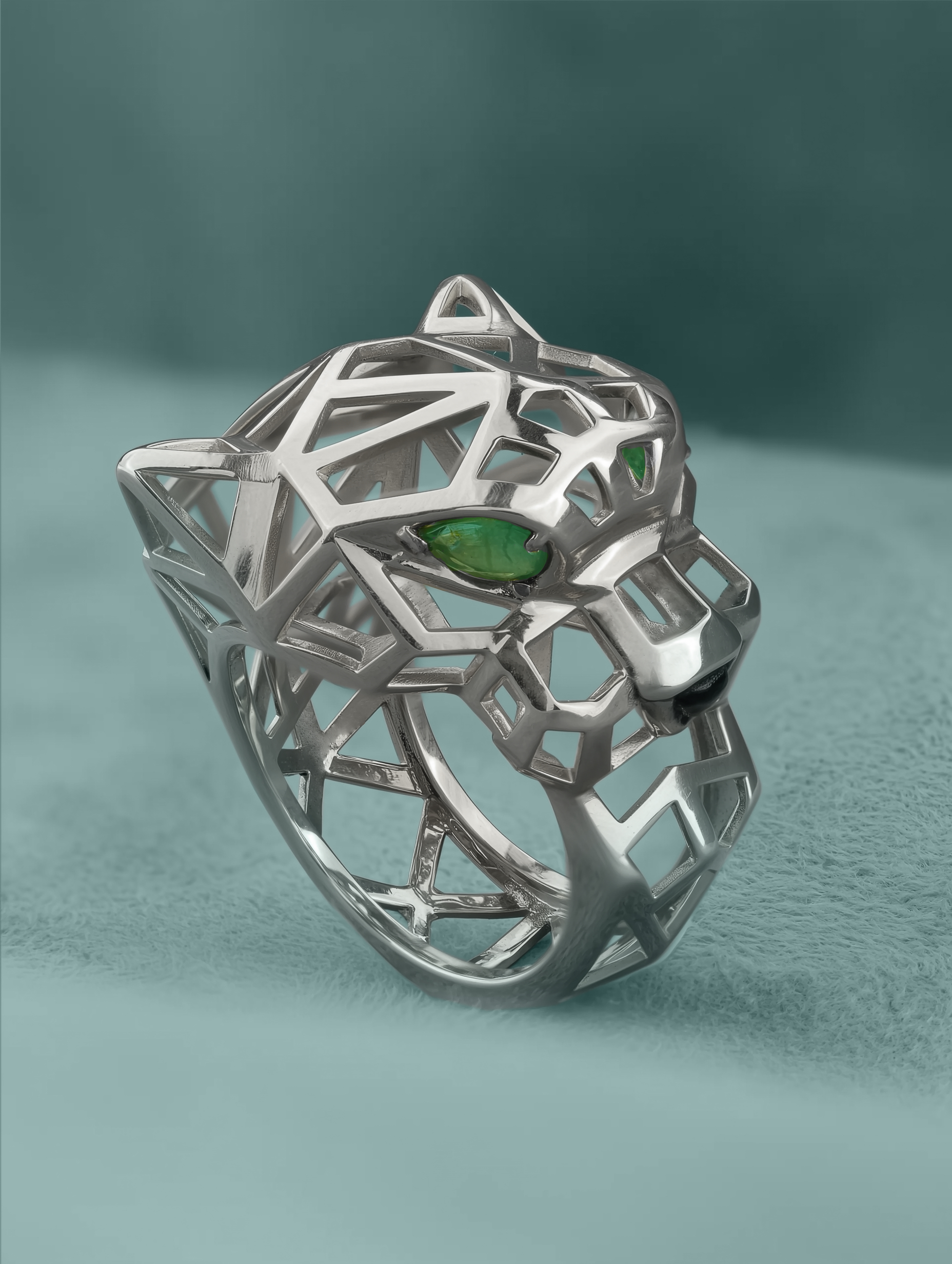 В дизайне гармонично сочетаются благородный белый металл и драгоценные вставки. Взгляд хищника притягивает глубокий зеленый цвет двух изумрудов огранки груша. Деталь носа выполнена из контрастного черного оникса треугольной формы. Всего в изделии использовано 3 вставки, которые добавляют акценты и делают образ выразительным. Благодаря унисекс-дизайну в стилистике пантеры и пумы, кольцо подойдет как женщинам, так и мужчинам, желающим подчеркнуть свою индивидуальность.