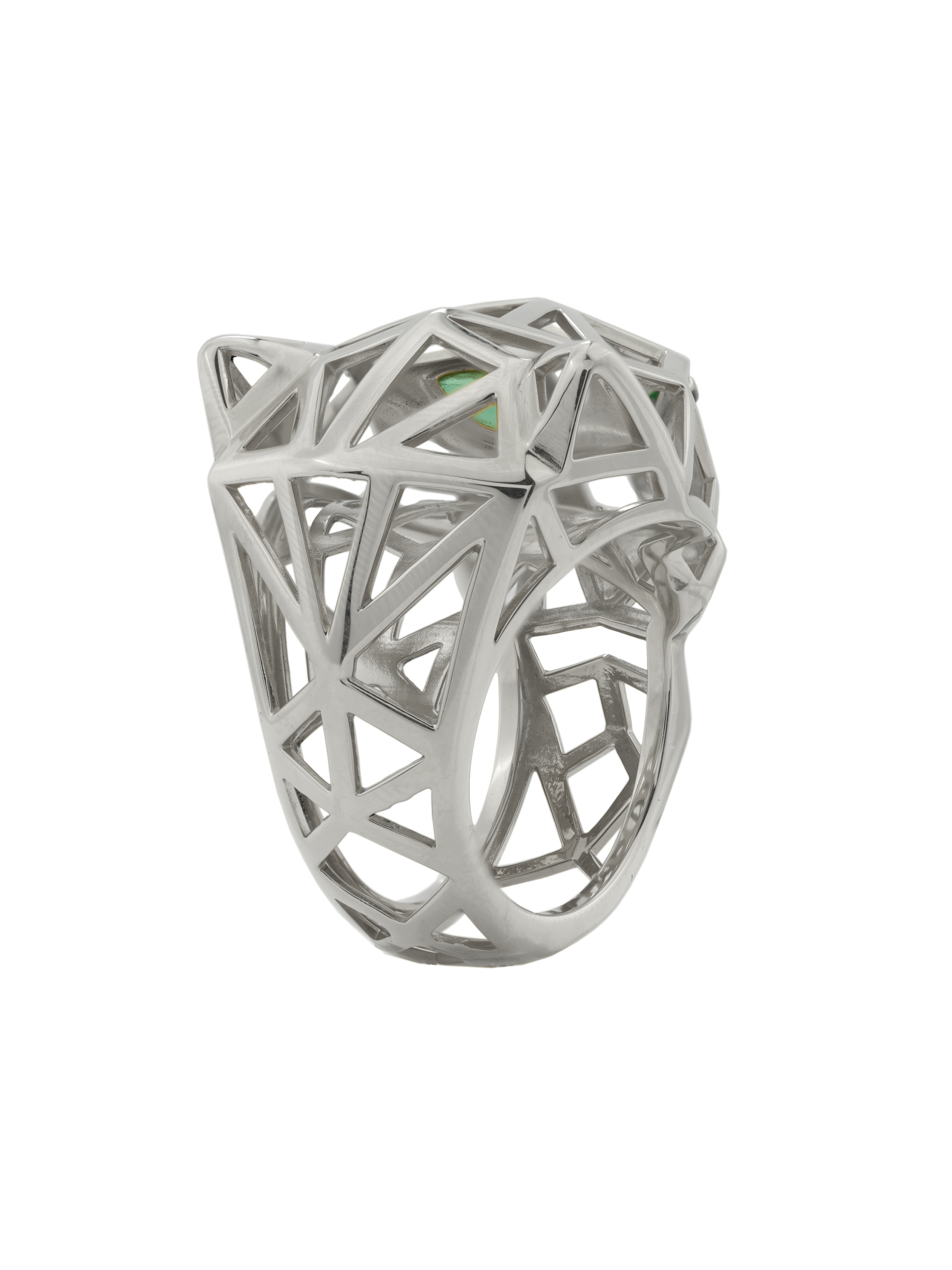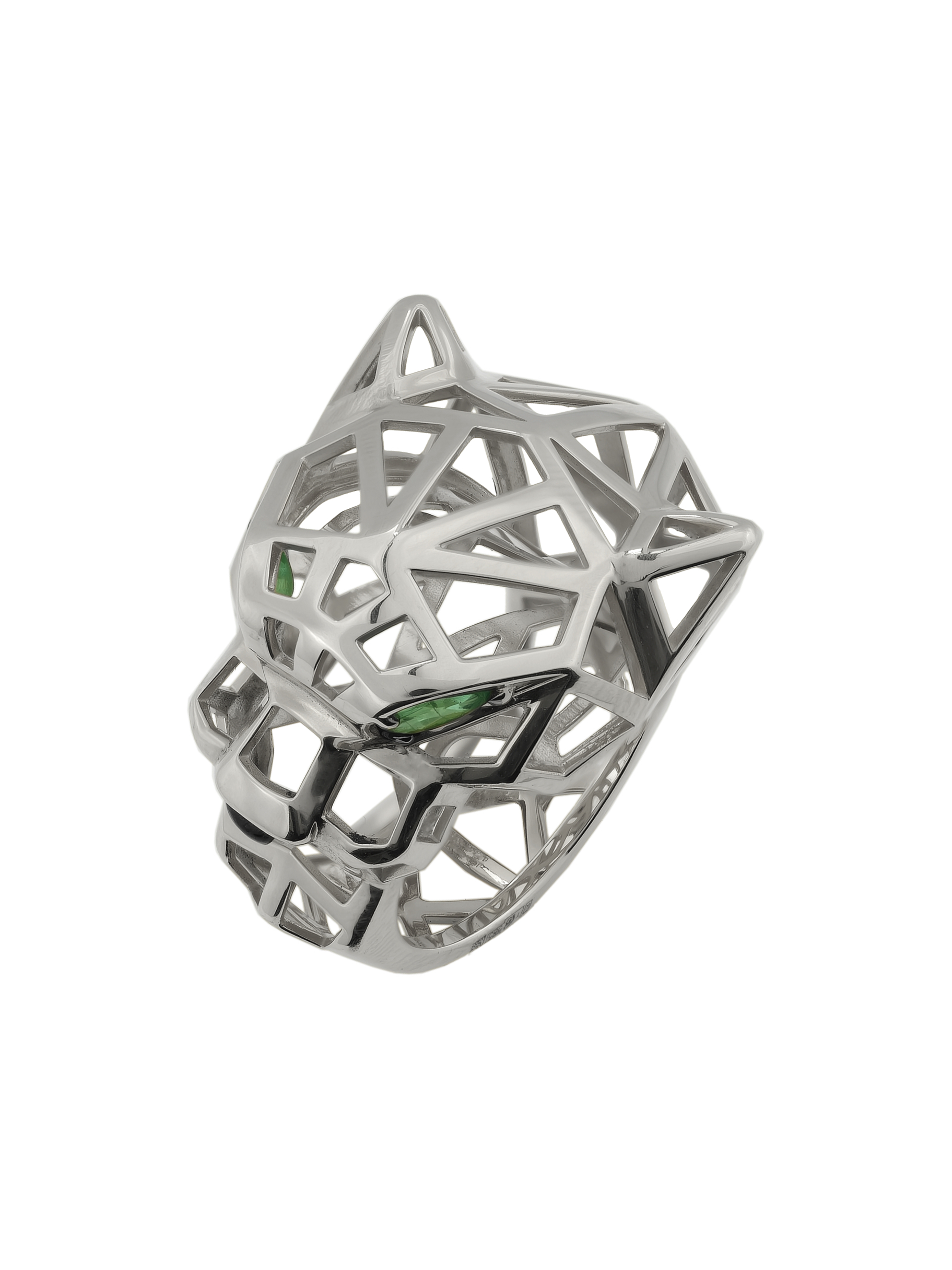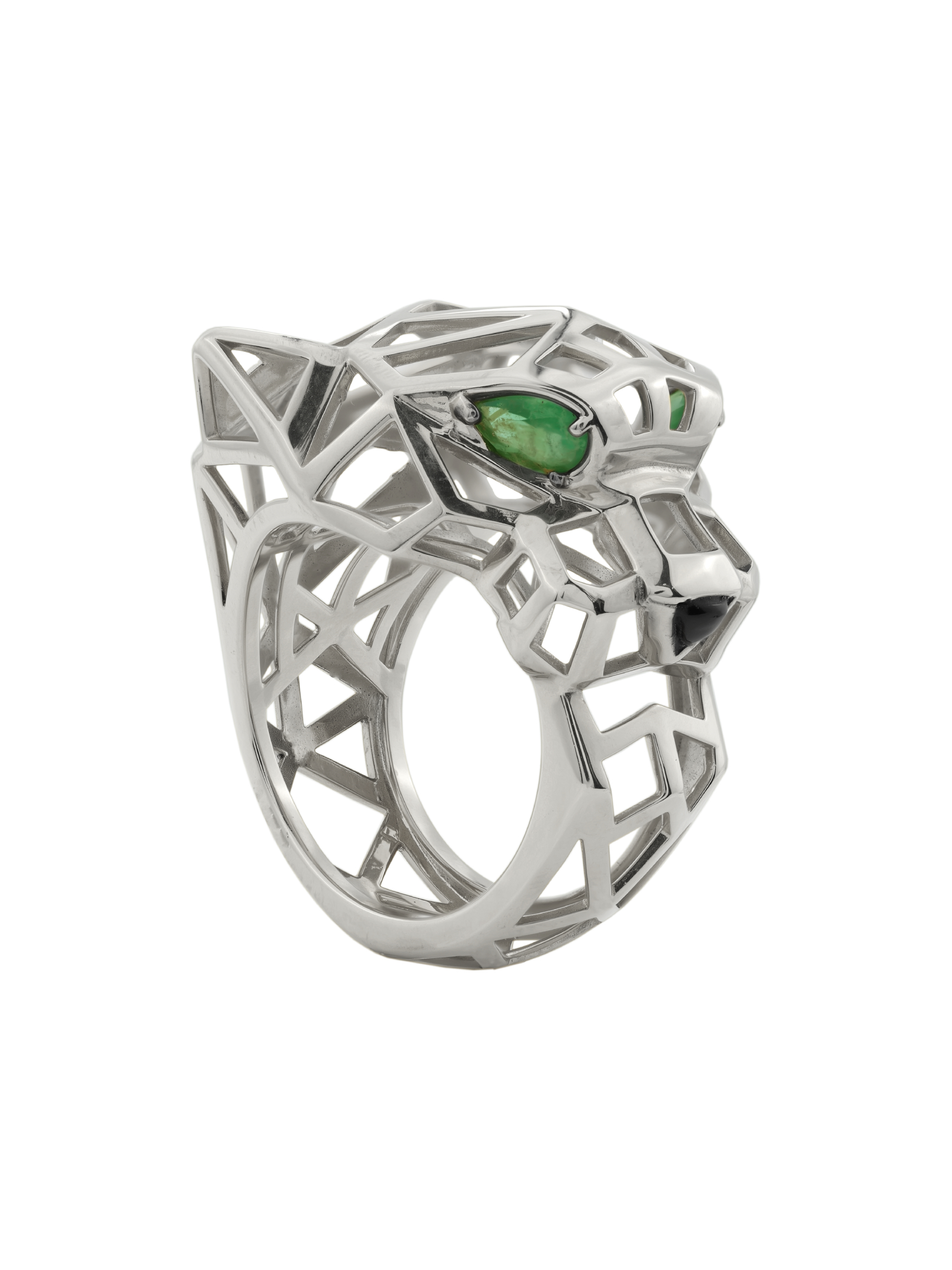 В дизайне гармонично сочетаются благородный белый металл и драгоценные вставки. Взгляд хищника притягивает глубокий зеленый цвет двух изумрудов огранки груша. Деталь носа выполнена из контрастного черного оникса треугольной формы. Всего в изделии использовано 3 вставки, которые добавляют акценты и делают образ выразительным. Благодаря унисекс-дизайну в стилистике пантеры и пумы, кольцо подойдет как женщинам, так и мужчинам, желающим подчеркнуть свою индивидуальность.